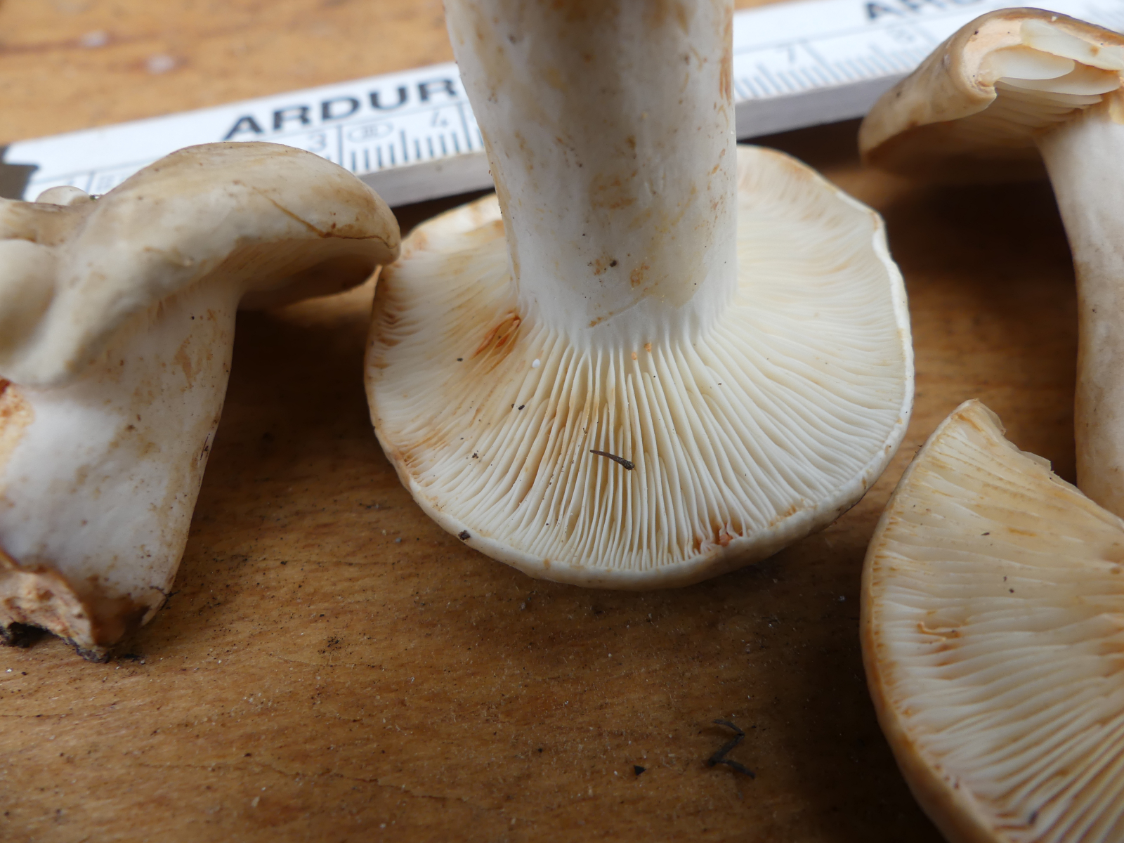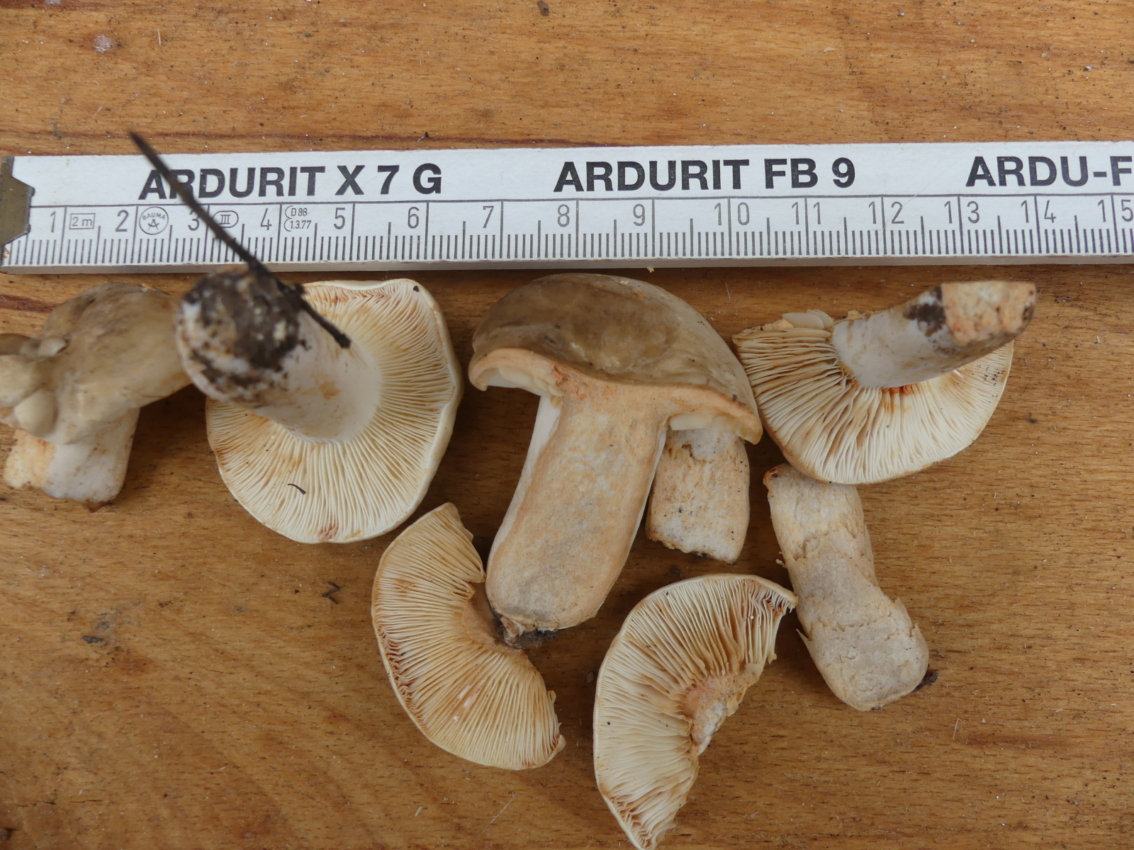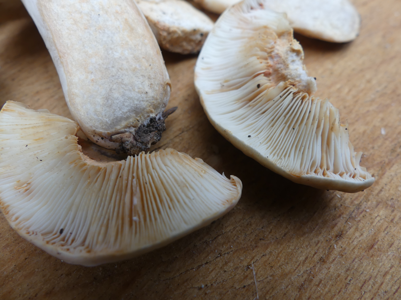Jetzt zum Anfragepilz. L. acer/acris ist einer, dessen Milch und Fleisch augenblicklich, d. h. in Sekundenschnelle mit "Whow-Effekt" bonbonrosa verfärben. Den kann man hier also ausschließen. Mein erster Verdacht wäre L. azonites, der hat einen ziemlich blassen Hut und Stiel, das Fleisch verfärbt sich erst innerhalb ein paar Minuten braunrötlich, die Milch selber (isoliert vom Fleisch) bleibt weiß, und er kommt im Laubwald vor.