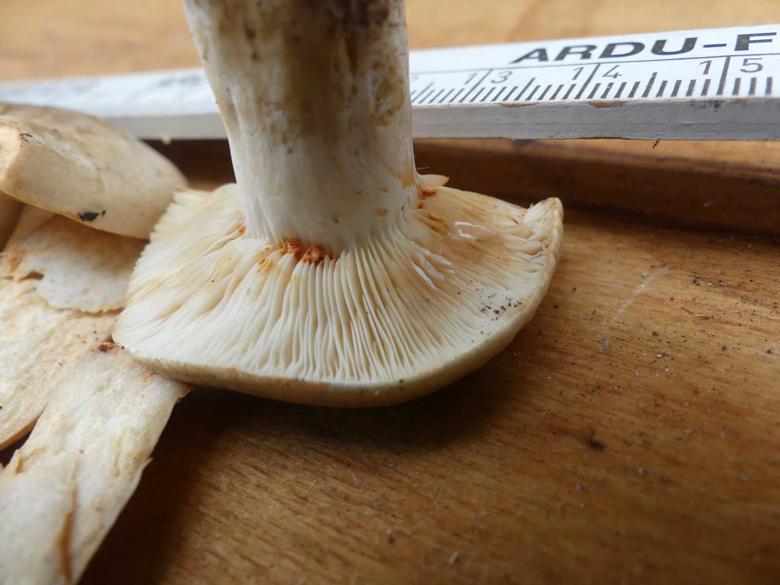 Danke für den Tipp. Rein optisch passt das ganz gut, zumindest nach den bei 123 Pilze gezeigten Fotos. Allerdings gibt es unterschiedliche Aussagen über die Schärfe: 123 Pilze sagt "sehr scharf", während Wikipedia sagt, dass die Schärfe nach einiger Zeit vergeht und sich in "Schellfisch" (wie schmeckt Schellfisch?) verwandelt.