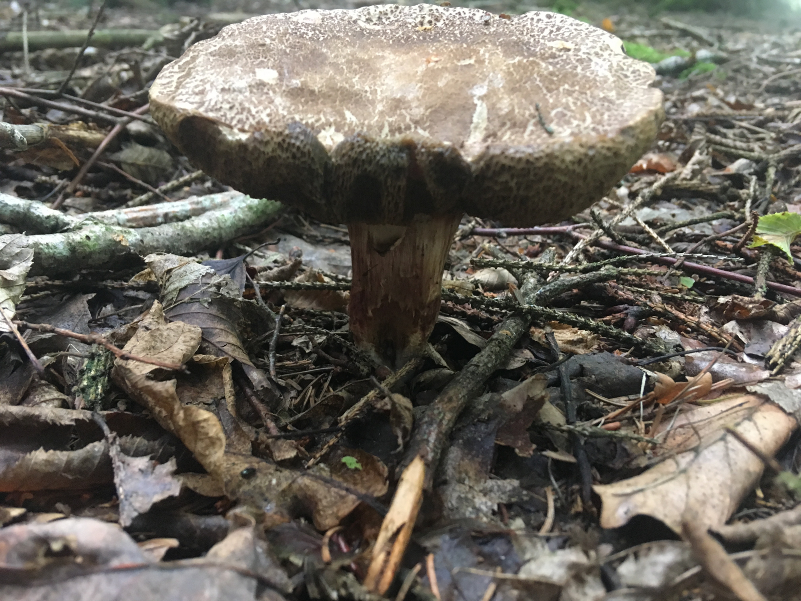 Die Farben sind meistens eher trüb, wenig freudig, aber gerade am Stiel ist Xerocomellus porosporus oft ein recht bunter Pilz: Gibt's auch mit schön rotem Stielfleisch und dann auch roten Farben außen am Stiel.