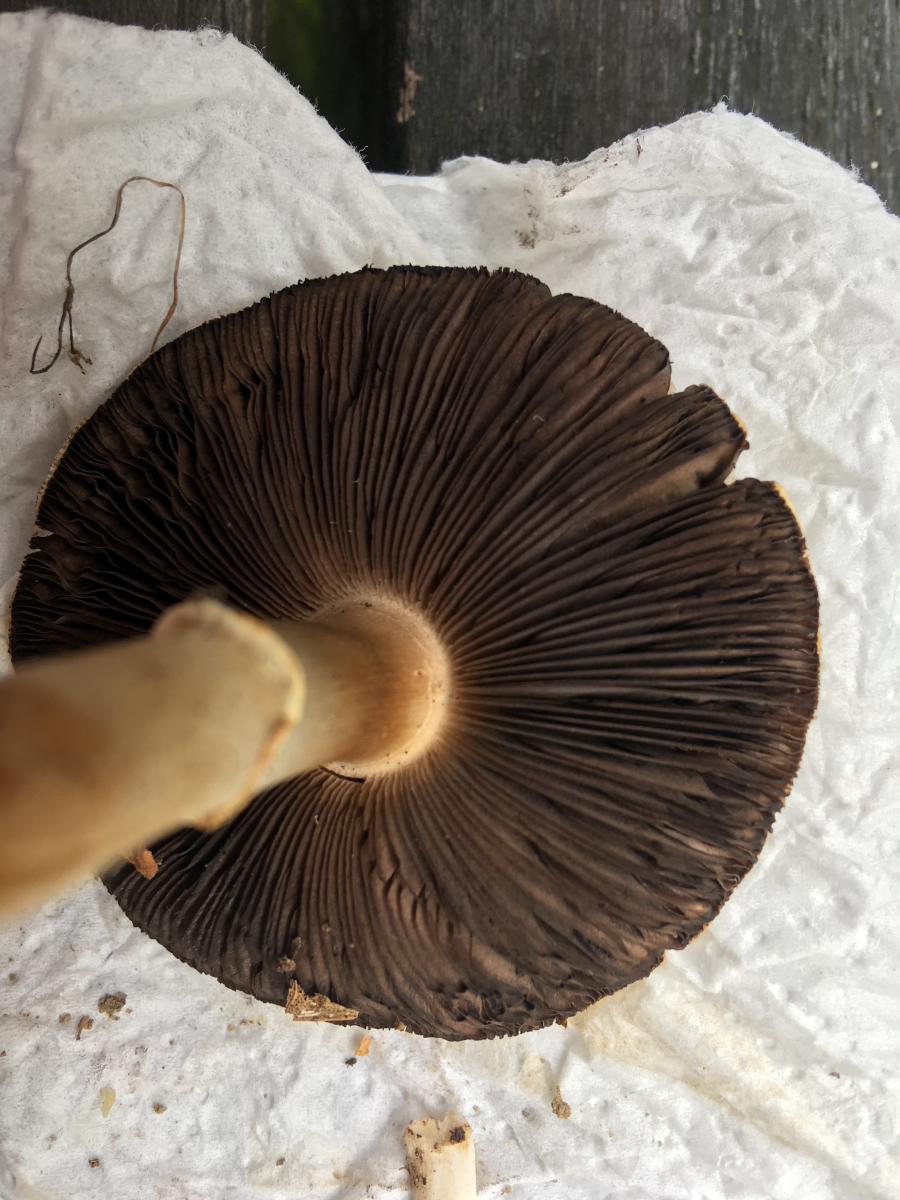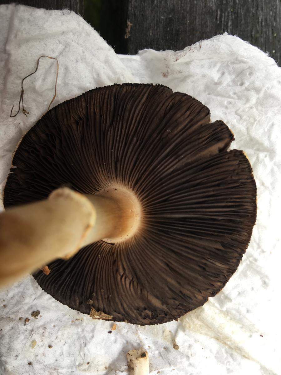 Pilz 5 wuchs im Mischwald, wobei er unter Fichten stand. Geruch unauffällig.Auffallend für mich natürlich das schwarze Sporenpulver. Könnte das ein Träuschling sein?