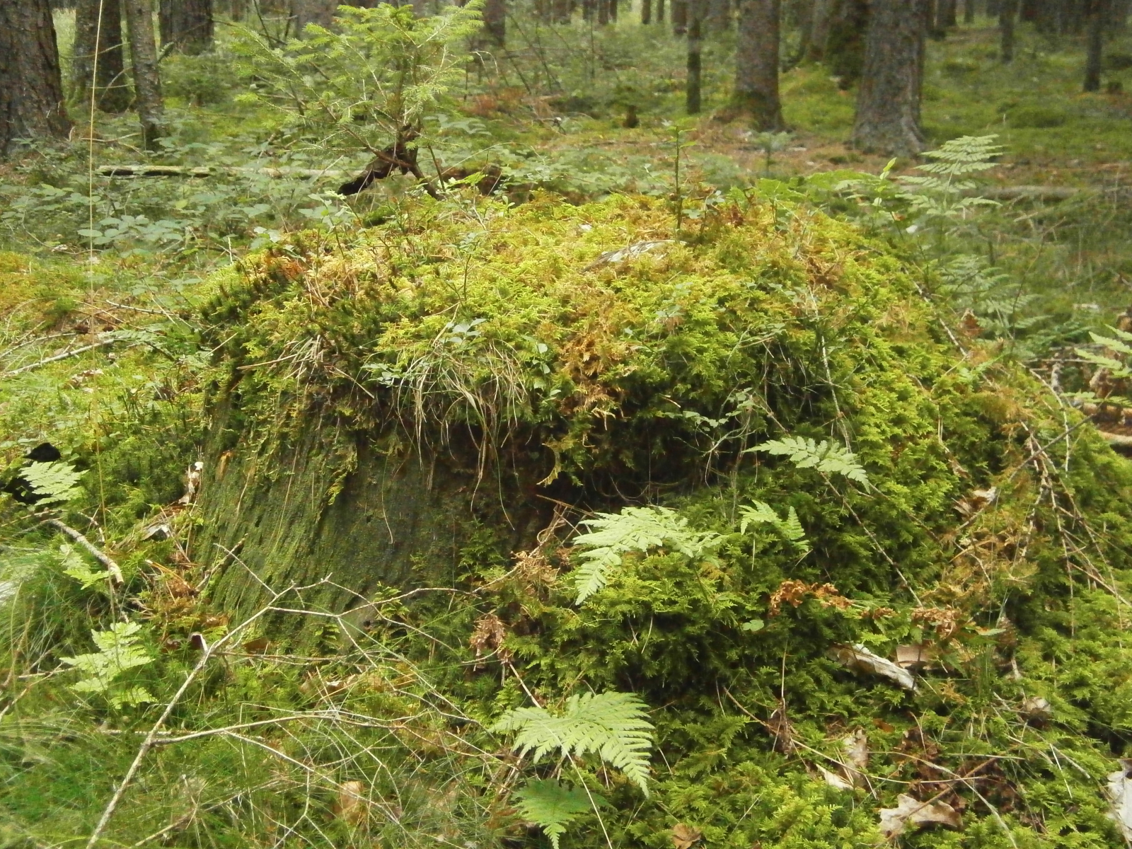 gut getarnt und versteckt unter Farn saß er an der Rückseite eines Baumstumpfs.