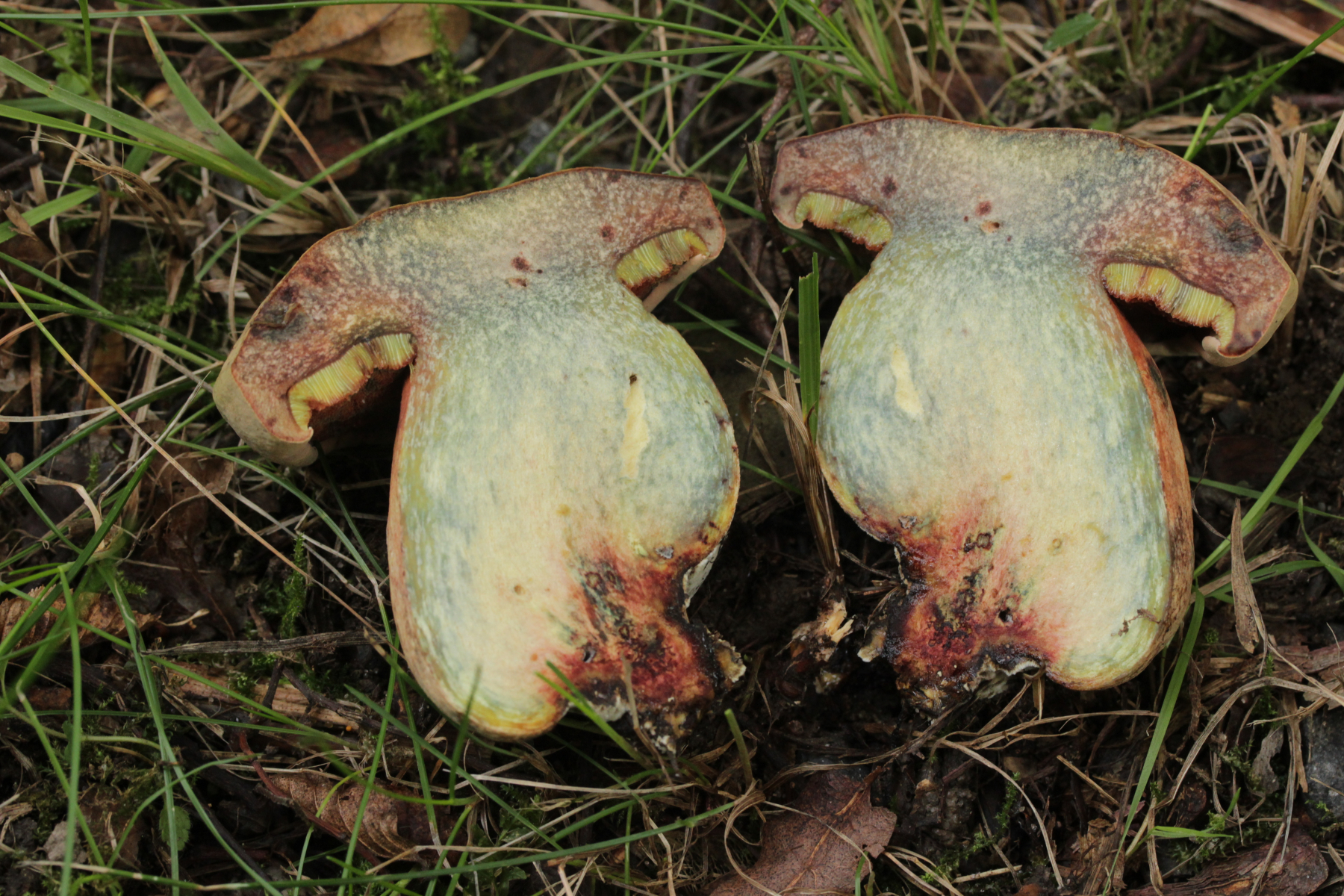 ich sehe auch Suillellus luridus ohne var. rubriceps (letztere kenne ich viel mehr ins Blutrote gehen und fast glänzend rot), dafür aber wieder eine Kollektion mit rotem Hutfleisch. Und das ohne Trockenschaden - bei trockengeschädigten Exemplaren kann das Blauen fast aussetzen und das rote Pigment der Stielbasis zieht sich den Stiel hoch, teils bis in den Hut. Hier ist es aber anderes, der Stiel ist oben gelb im Fleisch und der Hut wiederum rot - und der Pilz ist frisch. Ich sehe da also eher die Rotfleischige Varietät var. erythroteron als eine rothütige.