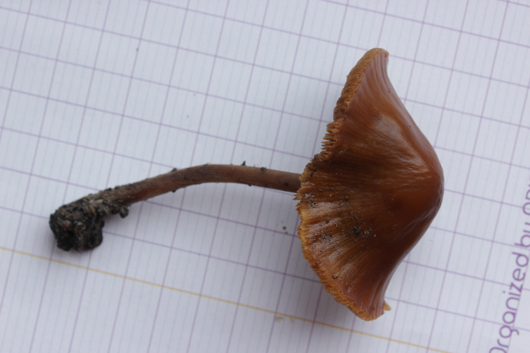Pilz im feuchten Zustand. Stiel unten knollig. Hut etwa bis zur Mitte gerieft.