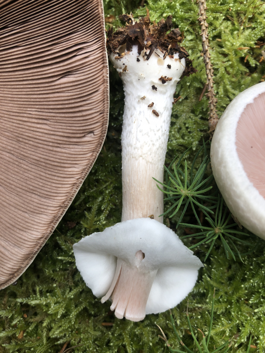 Als Waldchampignon (Agaricus silvaticus) hat man mir mal einen Pilz mit bräunlichem Hut vorgestellt, der verhältnismäßig stark rötet. Dieser hier sieht anders aus.