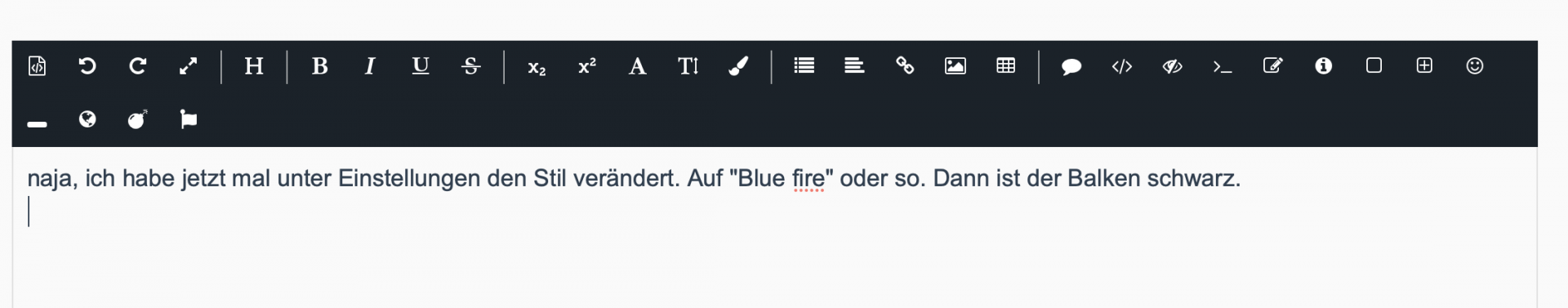 • naja, ich habe jetzt mal unter Einstellungen den Stil verändert. Auf "Blue fire" oder so. Dann ist der Balken schwarz. Und nicht grün. Das 20. Zeichen sieht wie eine Sprechblase aus. Btw. Und welchen Stiehl ich wähle, das geht hier ohnehin niemanden was an 😂
