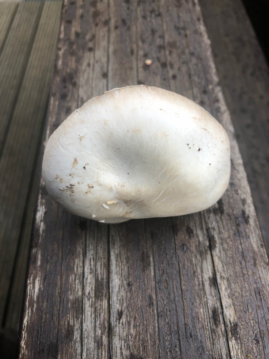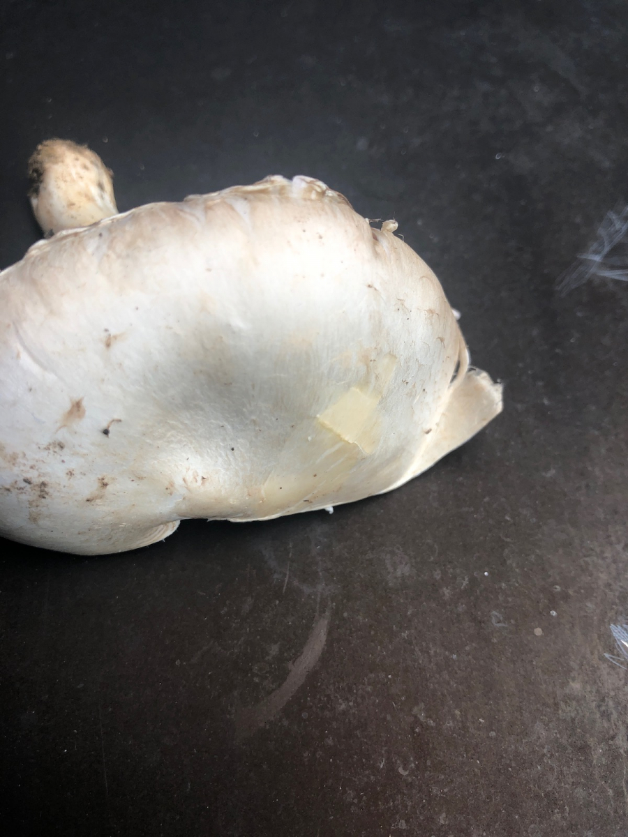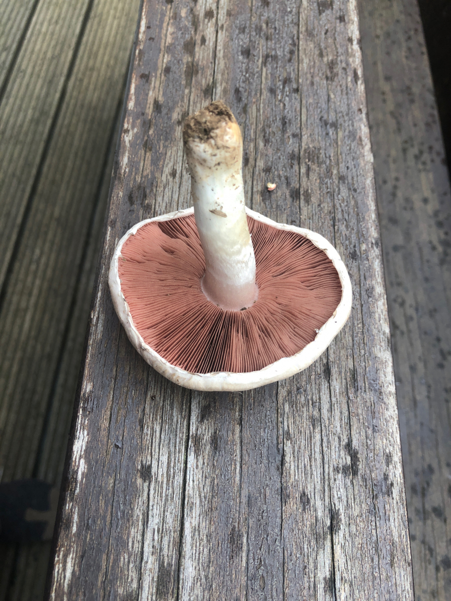 Dann direkt auf meinem Schotterweg am Haus ein Champignon, Der ähnelt den leckeren Wiesenchampignons auf der Weide, aber ich bin mir unsicher. Irgendwie ist er doch anders. Oder meine Wiesenchampignons sind keine. 8 cm Hutdurchmesser, Geruch nach nichts, Schaeffer negativ, ein ganz minimales Gilben an der Basis, aber kein Chromgelb oder so Etwas.