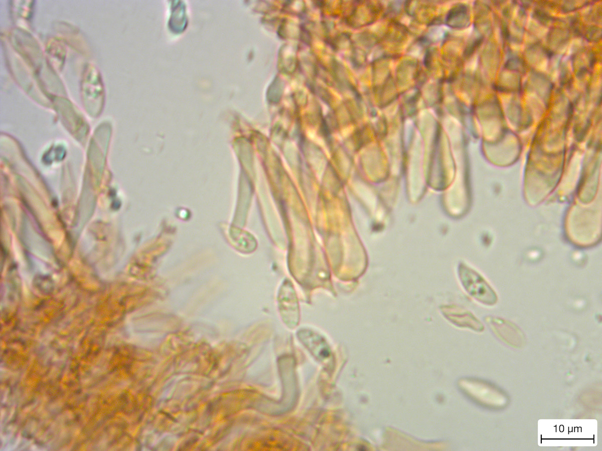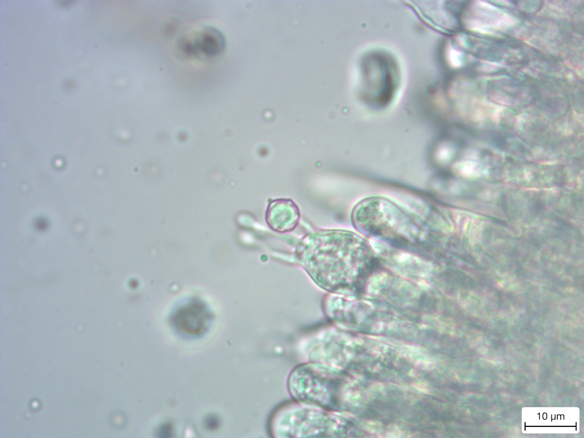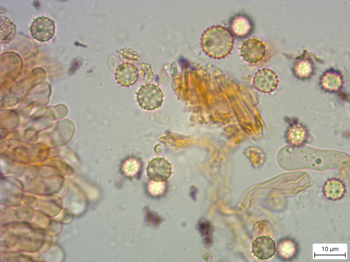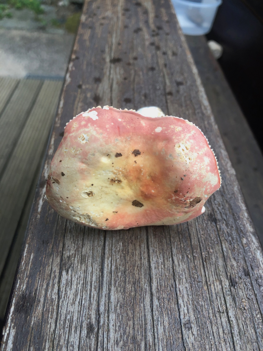 Dann gab es diesen festen trockenen Täubling in Rottönen. Unter Birken, Buchen, Ahorn, Geruch nicht wahrnehmbar, keine Reaktion mit Guajak bzw. erst nach 10 Minuten, FeSO rosa, mild, Huthaut nicht abziehbar. Was müsste ich mikroskopieren? Hab nur eine einzige Spore gefunden.