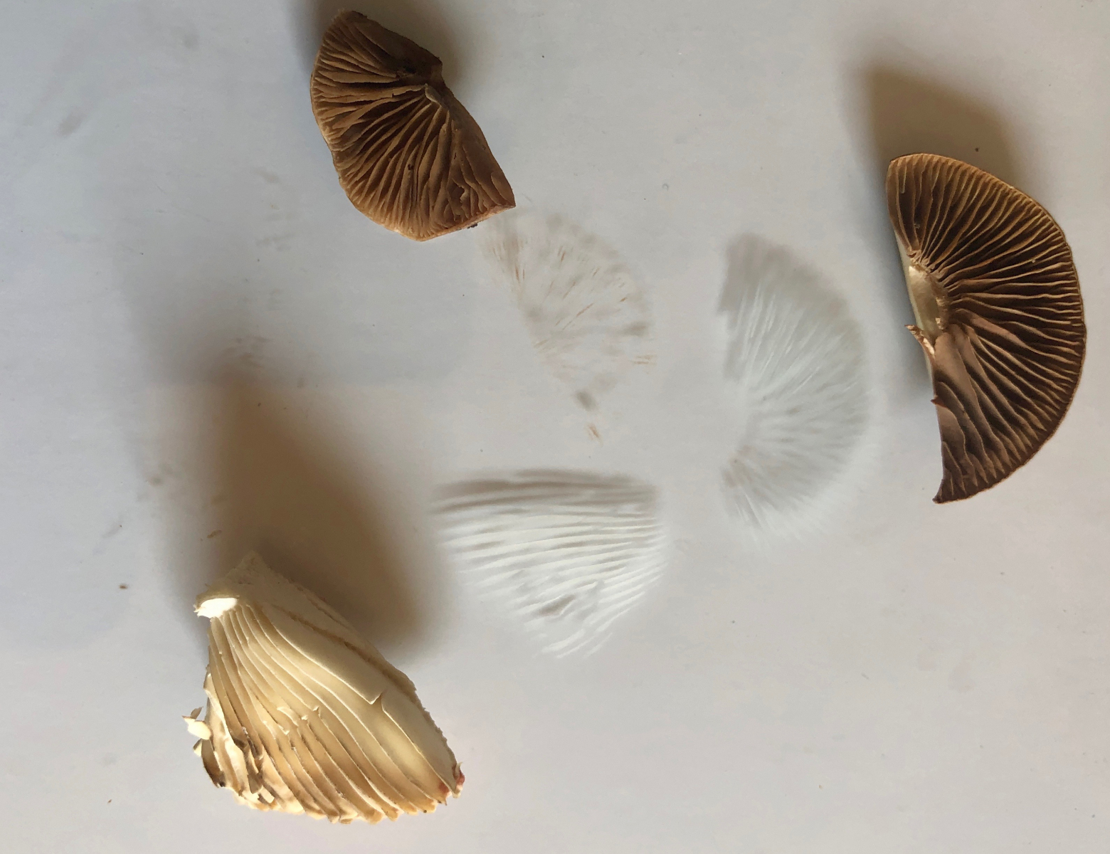 Bei dem hier fällt mir gar nichts Gescheites ein. Außer dass er besonders freistehende Lamellen hat und das zu den Dachpilzen passen würde. Der Sporenabwurf ist noch in Arbeit.