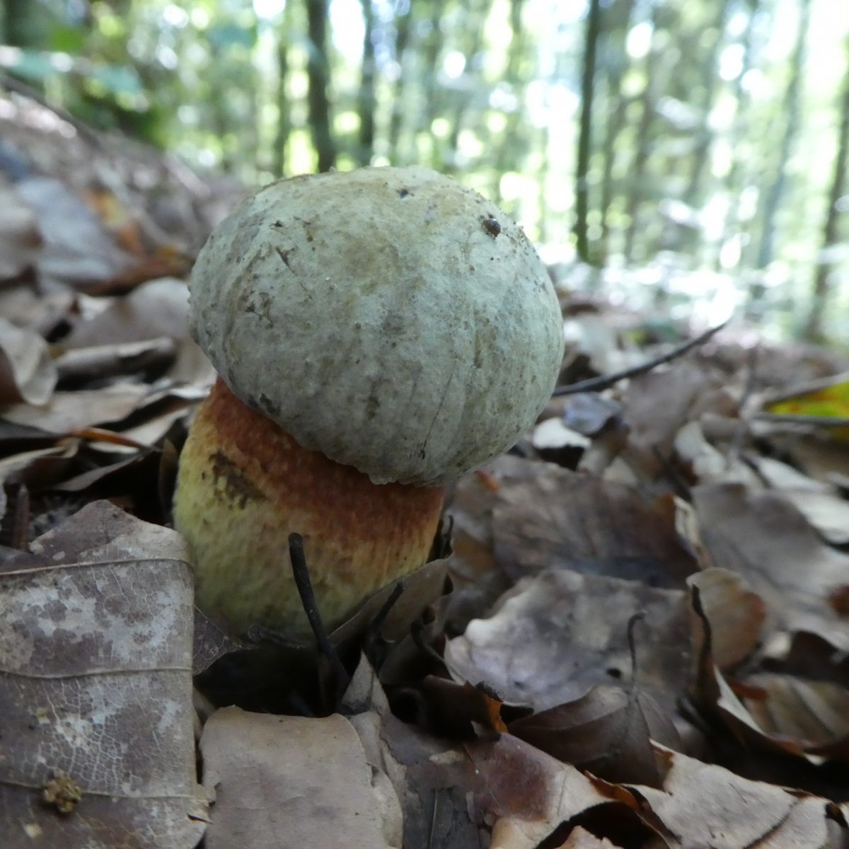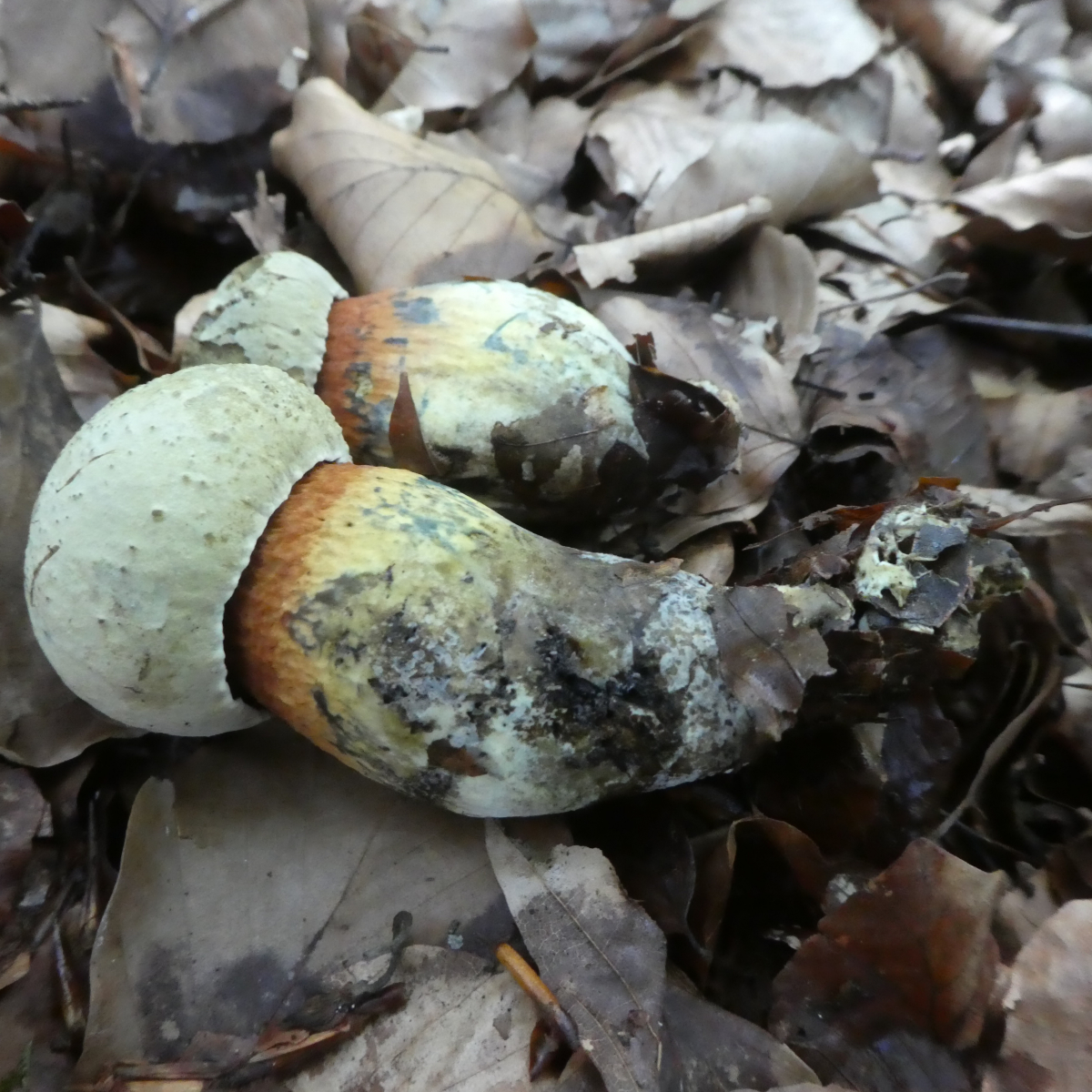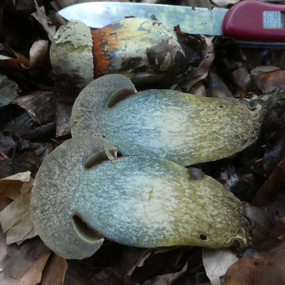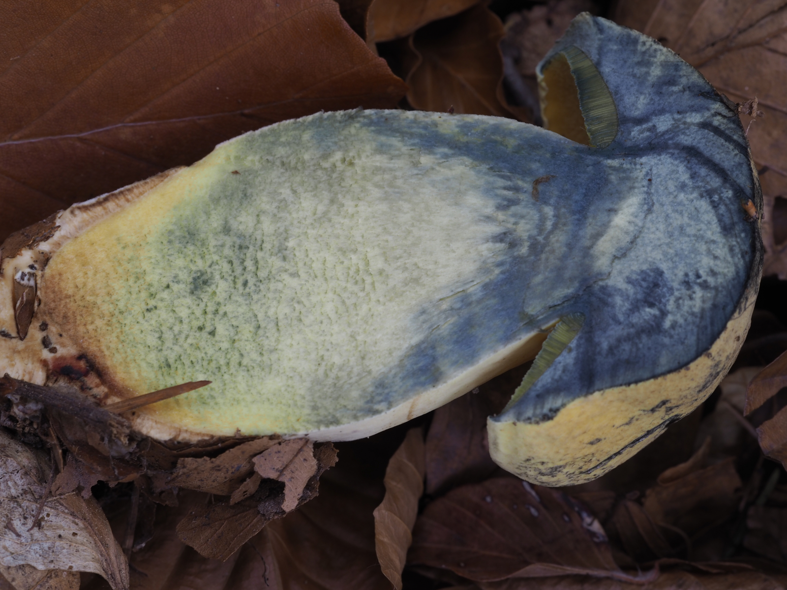 Funddaten: 22.08.2019, Altmühltal, eigentlich Mischwald am Fundort aber ein sehr großes Stück reiner Rotbuchenwald. Höhe des größeren Pilzes 7,5 cm, Hutdurchmesser 4 cm, sofort aber nicht sehr intensiv und nur in der Mitte des Pilzes blauend
