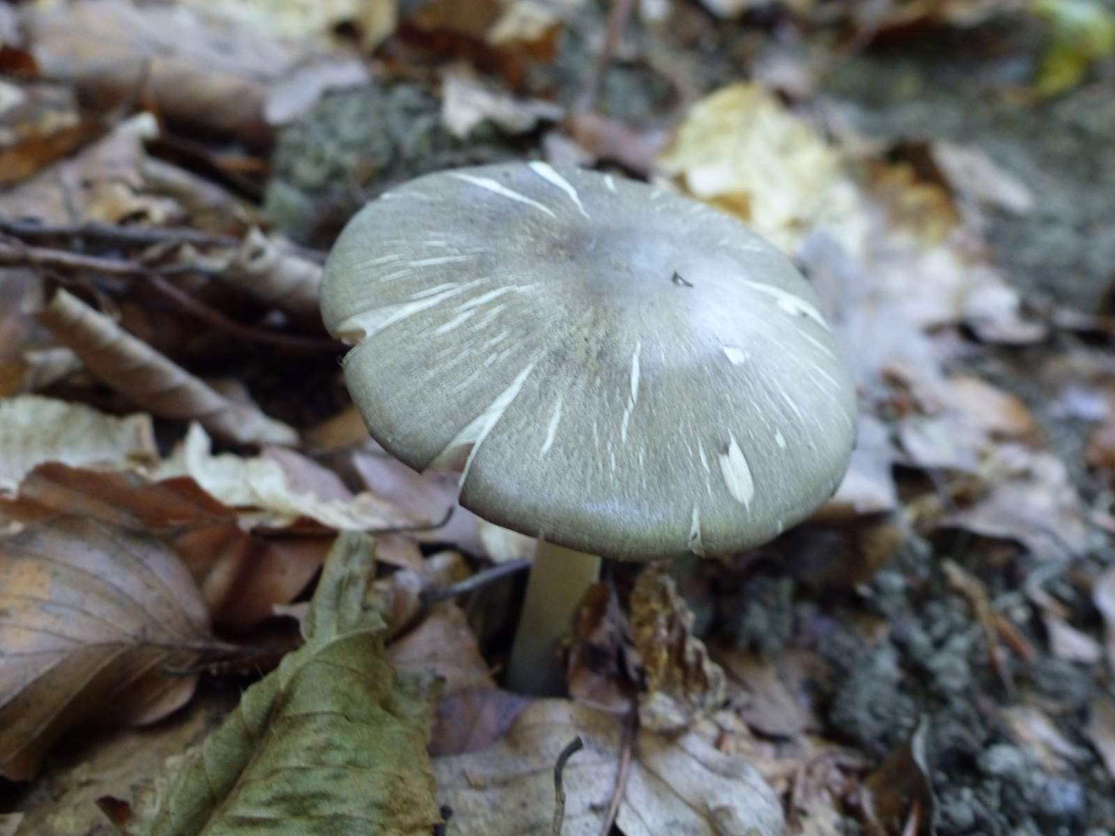 Hut: grau, eingerissen, glänzend, mittig Erhebung sichtbar, grauflockend,