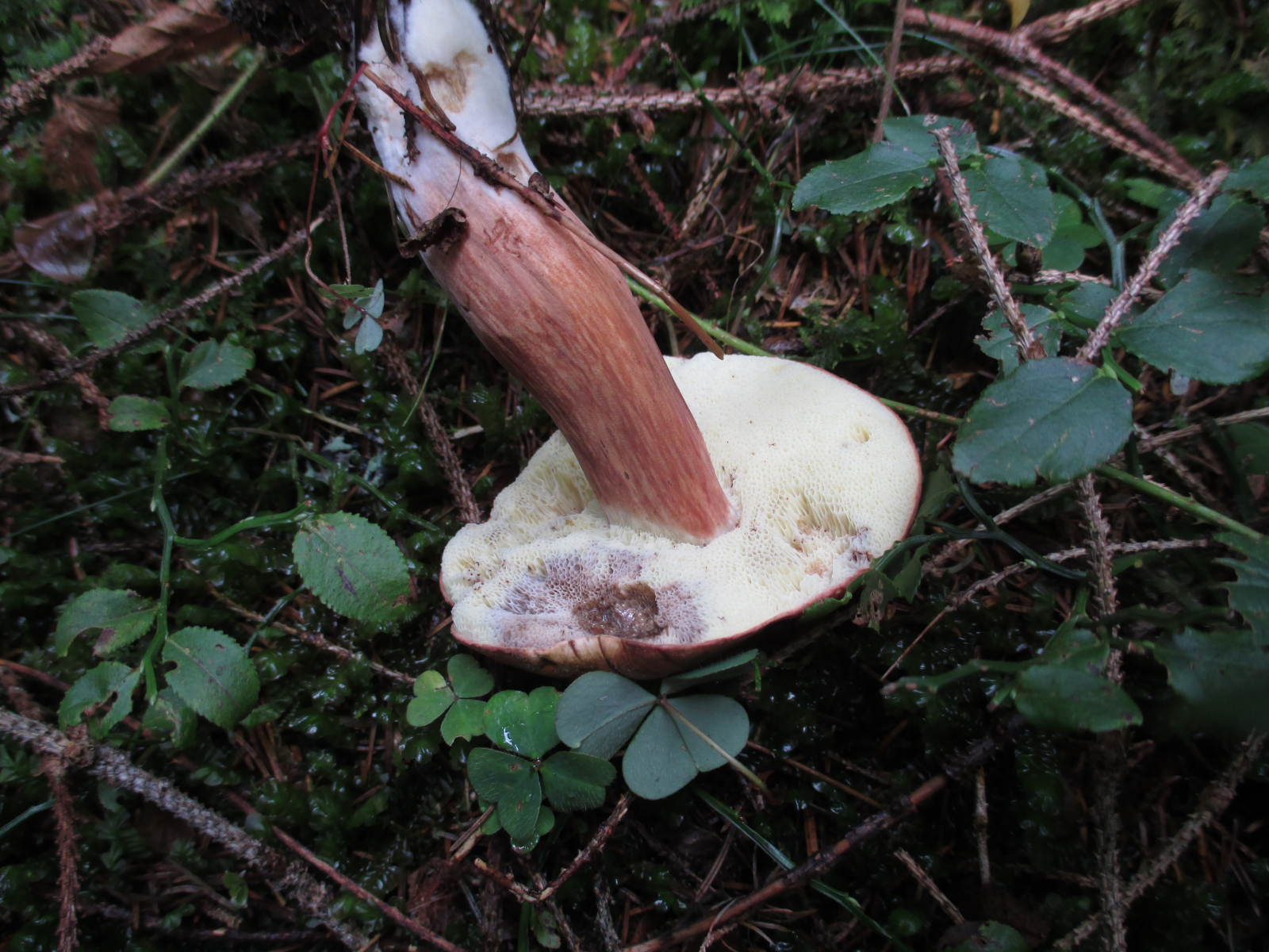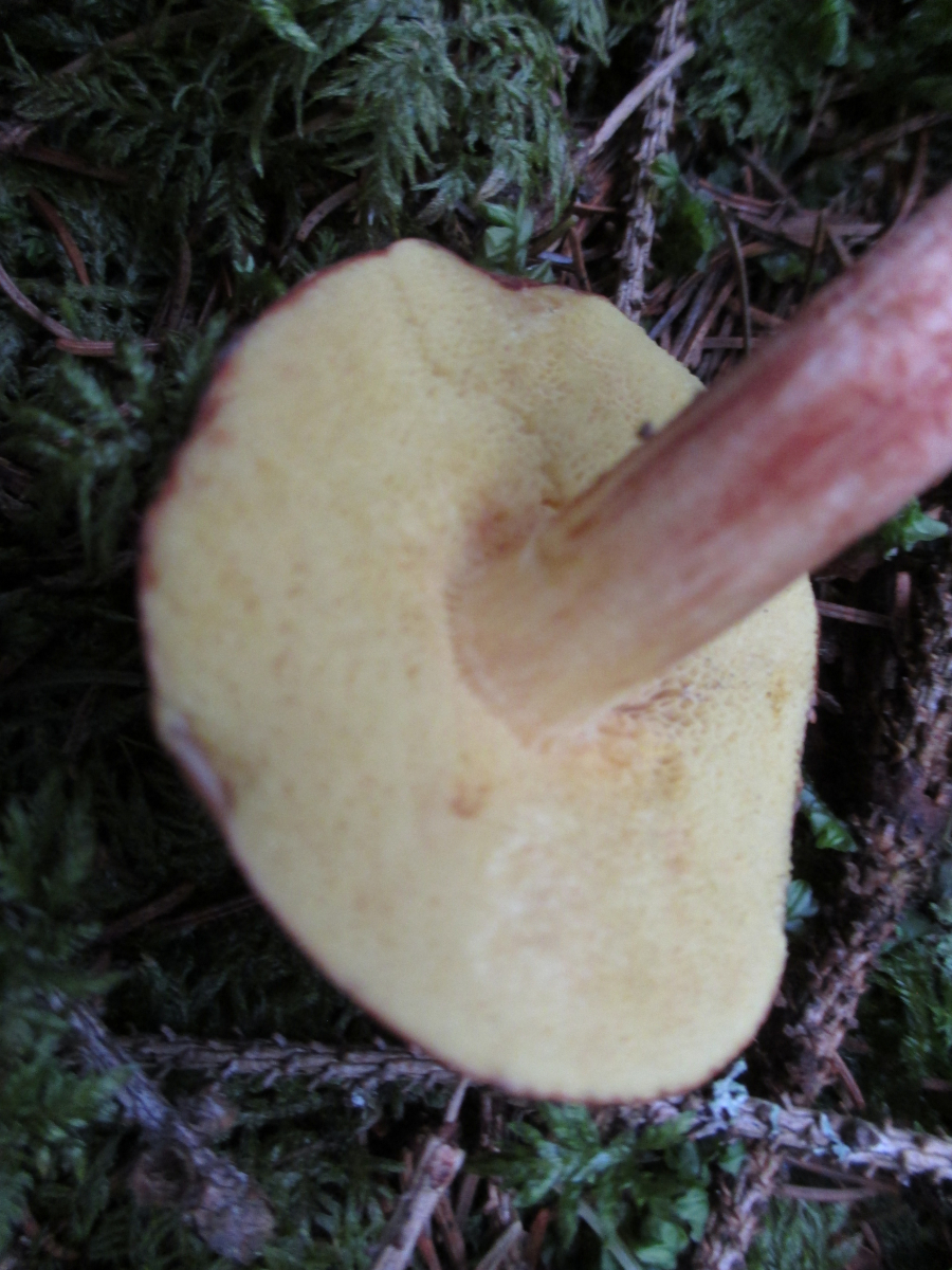 Naja, wenn das Fleisch rieklich weiß ist, dann käme eben noch der Braune Filzröhrling (Xerocomus ferrugineus) oder Xerocomus silwoodensis (für den wüsste ich keinen deustchen Namen) in Frage. Die hätten beide deutlicher gelbe Mycelfäden unter der Stielbasis.