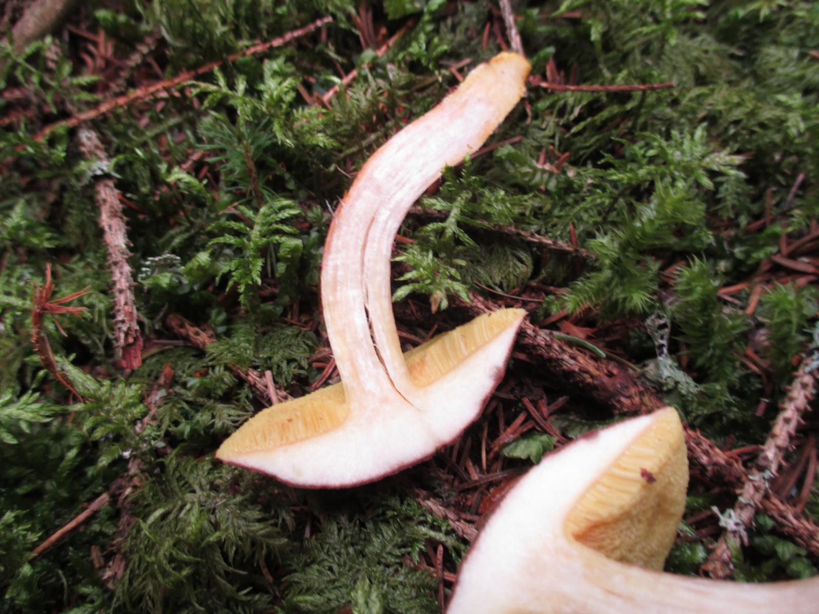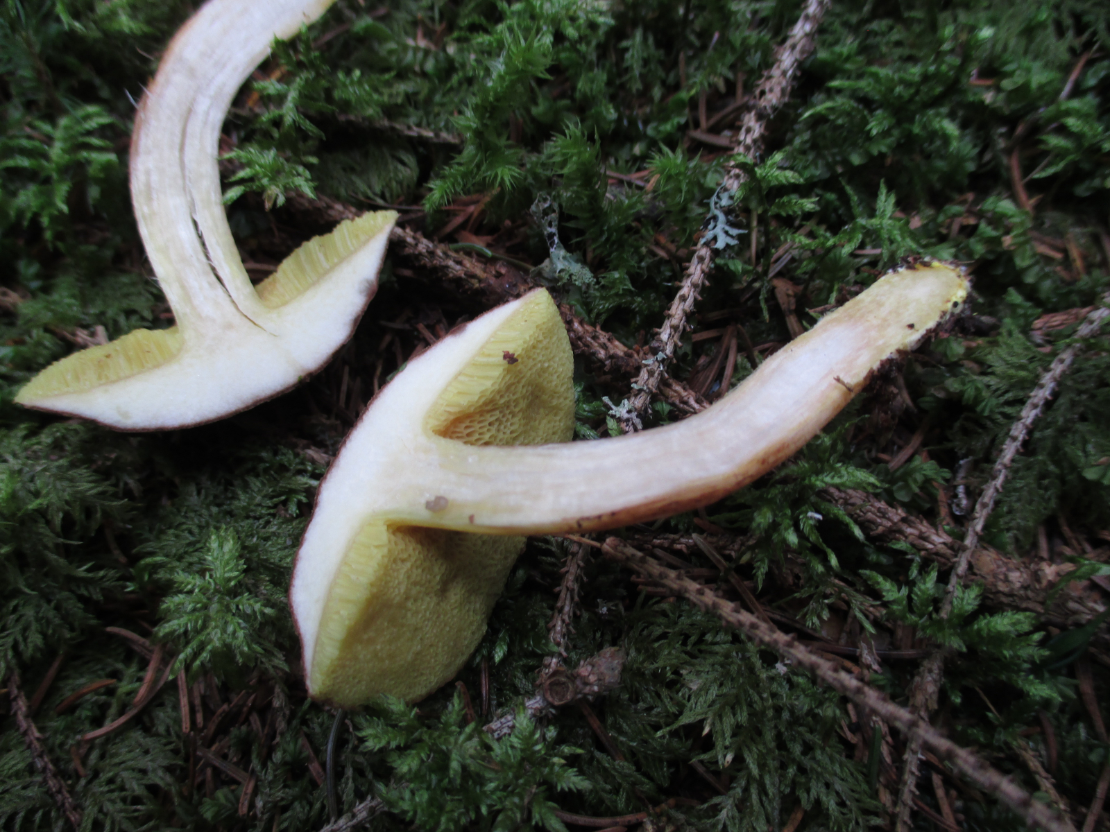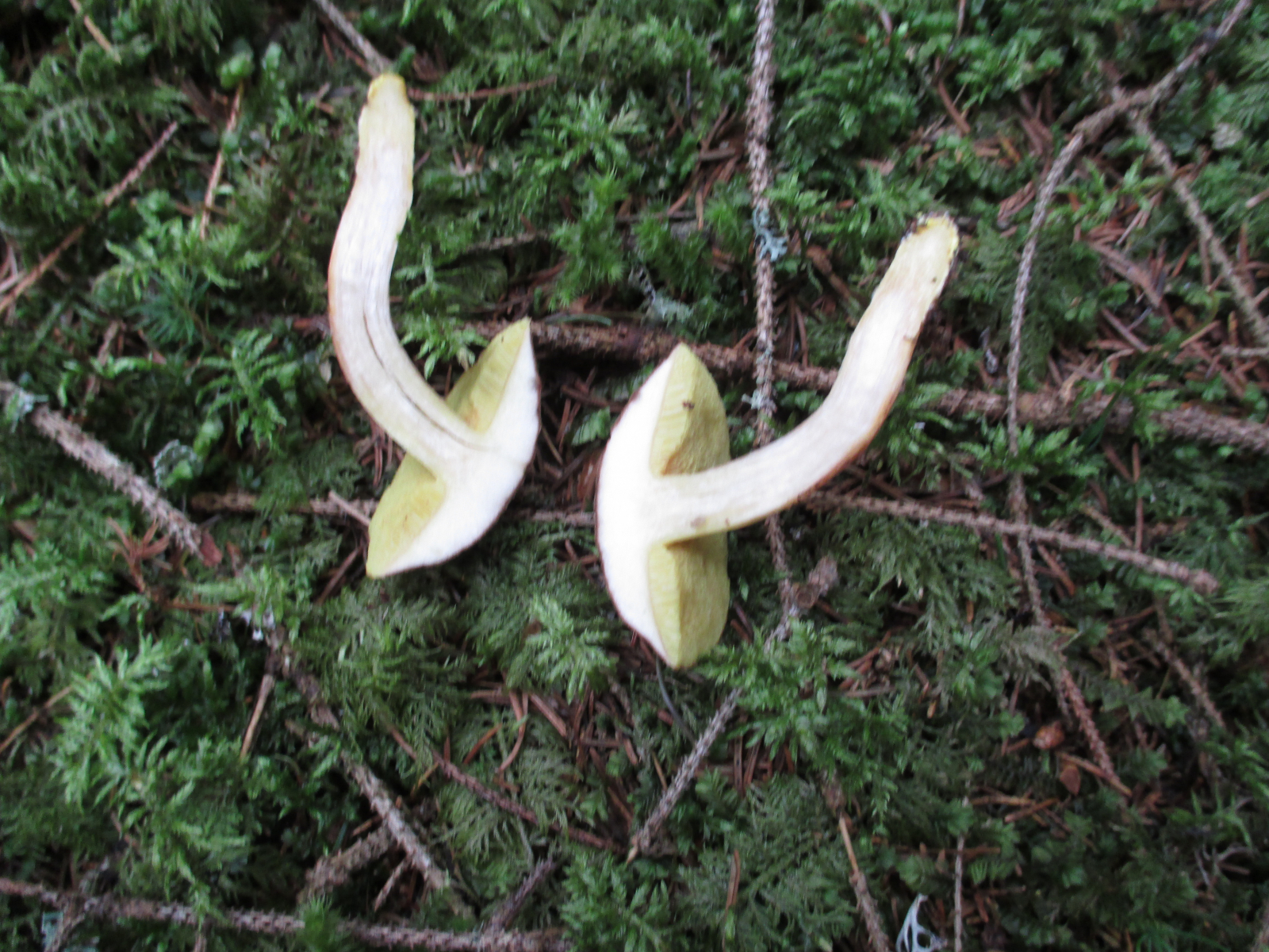 Alelrdings ist hier das Shcnittbild auf dem Foto schwer zu erkennen, da etwas überbelichtet. Das Fleisch erscheint dadurch durchgehend weiß, sowohl im Hut (wäre dort bei subtomentosus blass bis deutlich gelb) als auch im Stiel (wäre dort bei subtomentosus zart rosabraun bis rosagrau).
