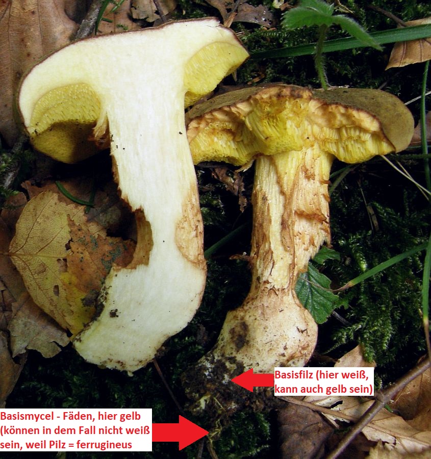 Gelbes Basismycel ist das nicht, sondern ein gelber Filz unter der Stielbasis. Der isz allerdings nicht bestimmungsrelevant. "Basismycel" meint schon die kleinen Mycelfäden unter der Basis.