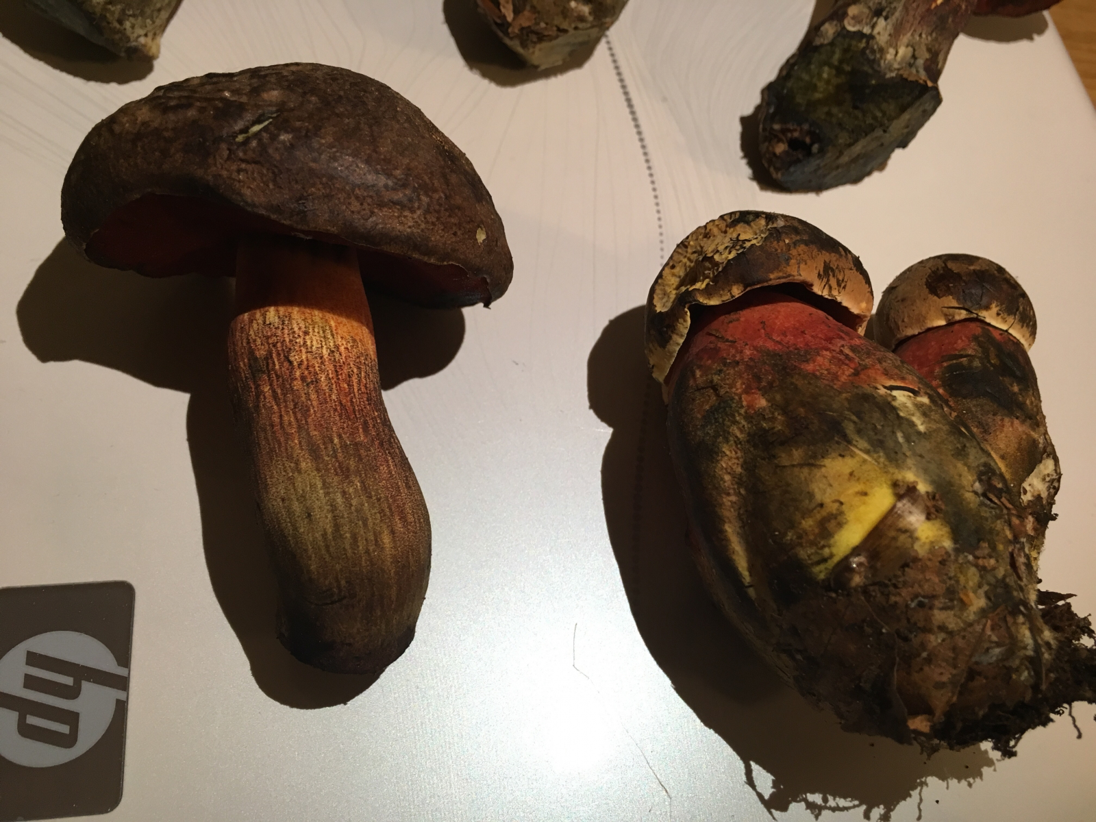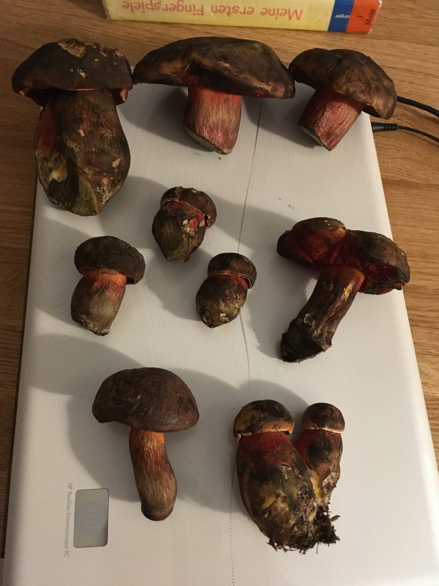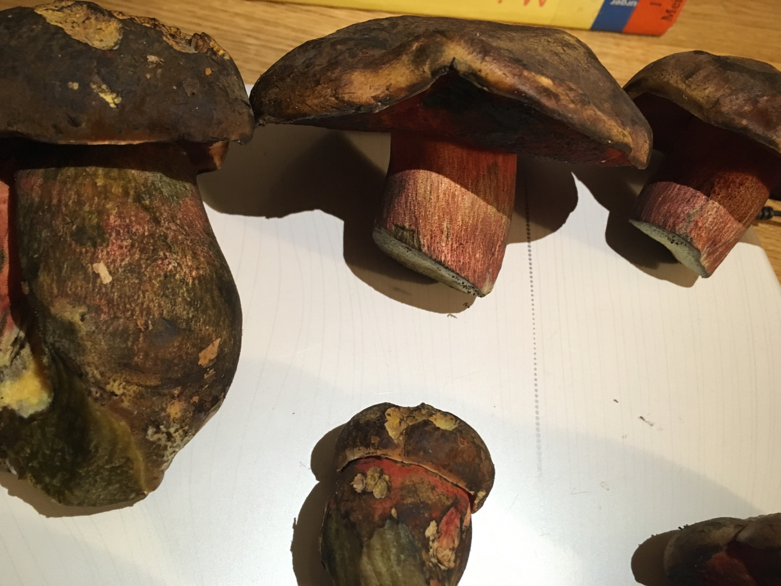 ich habe heute in einem kleinen Waldstück neben dem Spielplatz meiner Tochter einige Steinpilze und Maronen gefunden. Es handelte sich um einen moosigen, sauren Mischwald mit Fichten und Buchen. Es standen noch einige Hexenröhrlinge daneben. Leider bin ich bei diesen noch unsicher und wollte hier nachfragen, ob es sich hier um Flockenstielige Hexenröhrlinge handelt. Da ich noch nie einen Hexenstieligen Hexenröhrling gefunden habe, bin ich mir unsicher, wie stark das Netz ausgebildet ist. Ich hoffe, das ist auf den Bildern zu erkennen.