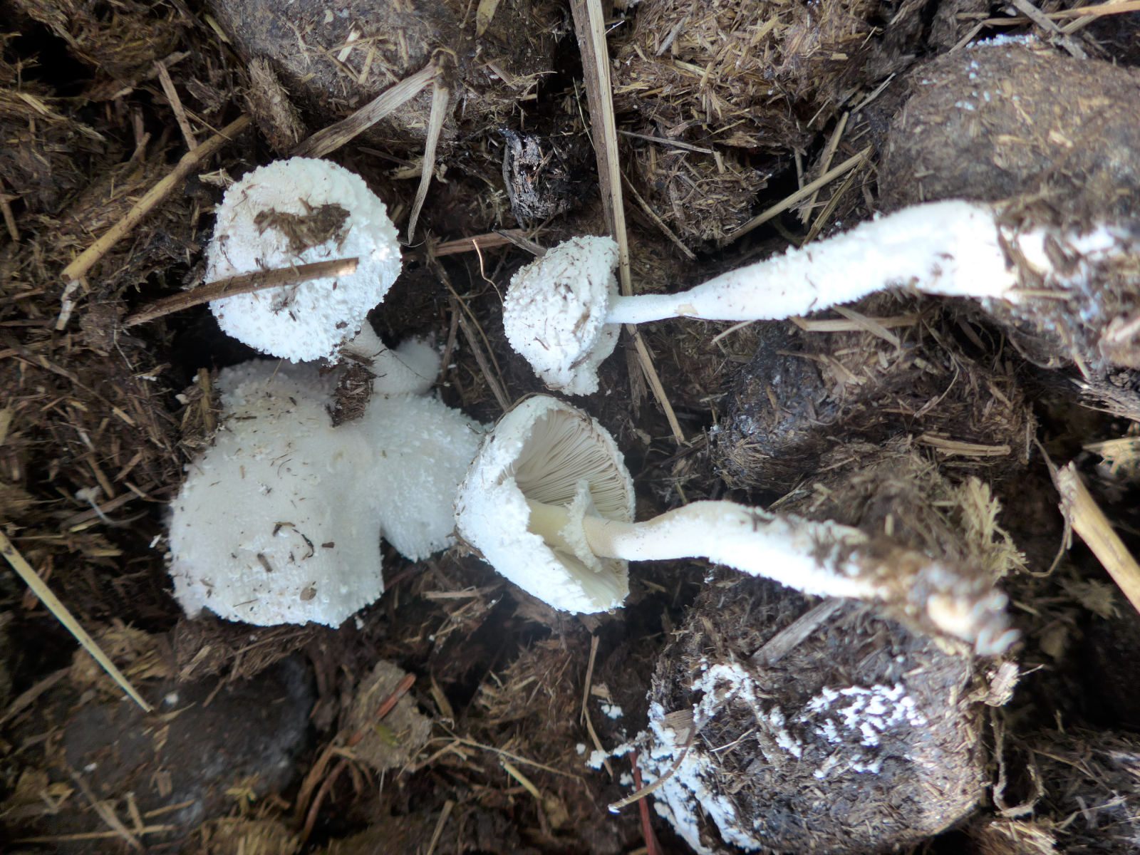 Jetzt zum Sensations-Misthaufen-Fund. ==Gnolm19==Gnolm7==Gnolm25Weiße flockige Pilze auf Misthaufen kann nur Coprinopsis nivea sein. Pustekuchen, die hatten weiße Lamellen und einen Stielring. Schnell war die Gattung Leucocoprinus klar. Ich sehr überrascht. Ich hätte so was eher in einem Blumentopf in der Tropenhalle erwartet aber in keinem Misthaufen. Nach ein bisschen Recherche wars dann klar. Es ist Leucocoprinus cretaceus. Sein Erscheinen auf Misthaufen ist typisch. Es waren dort auch noch andere Pilze. Es seien noch Bolbitius coprophilus und noch unbestimmte schuppige Champis aus der Minores-Sektion genannt.