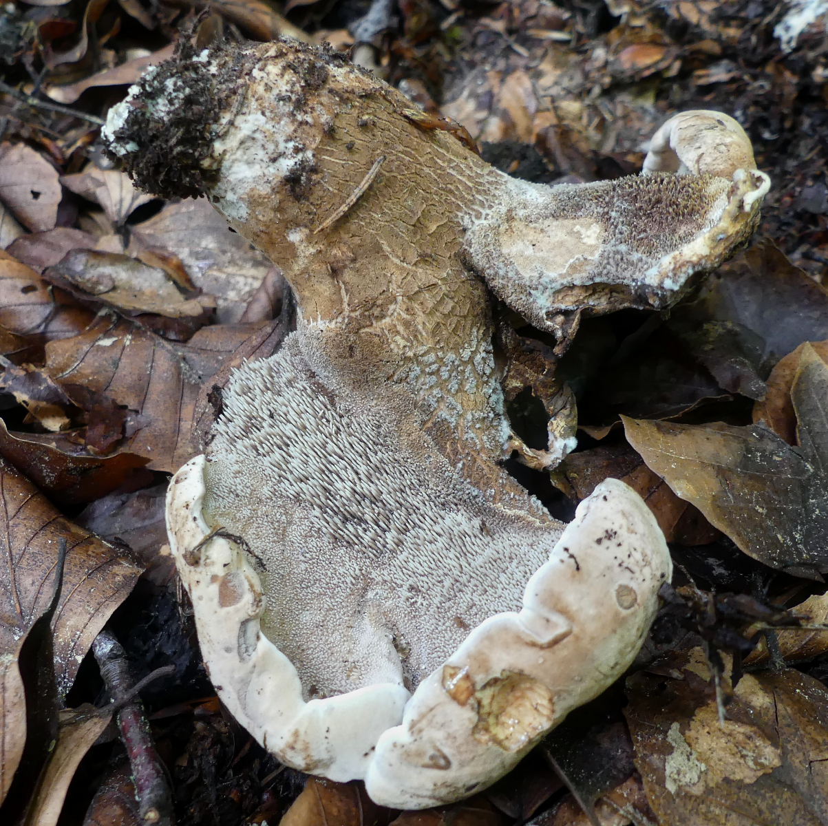 Nach dem Ausschlussverfahren, Maria und ich haben im Exkursionsfahrzeug auch kurz durchgeschlüsselt, bleiben Sarcodon leucopus und die beiden "Literatur-Phantome" Sarcodon underwoodii (nach OTTO 1997) und Sarcodon laevigatus (nach MAAS-GEESTERANUS 1968).