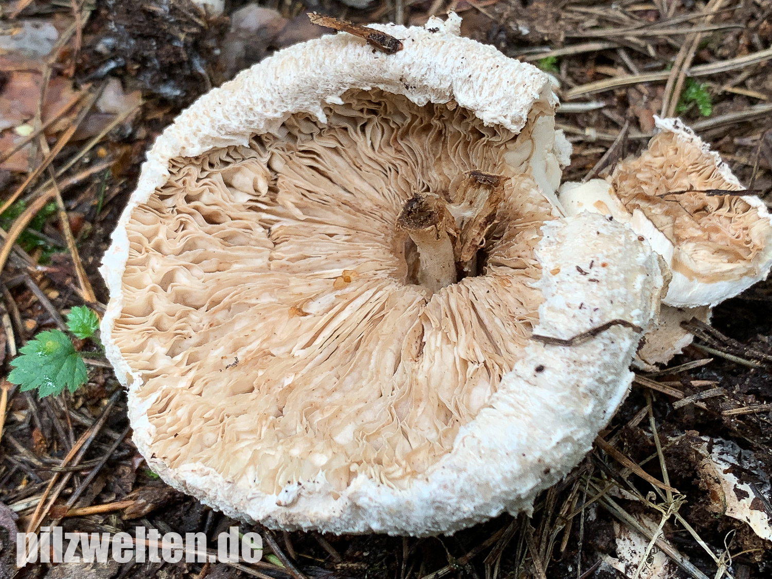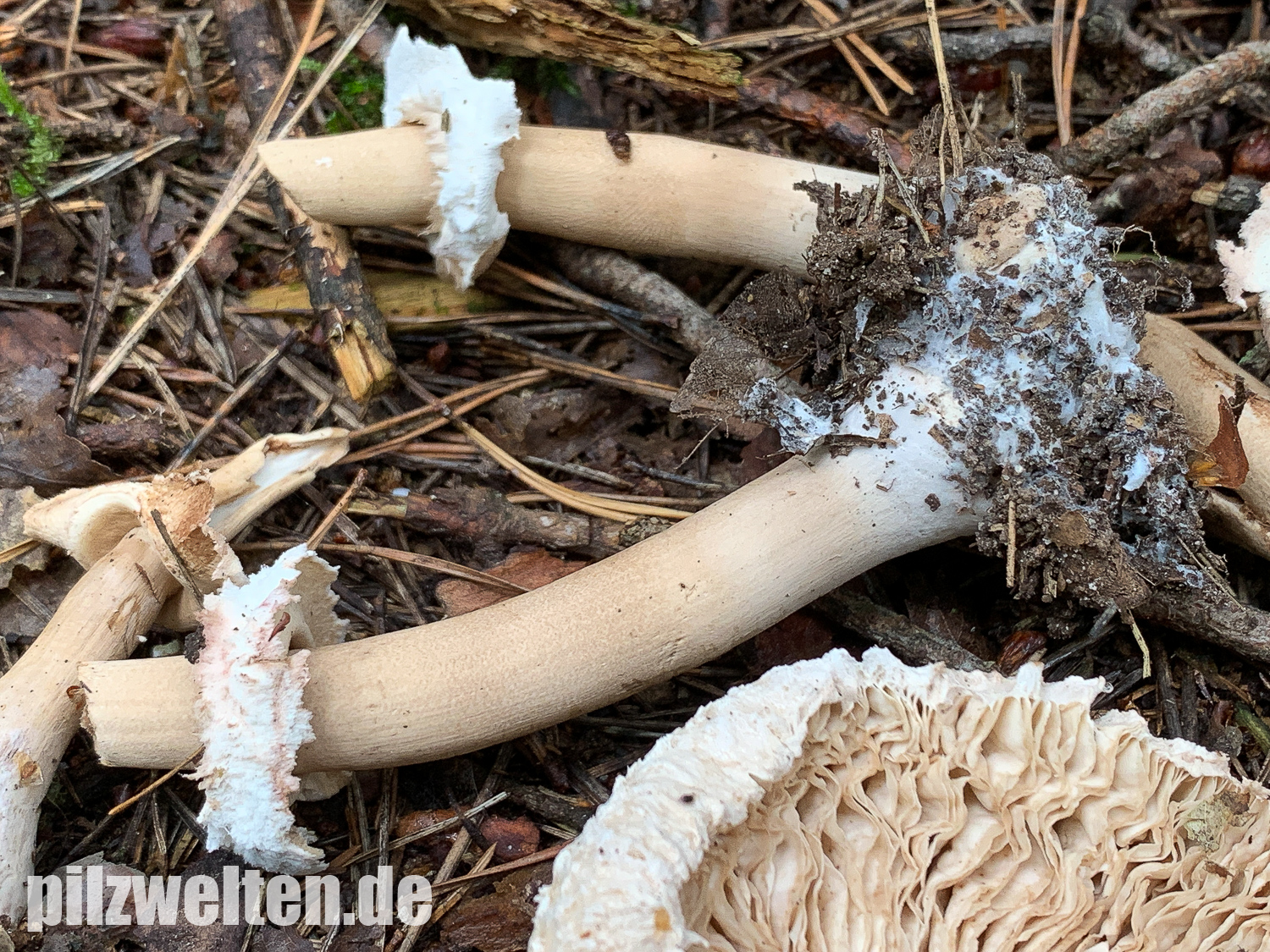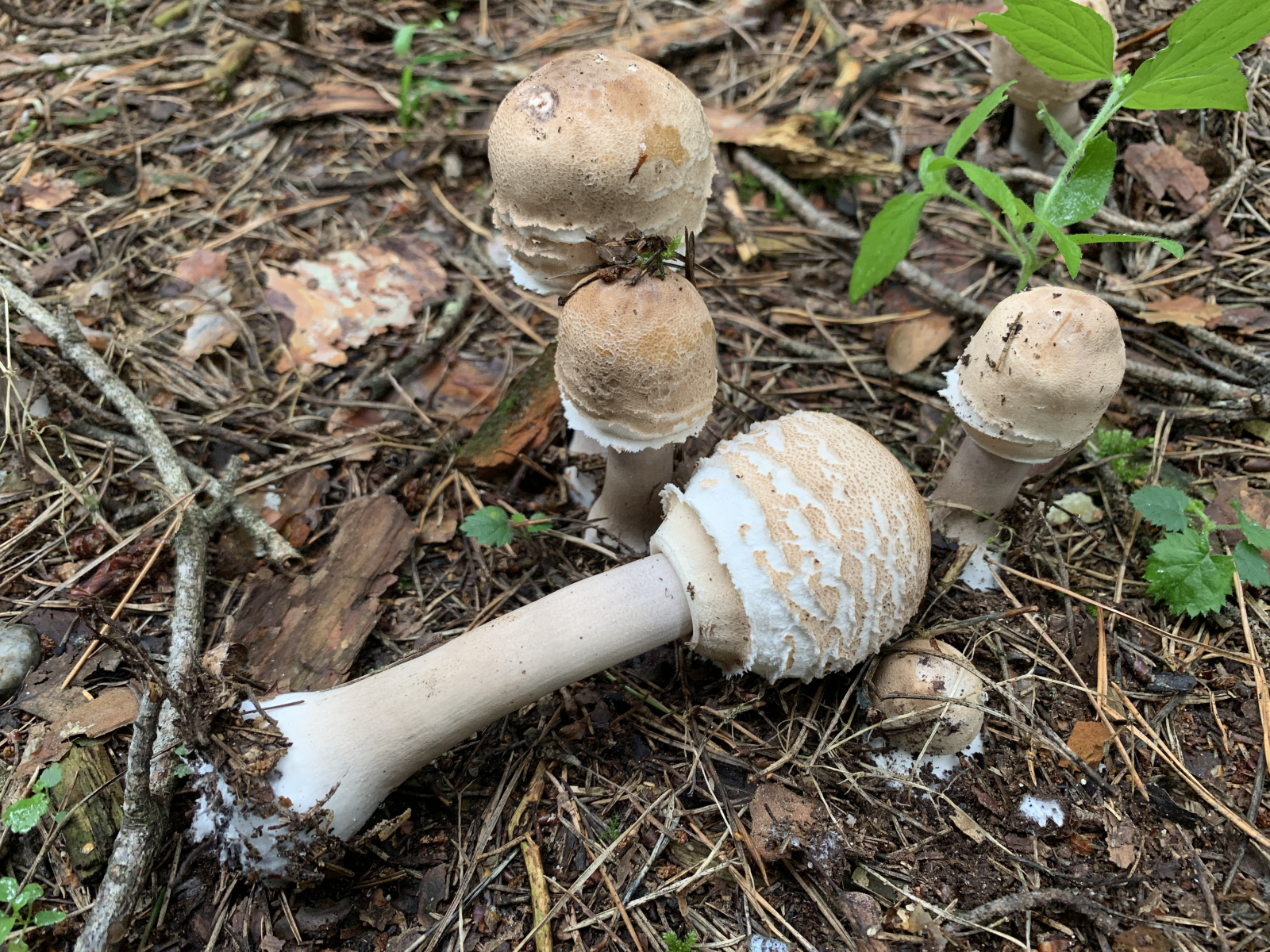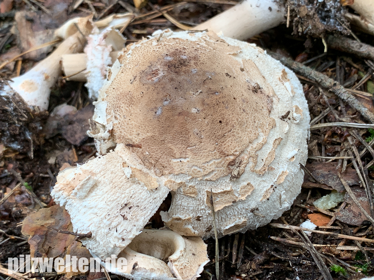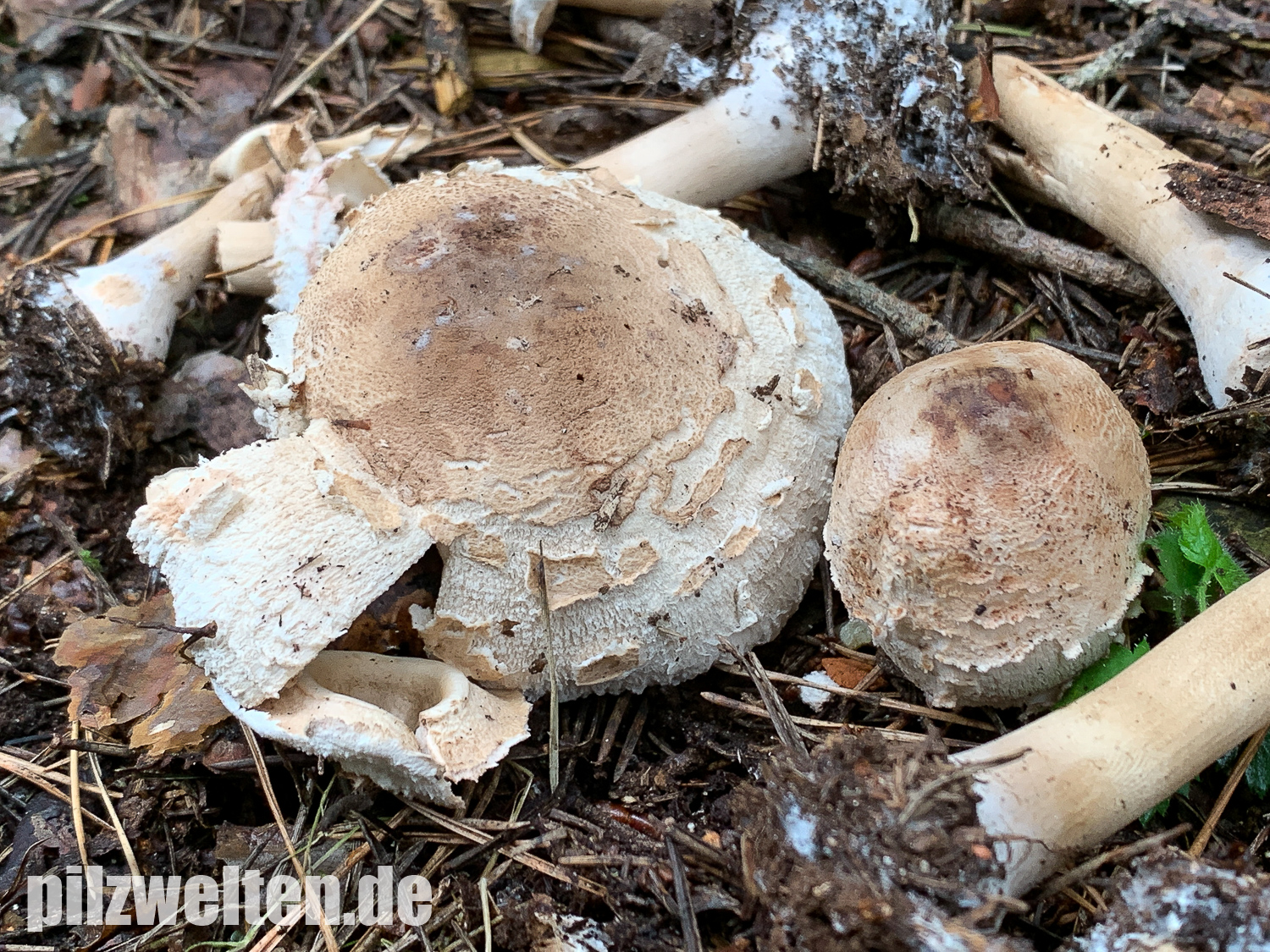 Wir sind erst heute dazu gekommen nochmal eine Runde im gleichen Wald zu drehen. Leider waren in der Zwischenzeit wohl ein paar Trampeltiere im Wald unterwegs. Unglaublich, was wir heute an herausgerissenen, zertretenen, zerbröselten und sonst irgendwie untypisch zugerichteten Fruchtkörpern gesehen haben. Leider hat es auch unsere Schirmlinge erwischt, weshalb wir leider nicht wie erhofft brauchbaren Fotos von aufgeschirmten Exemplaren nachliefern können - das ist, was von den zuletzt wunderschön wachsenden Schirmlingen übrig geblieben ist: