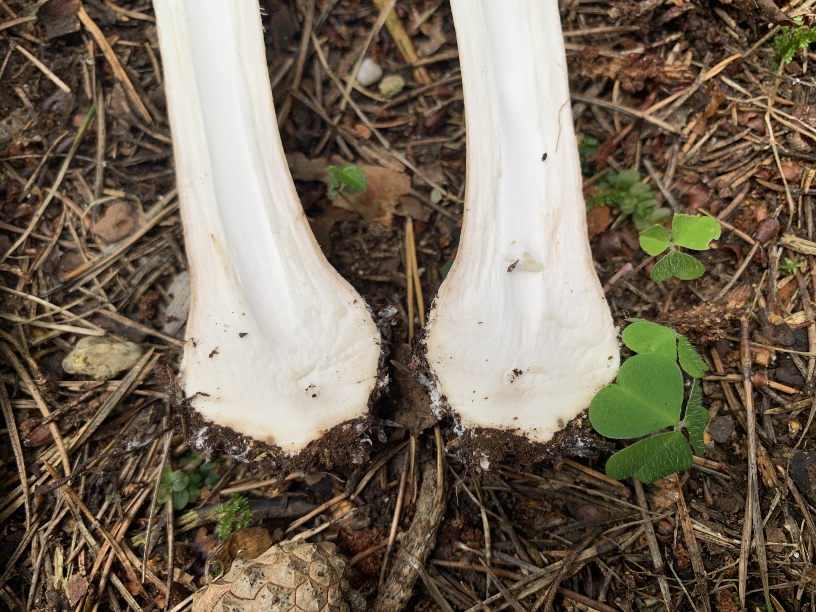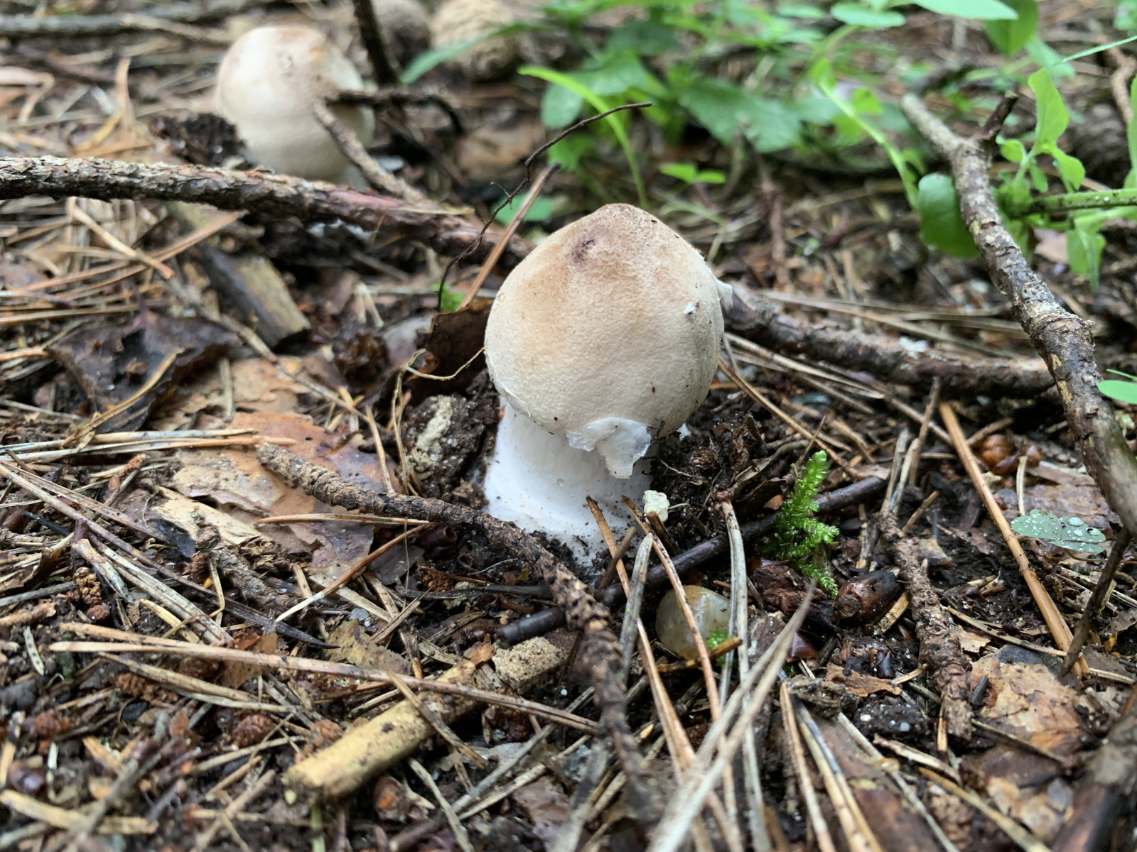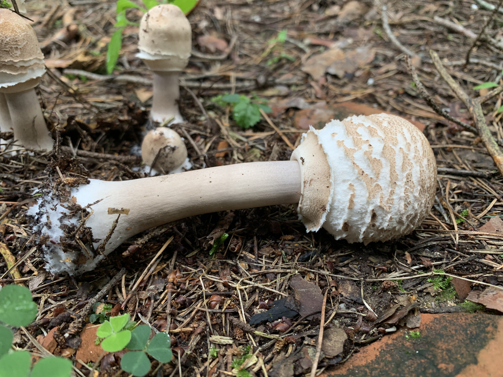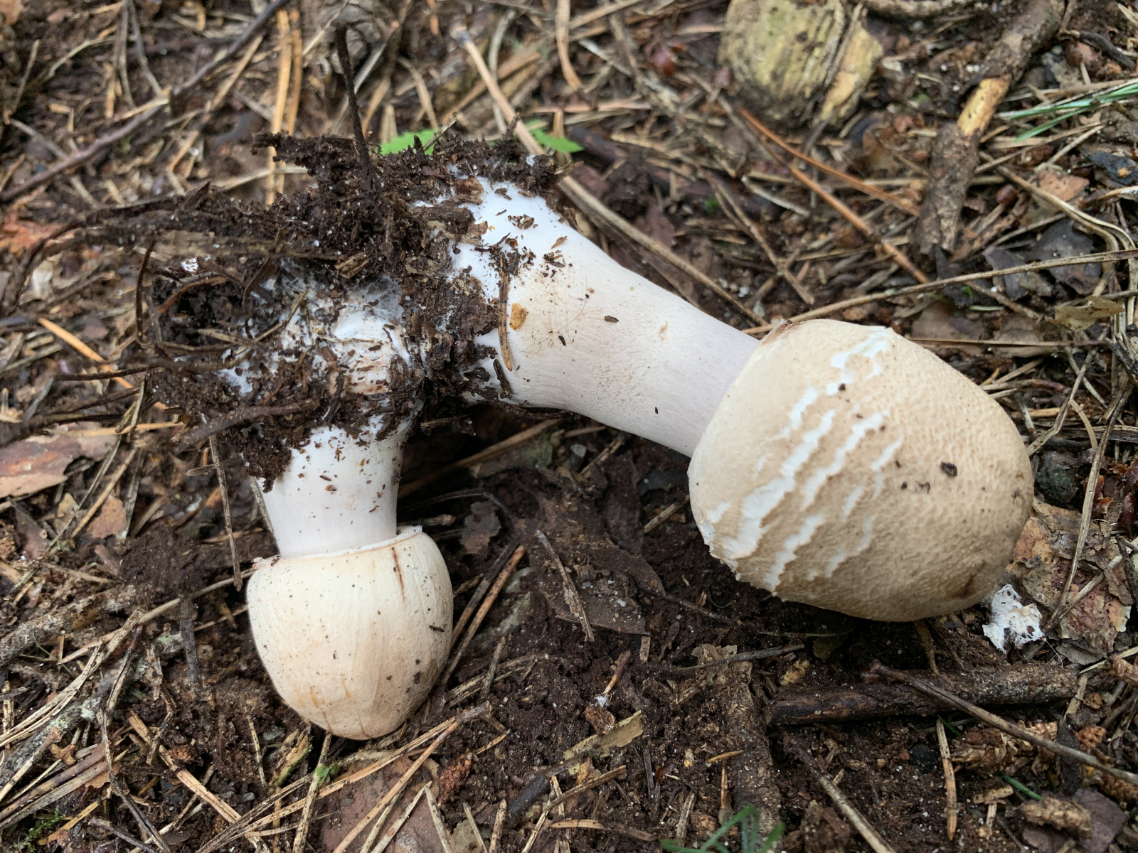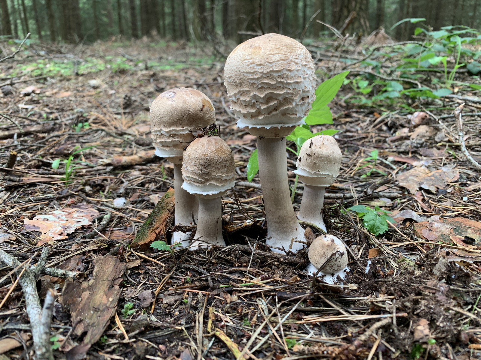Wir sind erst heute dazu gekommen nochmal eine Runde im gleichen Wald zu drehen. Leider waren in der Zwischenzeit wohl ein paar Trampeltiere im Wald unterwegs. Unglaublich, was wir heute an herausgerissenen, zertretenen, zerbröselten und sonst irgendwie untypisch zugerichteten Fruchtkörpern gesehen haben. Leider hat es auch unsere Schirmlinge erwischt, weshalb wir leider nicht wie erhofft brauchbaren Fotos von aufgeschirmten Exemplaren nachliefern können - das ist, was von den zuletzt wunderschön wachsenden Schirmlingen übrig geblieben ist: