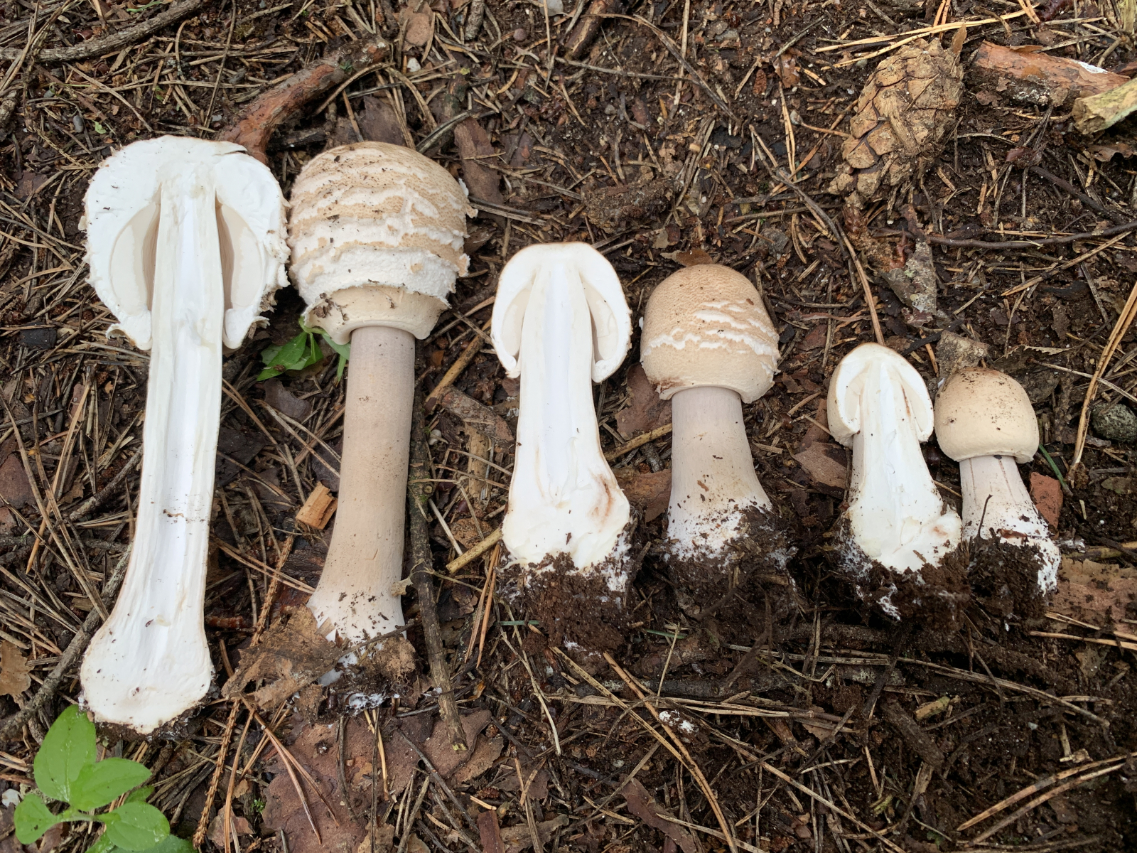 das was Du "streifig" nennst, kann doch gut noch in Schuppen zerreißen. Der erste Wachstumschub war halt horizontal, also reißt die Huthaut erstmal horizontal auf, und es bleiben die gezeigten Bänder über. Wenn ein Dickenwachstum, und oder das Aufschirmen dazukommt, werden die Bänder dann in die klassischen Schollen zerrrissen.