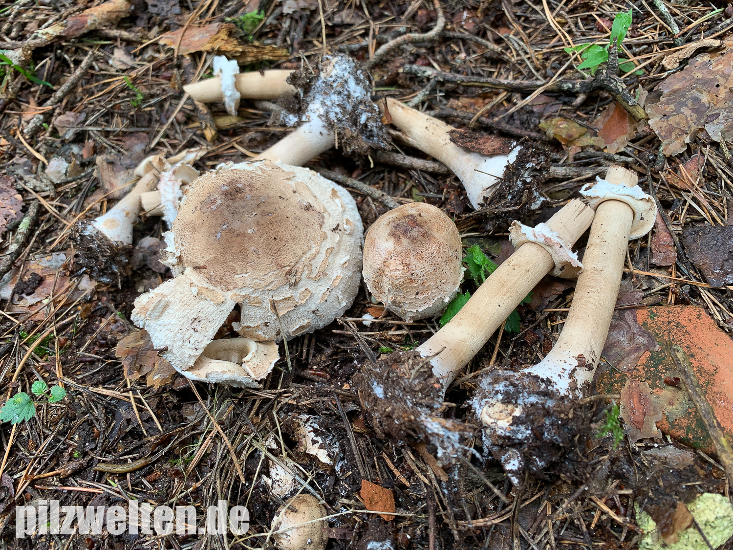 Wir sind erst heute dazu gekommen nochmal eine Runde im gleichen Wald zu drehen. Leider waren in der Zwischenzeit wohl ein paar Trampeltiere im Wald unterwegs. Unglaublich, was wir heute an herausgerissenen, zertretenen, zerbröselten und sonst irgendwie untypisch zugerichteten Fruchtkörpern gesehen haben. Leider hat es auch unsere Schirmlinge erwischt, weshalb wir leider nicht wie erhofft brauchbaren Fotos von aufgeschirmten Exemplaren nachliefern können - das ist, was von den zuletzt wunderschön wachsenden Schirmlingen übrig geblieben ist: