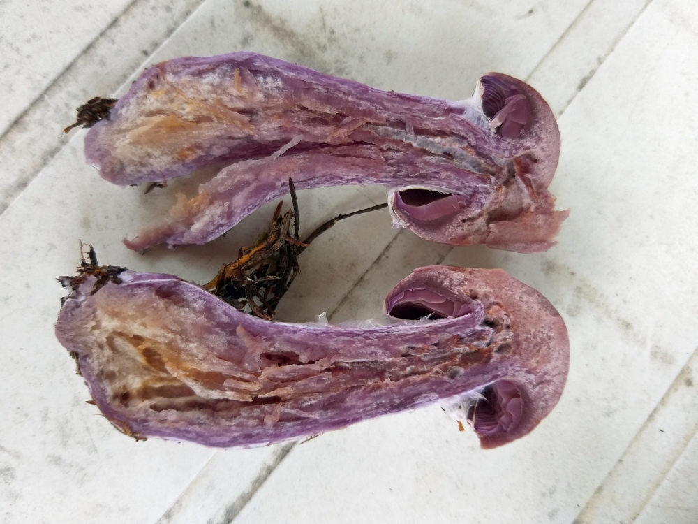 Die Wälder waren voll mit Cortinarien, und da ich die im norddeutschen Flachland selten finde, waren die Meisten neu für mich. So auch dieser, ich halte ihn für den Safranfleischigen Dickfuß / Cortinarius traganus