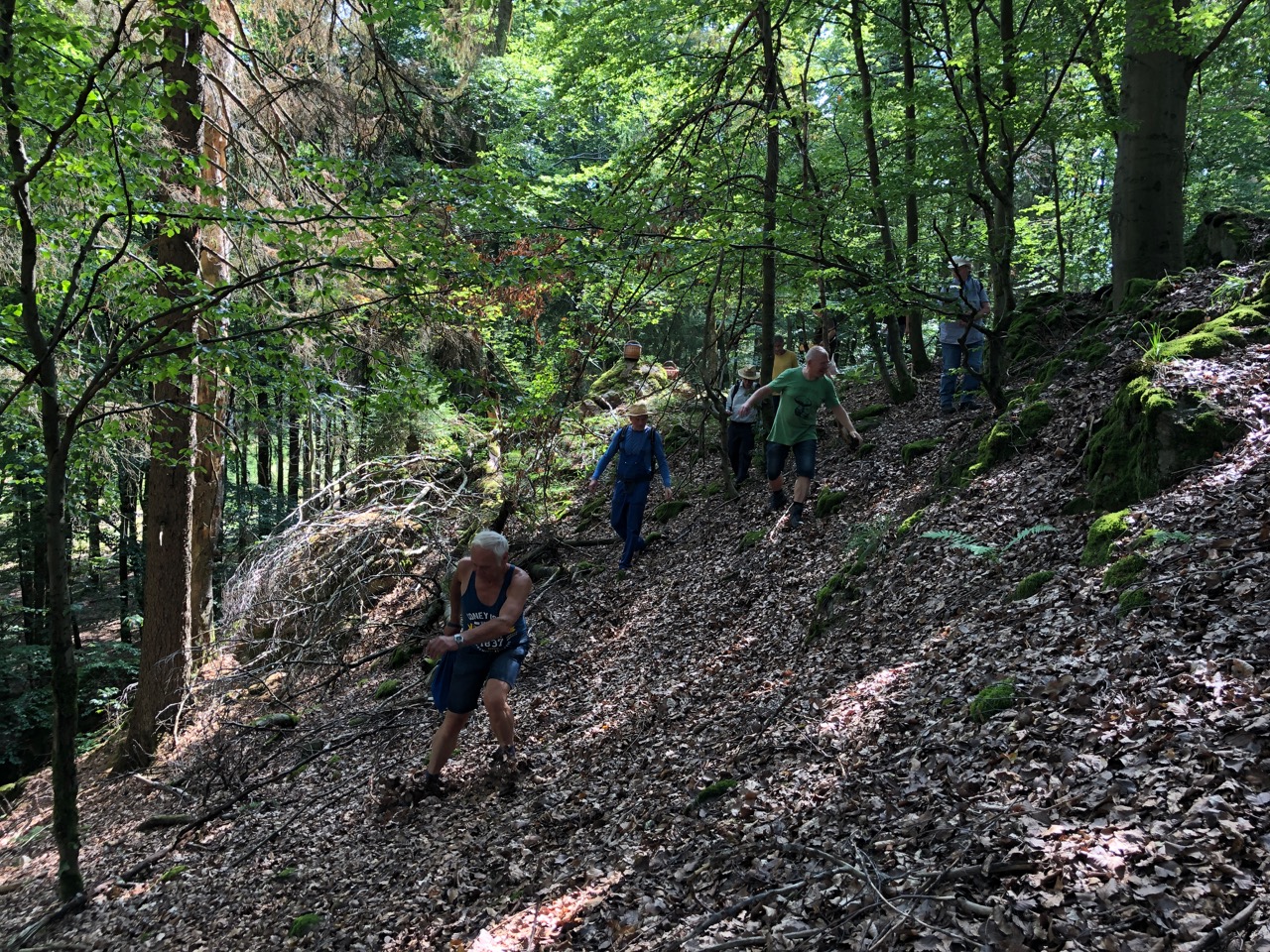 Das ist oben auf dem Berg: Obwohl niemand das heiß ersehnte kühle Bier dort versteckt hatte, machten alle einen recht zufriedenen Eindruck. Aber sie wussten ja noch nicht, dass jetzt erst der akrobatische Teil beginnen sollte.