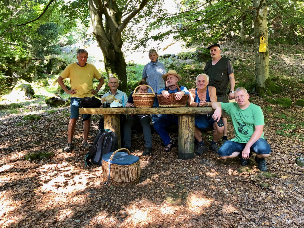 gestern fand die August-Exkursion der ThAM (Thüringer Arbeitsgemeinschaft Mykologie) statt. Es ging nach Katzhütte auf den Kieslerstein. Was im Januar bei der Jahresplanung niemand weiß ist, wie heiß es im August ist und ob es Pilze geben wird. Die Antwort auf die erste Frage war: leider ja und auf die zweite glücklicherweise auch ja. Es hatte am Mittwoch einen kräftigen Schauer (geschätzt 30 Liter pro m2) gegeben und demzufolge war die Ausbeute gar nicht schlecht. Auf meiner inoffiziellen vorläufigen Fundliste stehen 90 Namen und einige kommen noch hinzu, wenn die noch namenlosen Bestimmlinge den Experten ihre Geheimnisse preisgegeben haben.