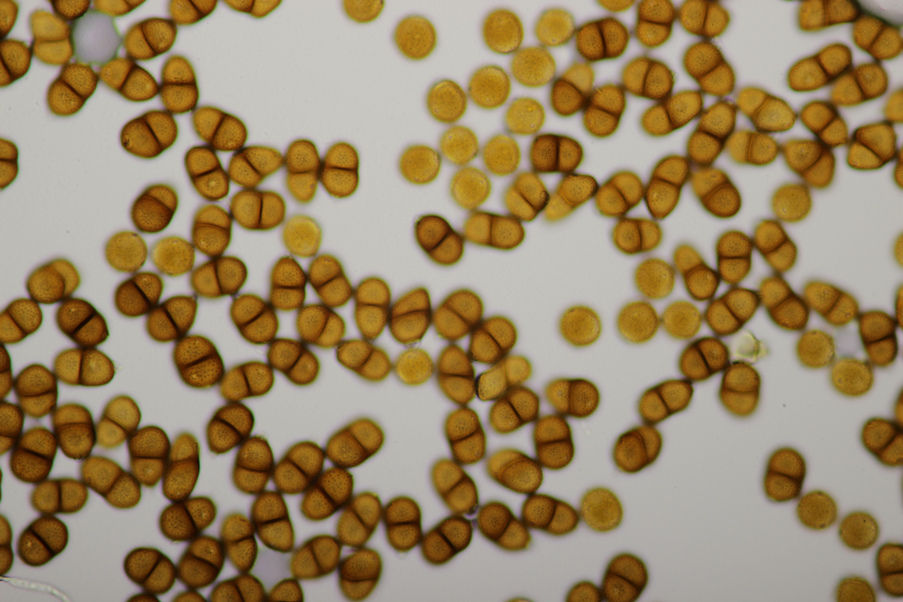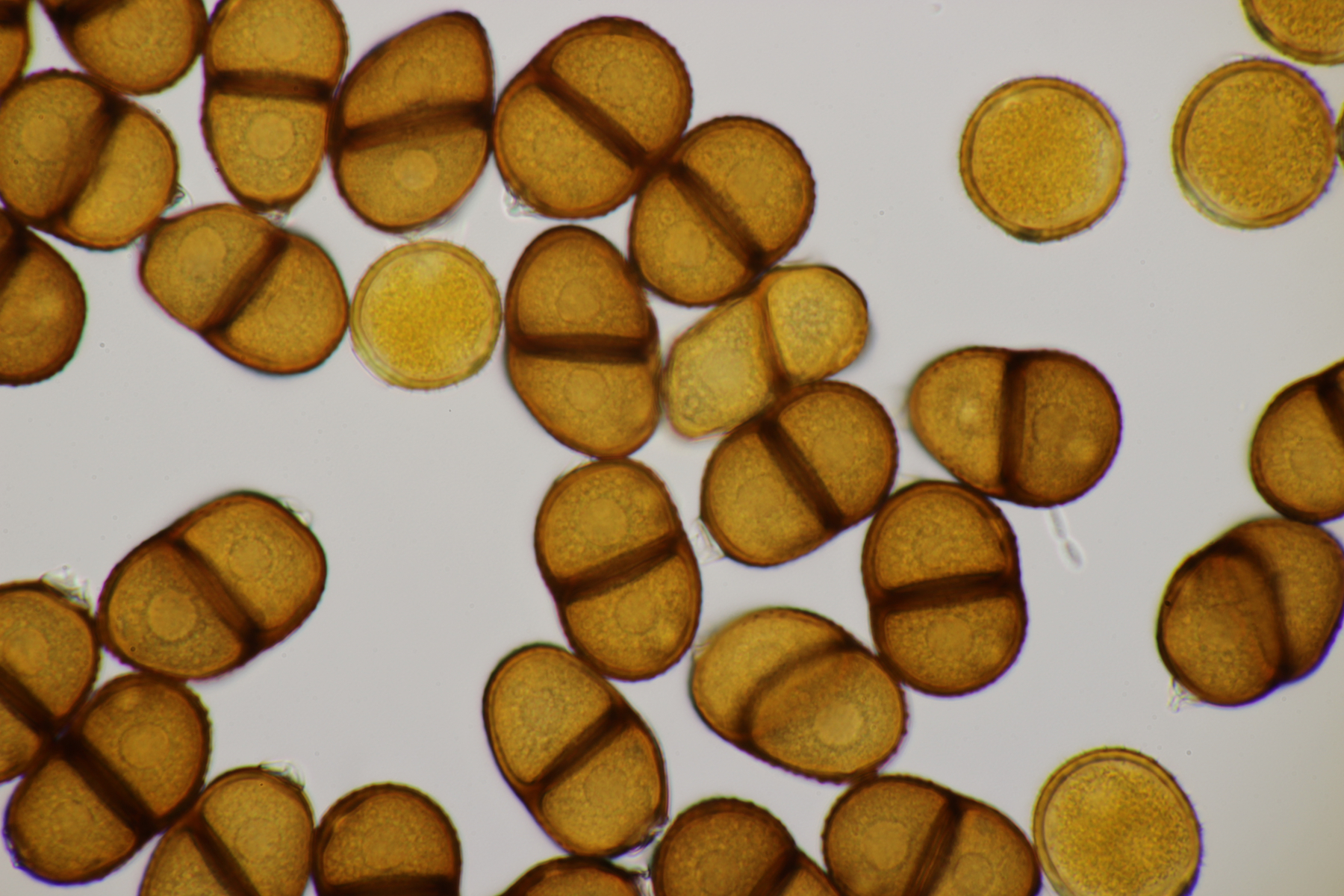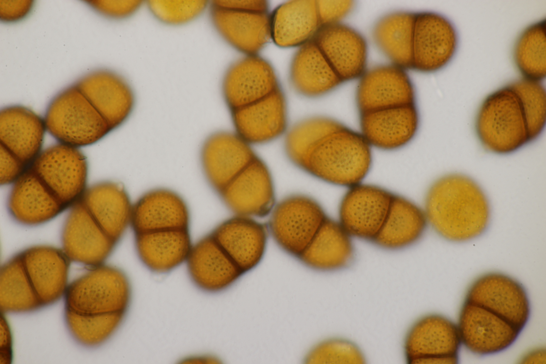 Sporen (6.4 +- 0.4) µm x (5.2 +- 0.3) µm, Q=1.2