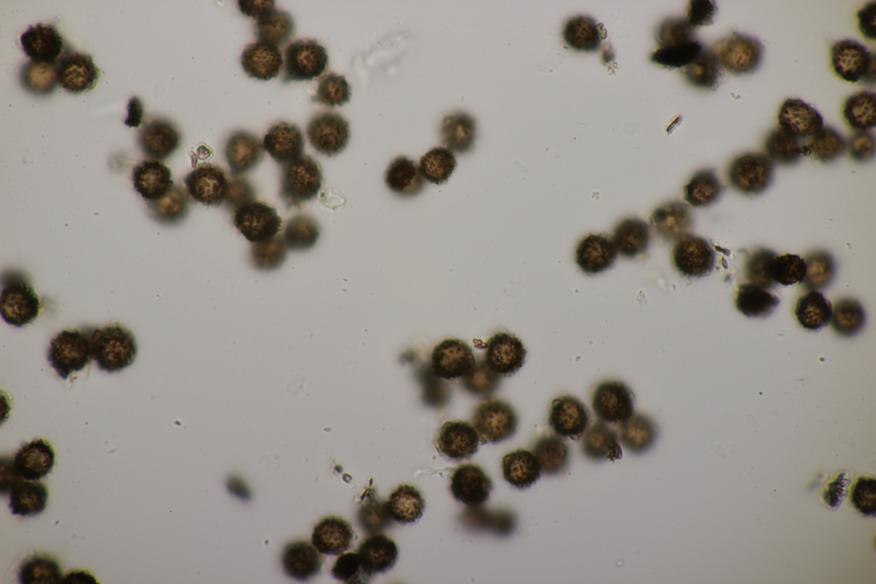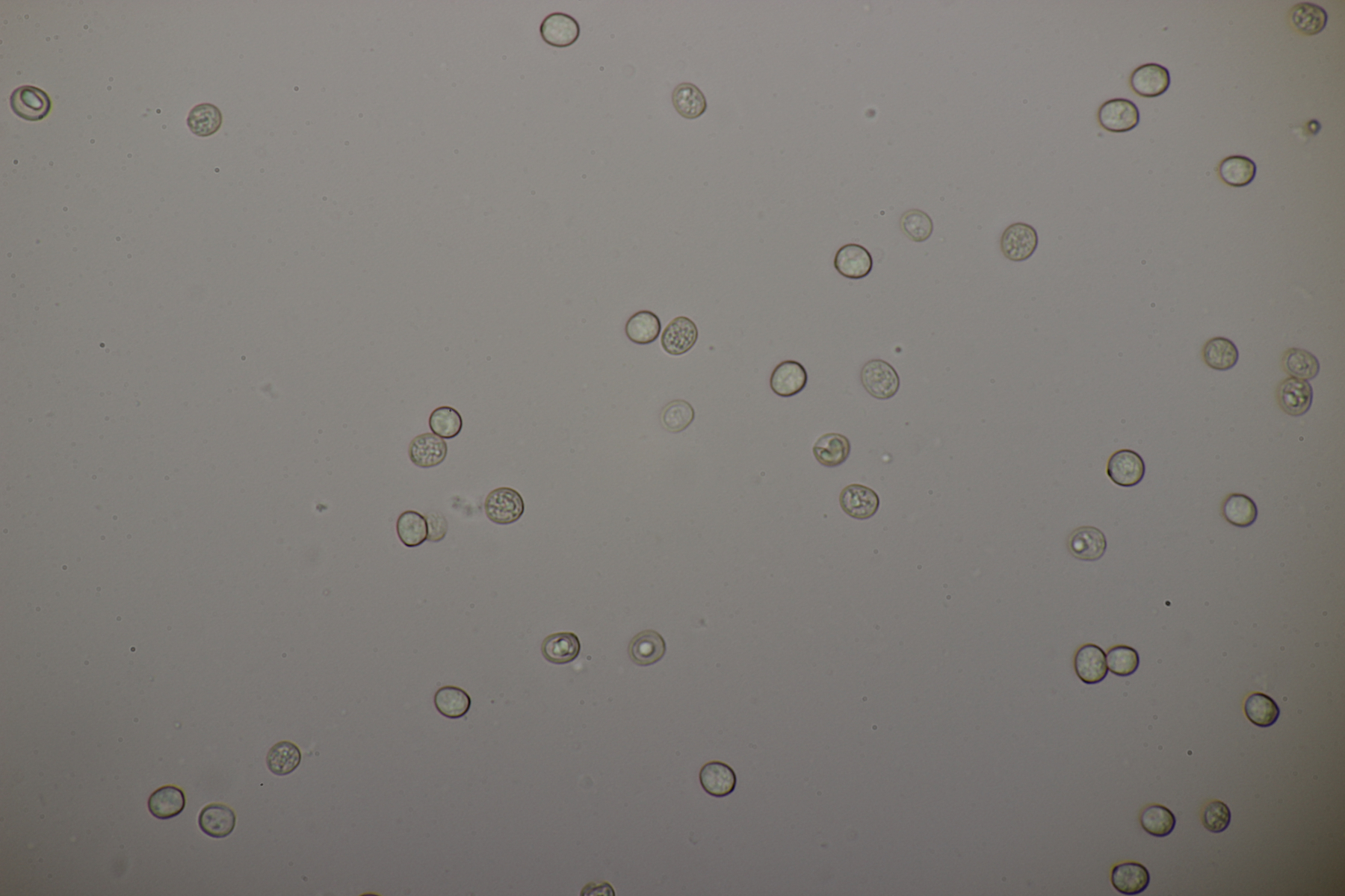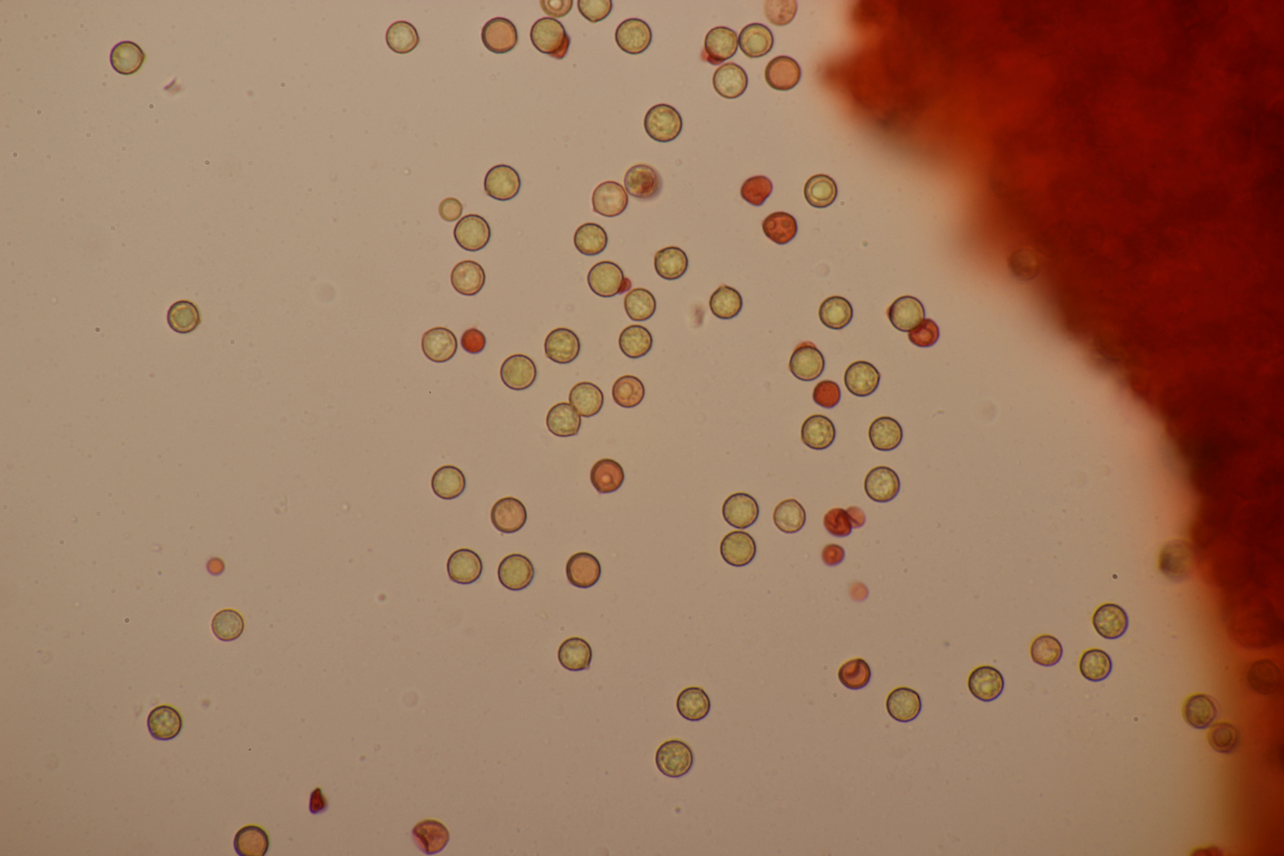 Sporen (6.4 +- 0.4) µm x (5.2 +- 0.3) µm, Q=1.2