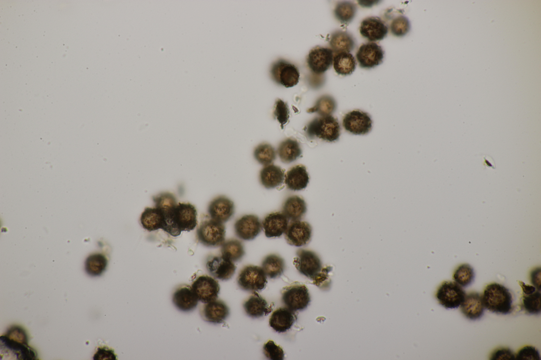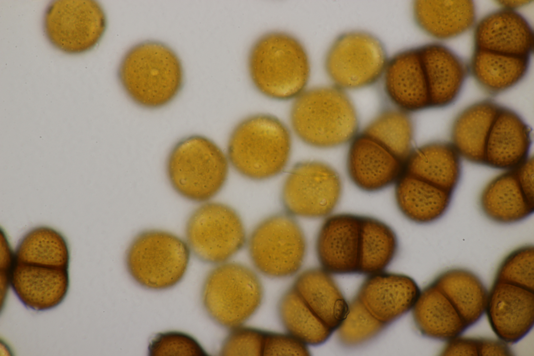 Sporen (6.4 +- 0.4) µm x (5.2 +- 0.3) µm, Q=1.2