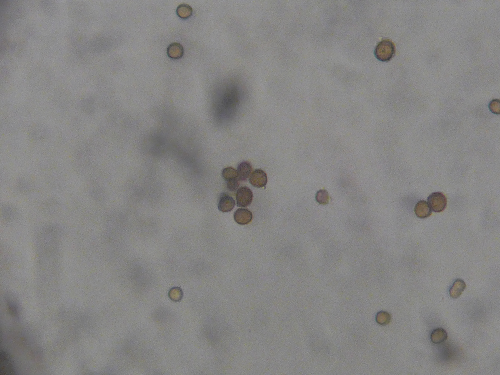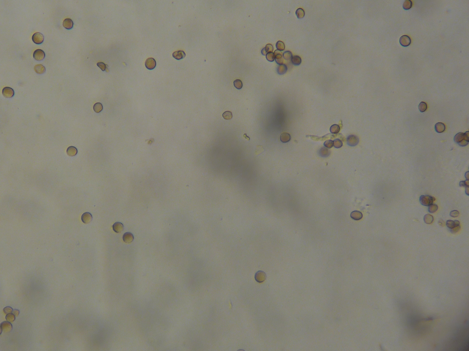 Die Sporen sind unspektakulär, wie Ustilago-Sporen meist aussehen. Sie haben eine "dicke" und eine "dünne" Seite. Unterm Mikro sieht das ein bisschen so wie ein Halbmond aus. Dort wo die "dünne" Seite ist, werden die Sporen auskeimen.