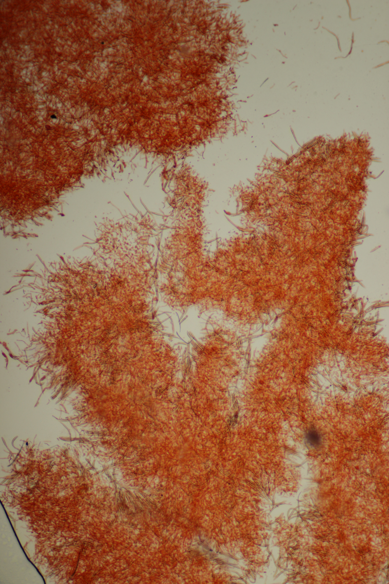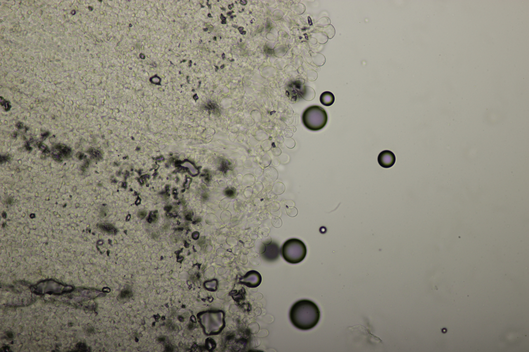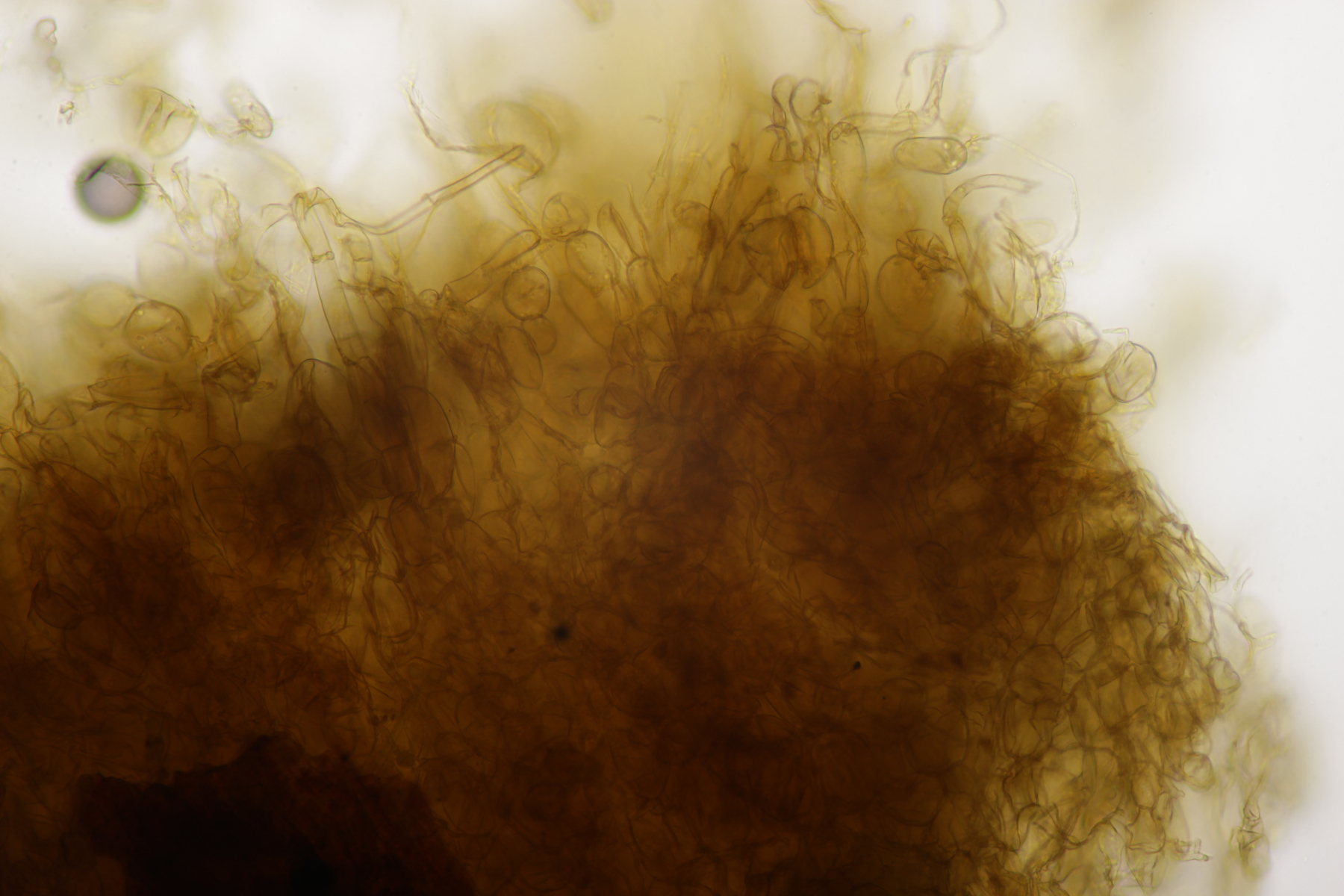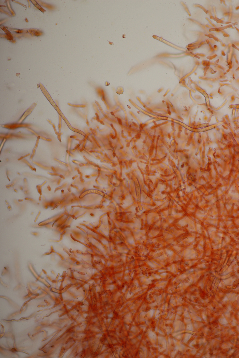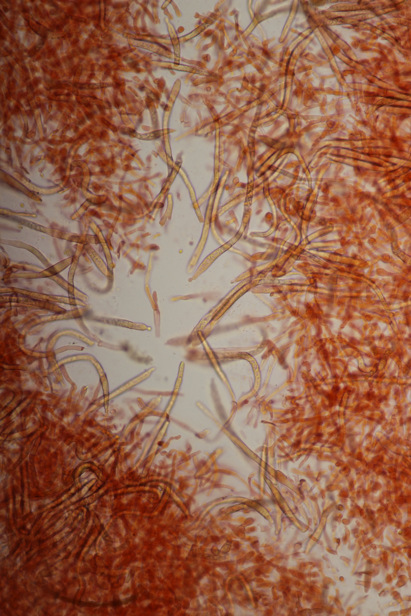 Huthaut in Sulfovanillin. Zystiden grau gefärbt.