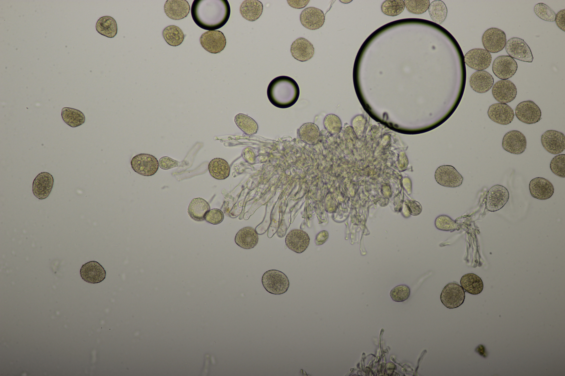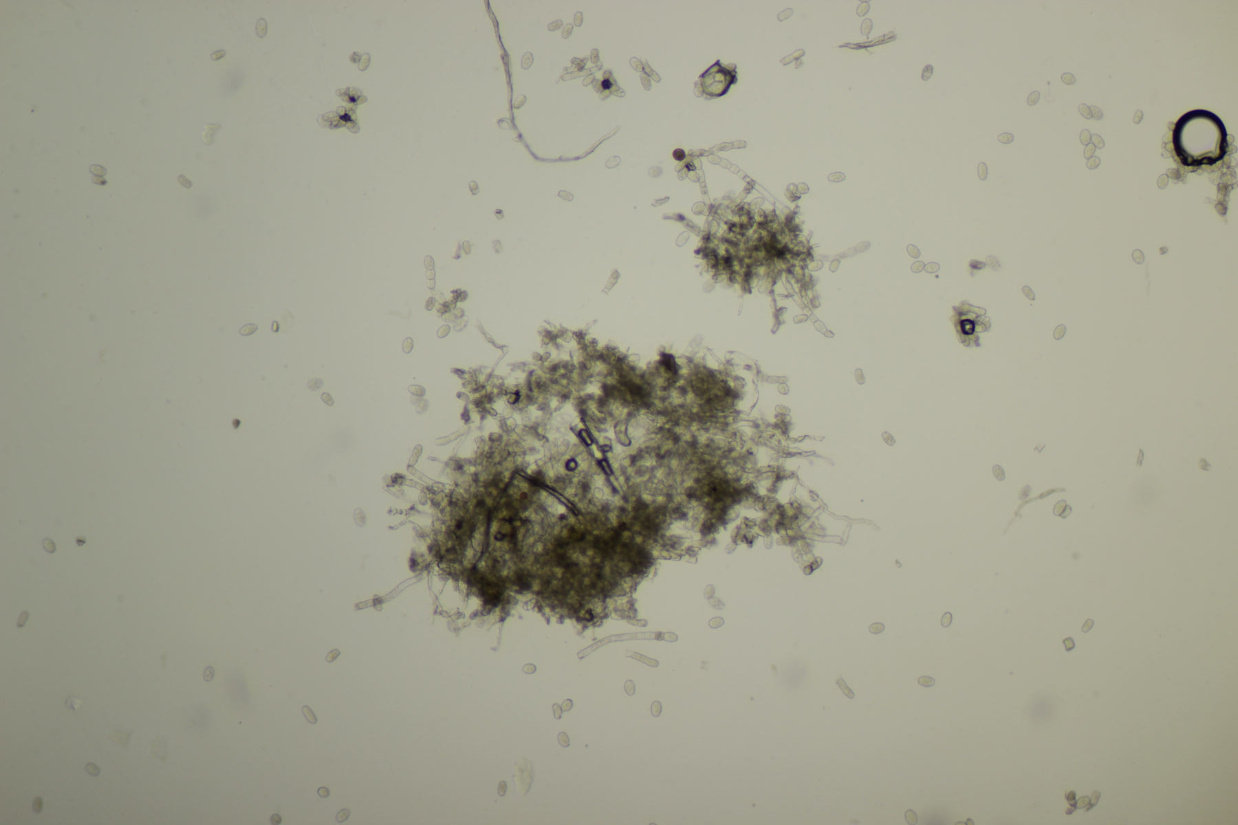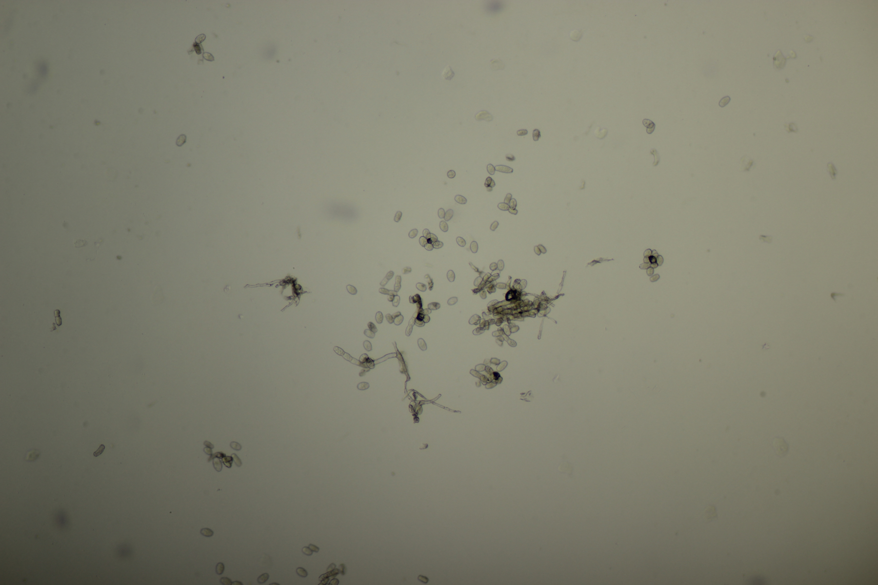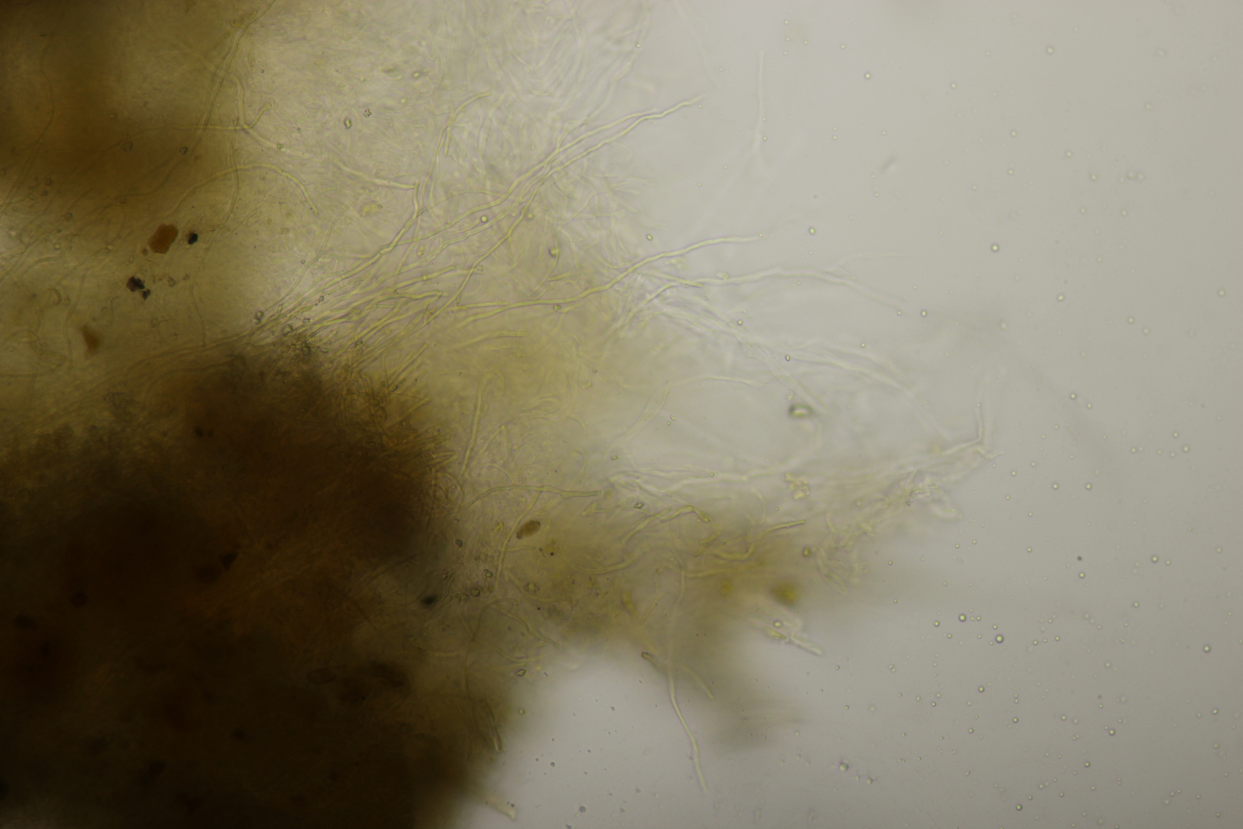 Die berühmten Rhizomorphen in KOH 3%. Wie man sieht, sieht man nicht viel. Skeletthyphen sind aber wohl erkennbar
