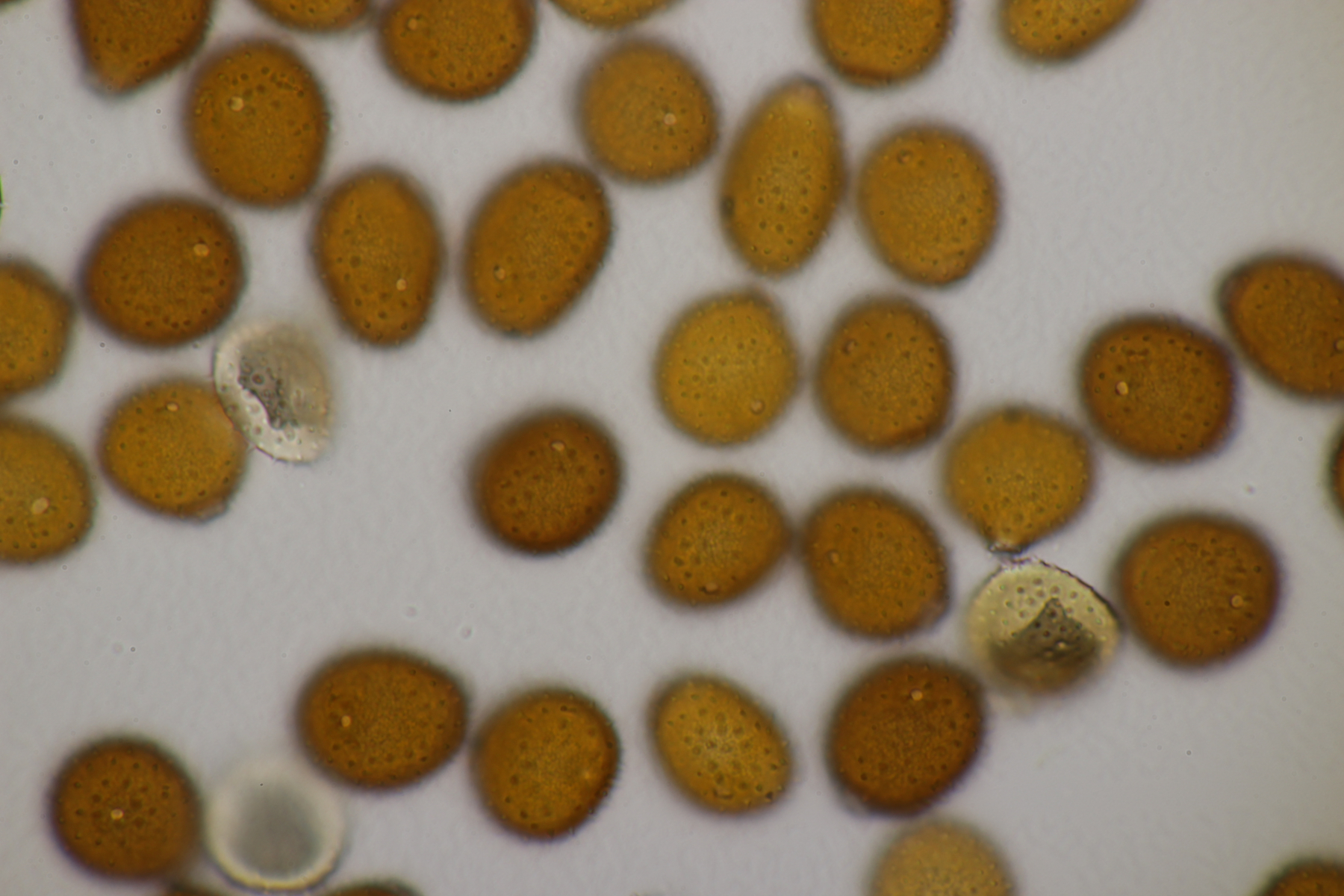 Sporenpulverfarbe IIIa (IIc?), Sporengröße (8.0 +- 0.3) µm x (6.8 +- 0.2) µm