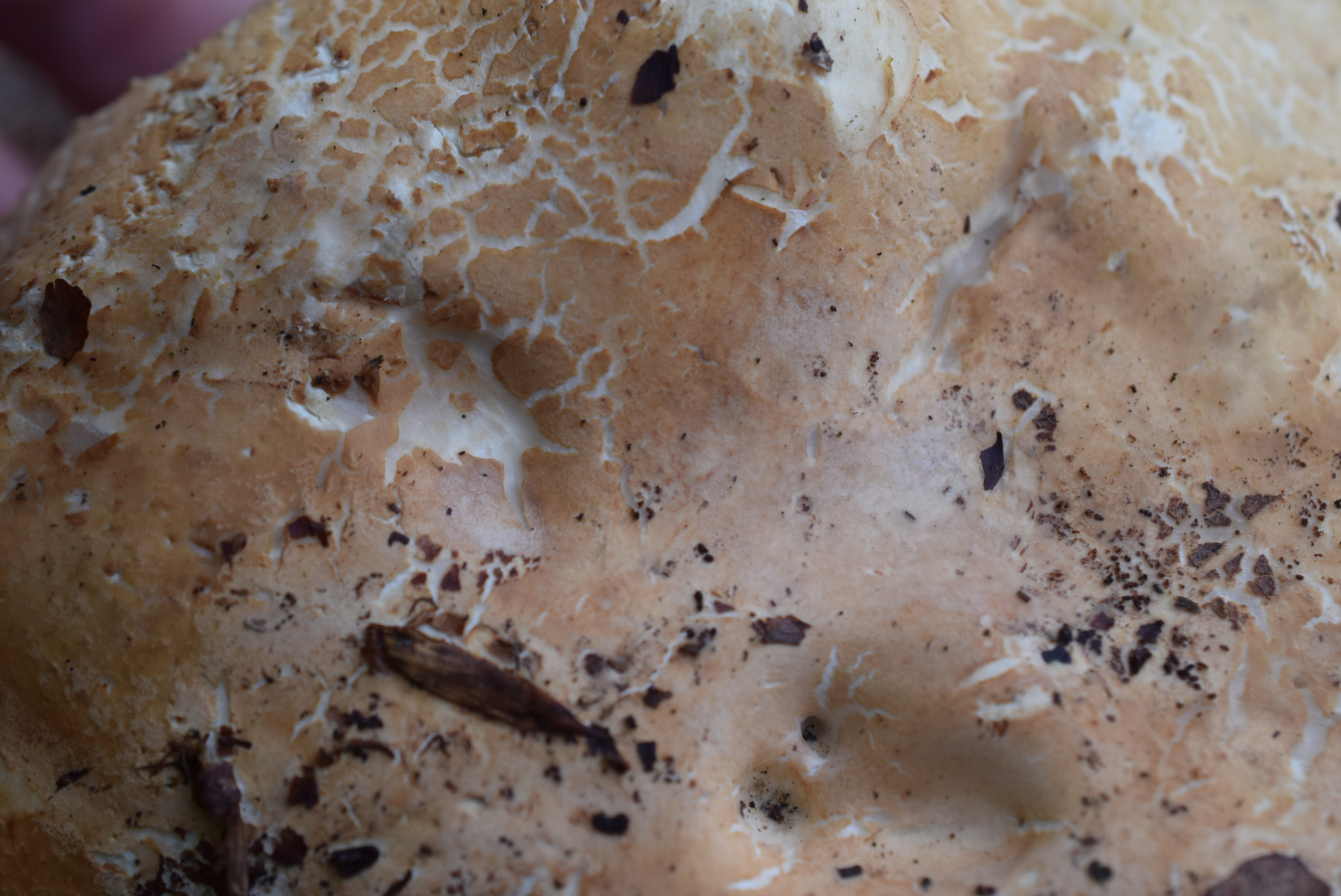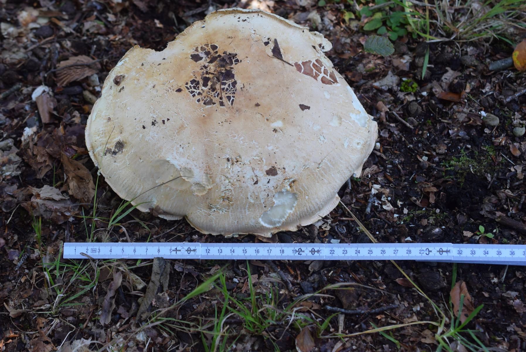 Tricholoma acerbum ist schon kleiner, aber Tricholoma roseoacerbum bildet solche Riesenbrocken von Fruchtkörpern. Ticholoma colossus natürlich auch, aber die beiden bilden Mykorrrhiza mit Nadelbäumen, die Struktur der Hutoberfläche ist etwas anders (recht deutlich eingewachsen radialfaserig) und Tricholoma colossus hat zudem eine +/- deutlich ausgeprägte pseudoringzone am Stiel.