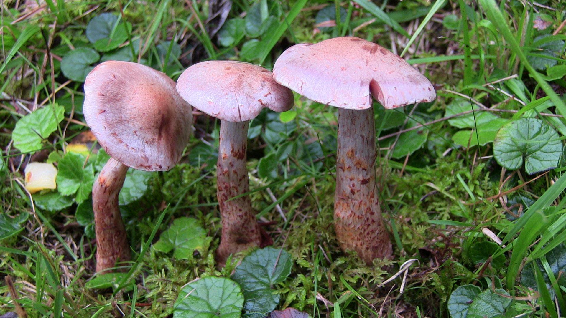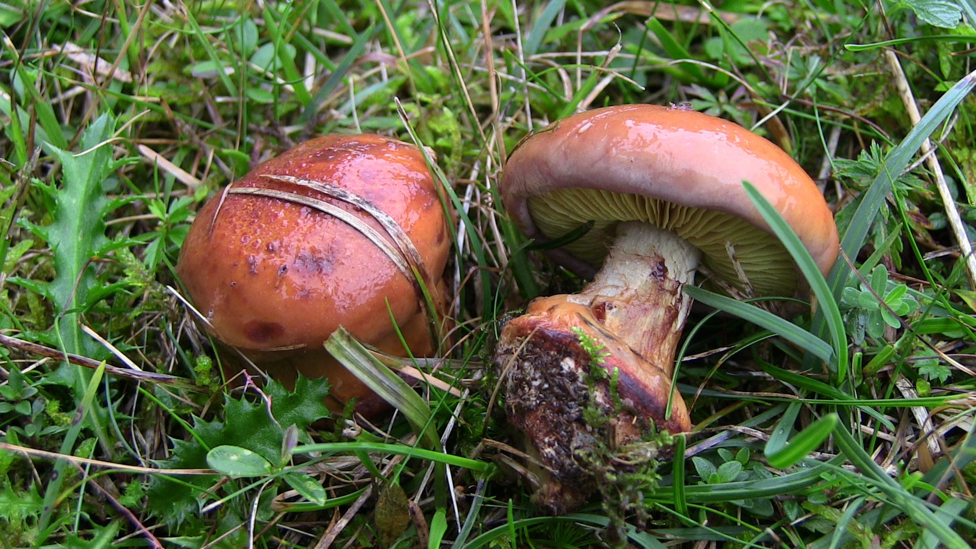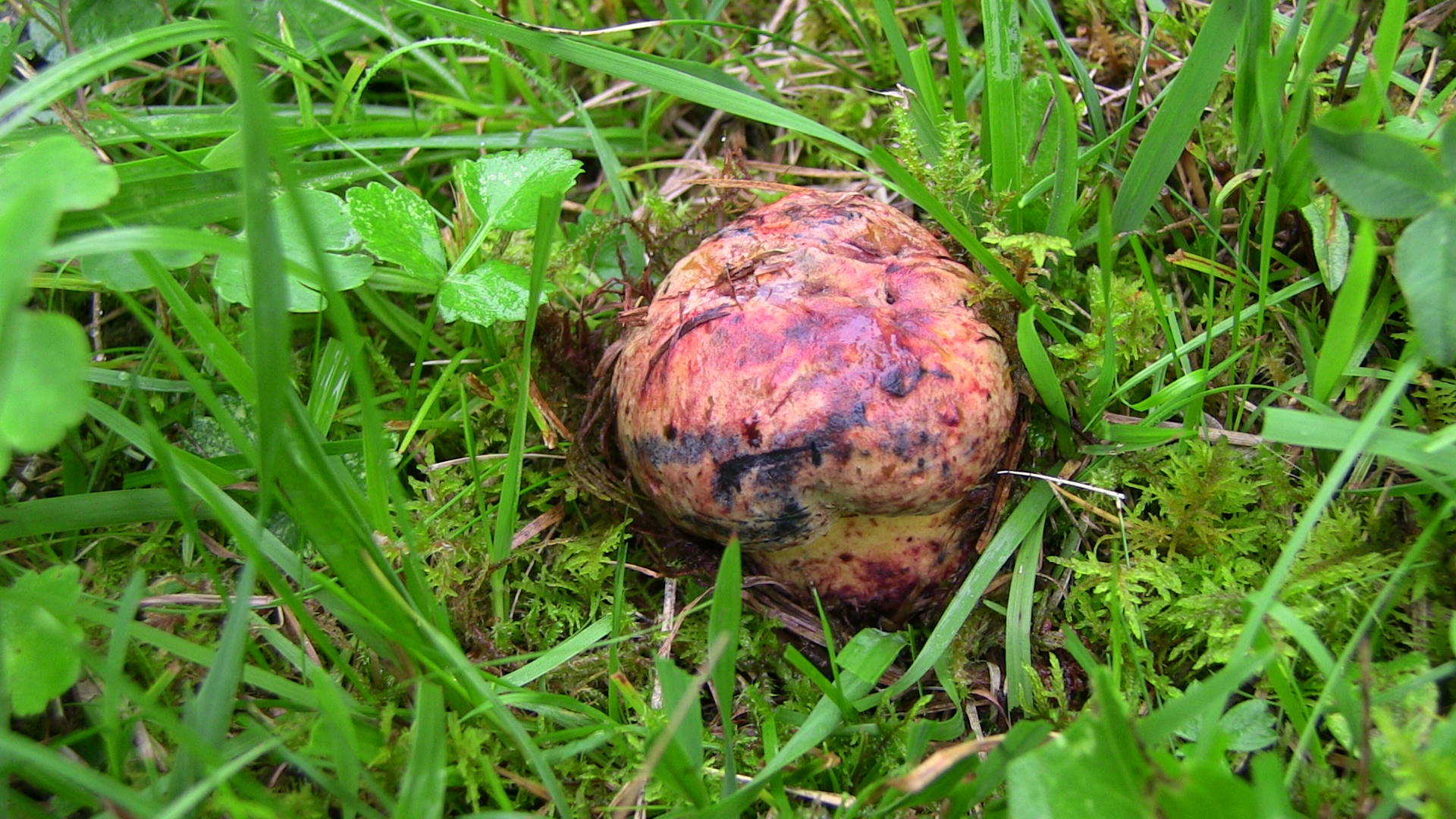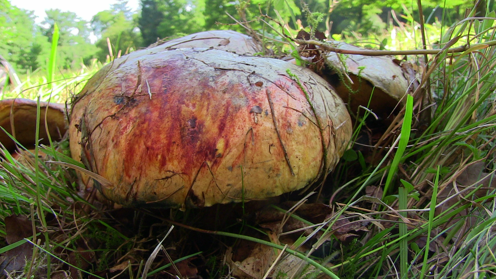Weiterhin wuchsen auf der Wiese, die von Fichtenwald mit eingestreuten Birken umgeben ist: Cortinarius spilomeus, Cortinarius odorifer, Imperator torosus, Caloboletus calopus, Rubroboletus rubrosanguineus, Hygrophorus erubescens, Catathelasma imperiale, Suillellus luridus, Lactarius picinus und eben noch so manches, was ich ohne die Fruchtkörper zu entnehmen nicht bestimmen konnte (das blieb wie praktisch alles andere auch stehen!).