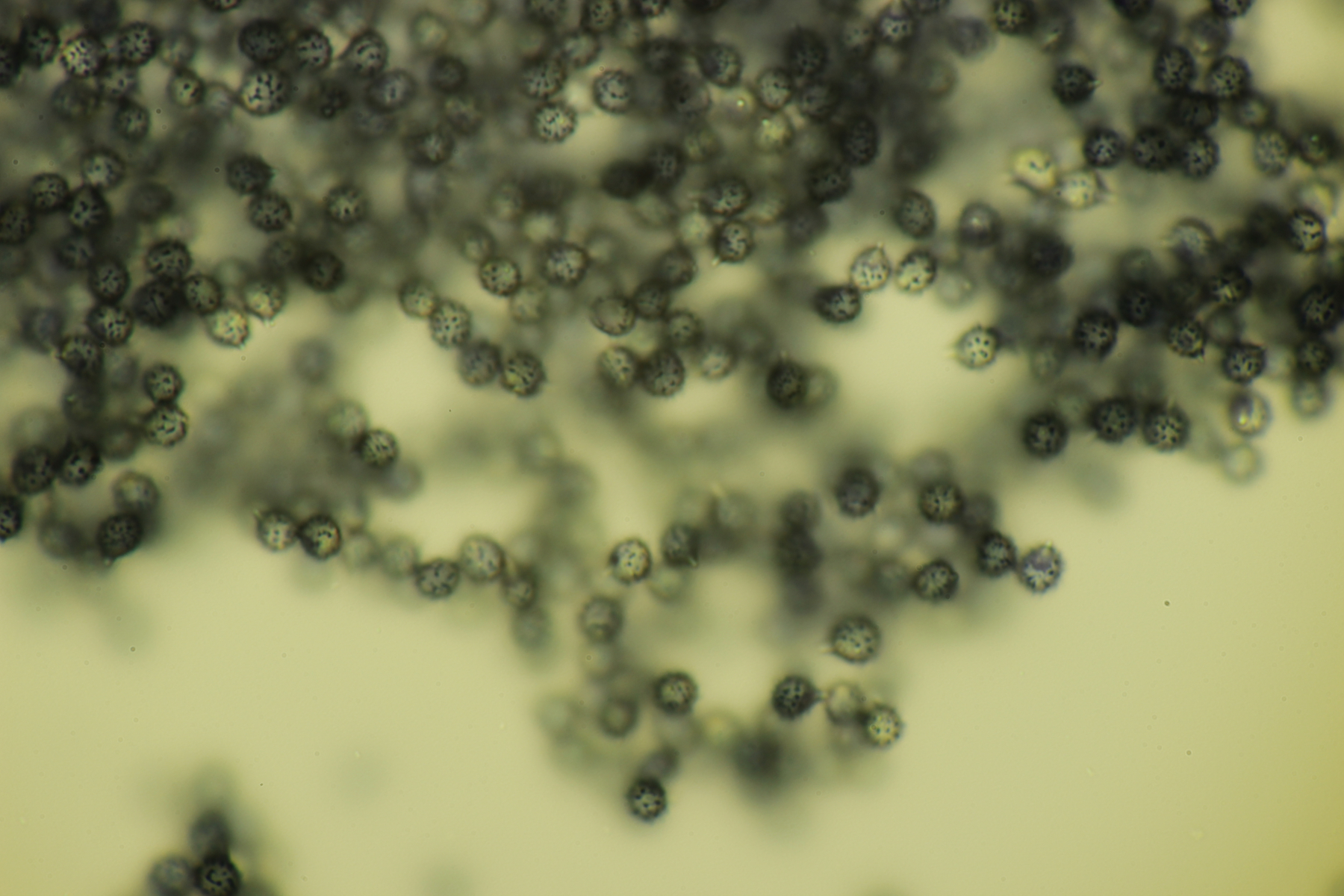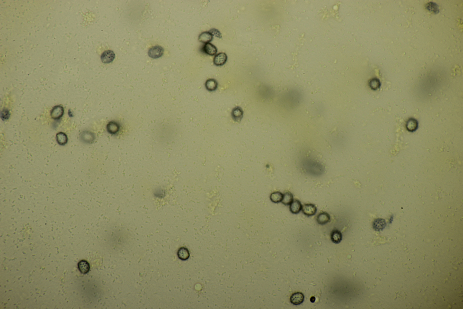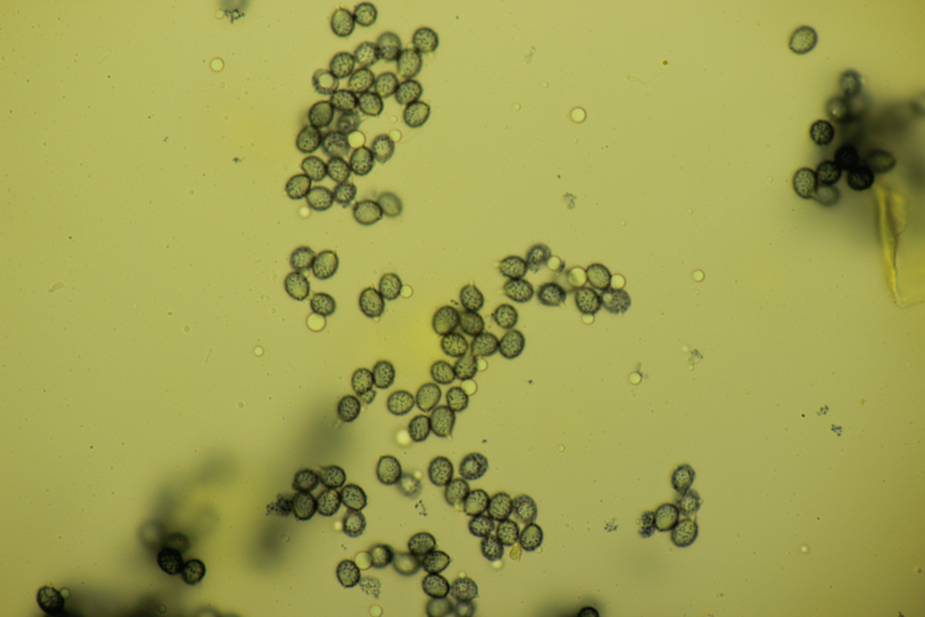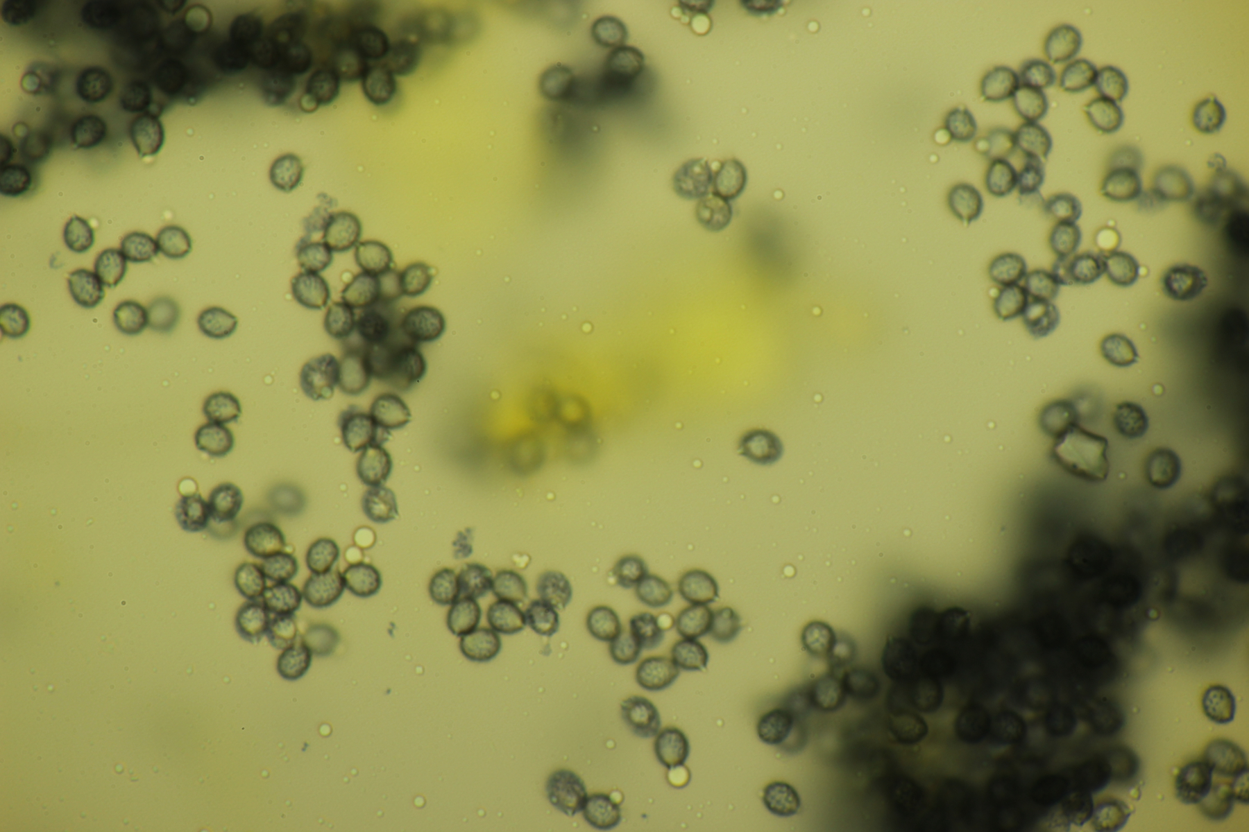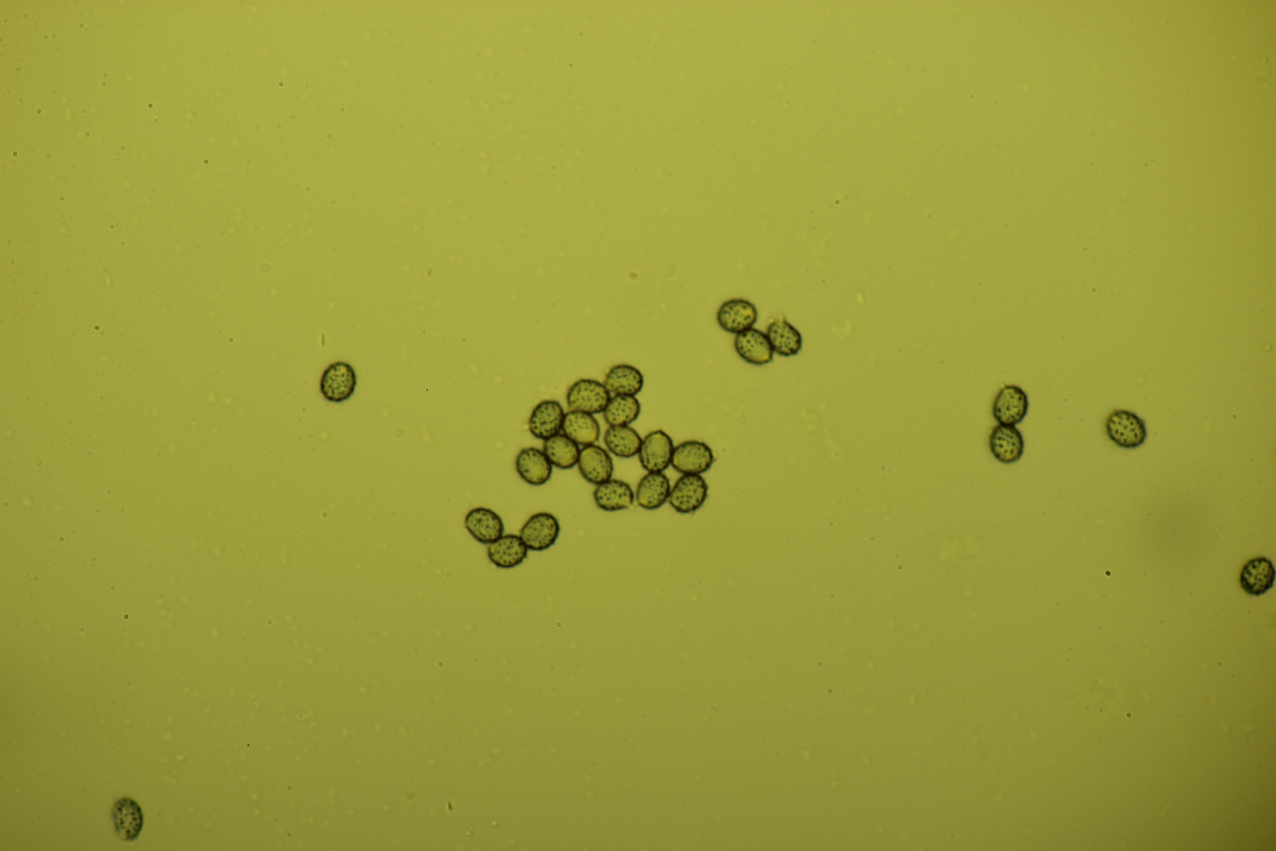 Sporengröße (6.6 +- 0.6) µm x (5.5 +- 0.4) µm. Auffallend war, daß es neben einigen sehr großen Sporen auch einige sehr kleine Sporen gab (Länge von 5.9 bis 8.0 µm, Breite von 4.9 bis 6.1 µm), entsprechend die recht große Standardabweichung
