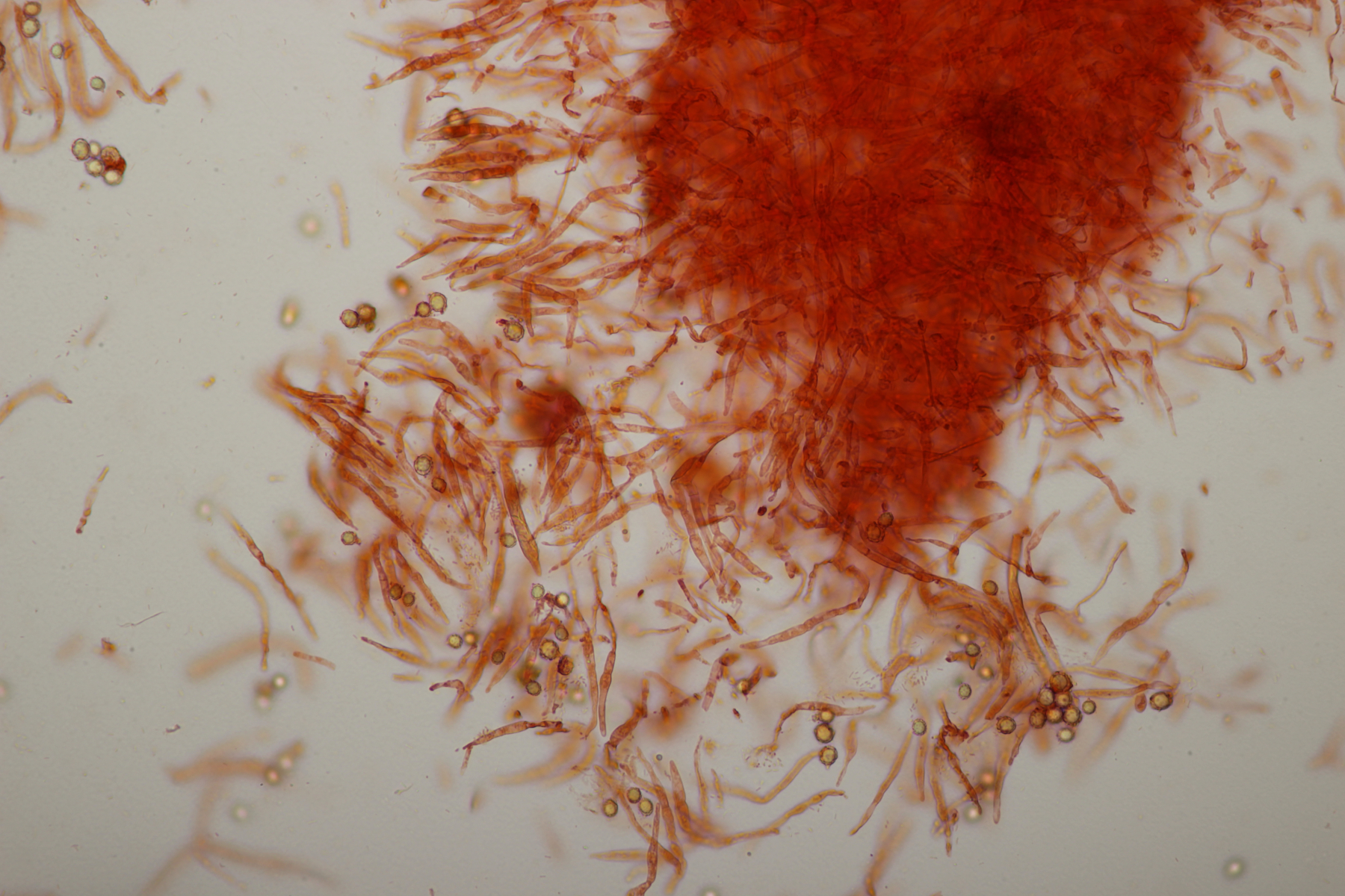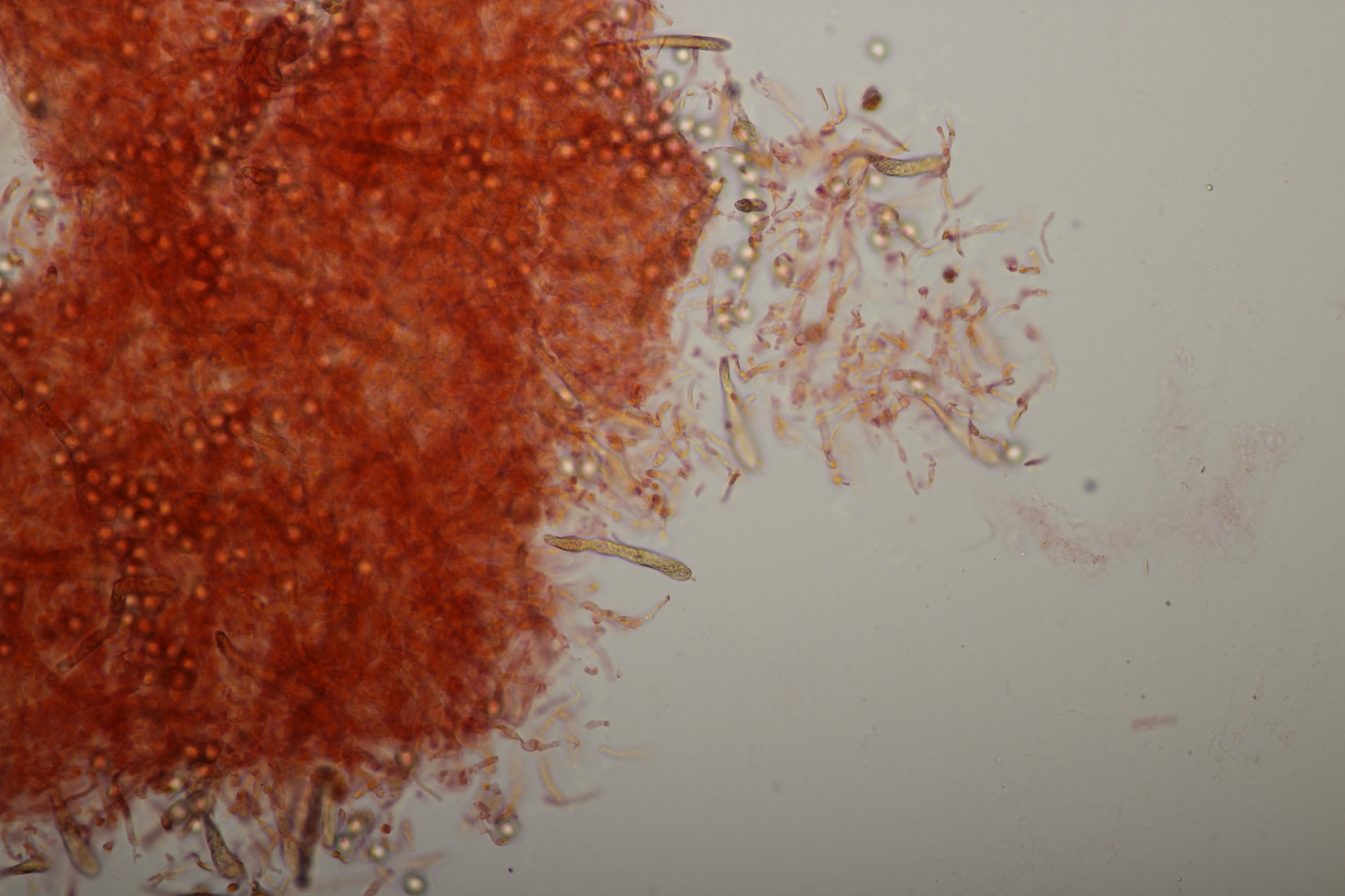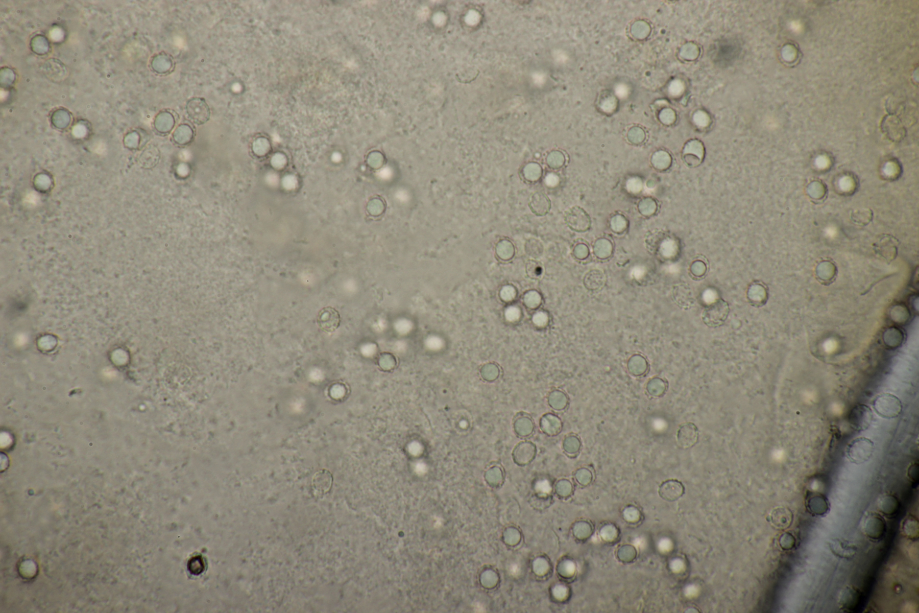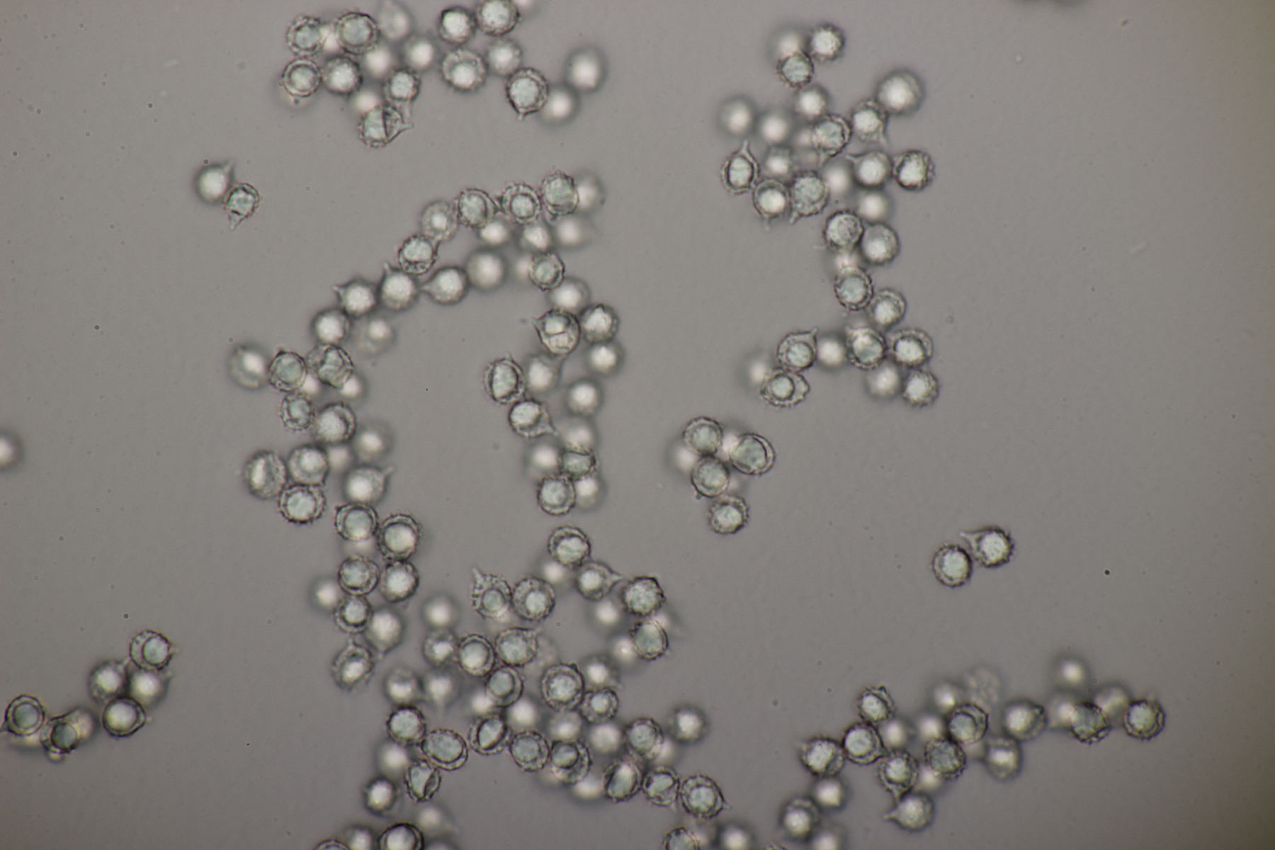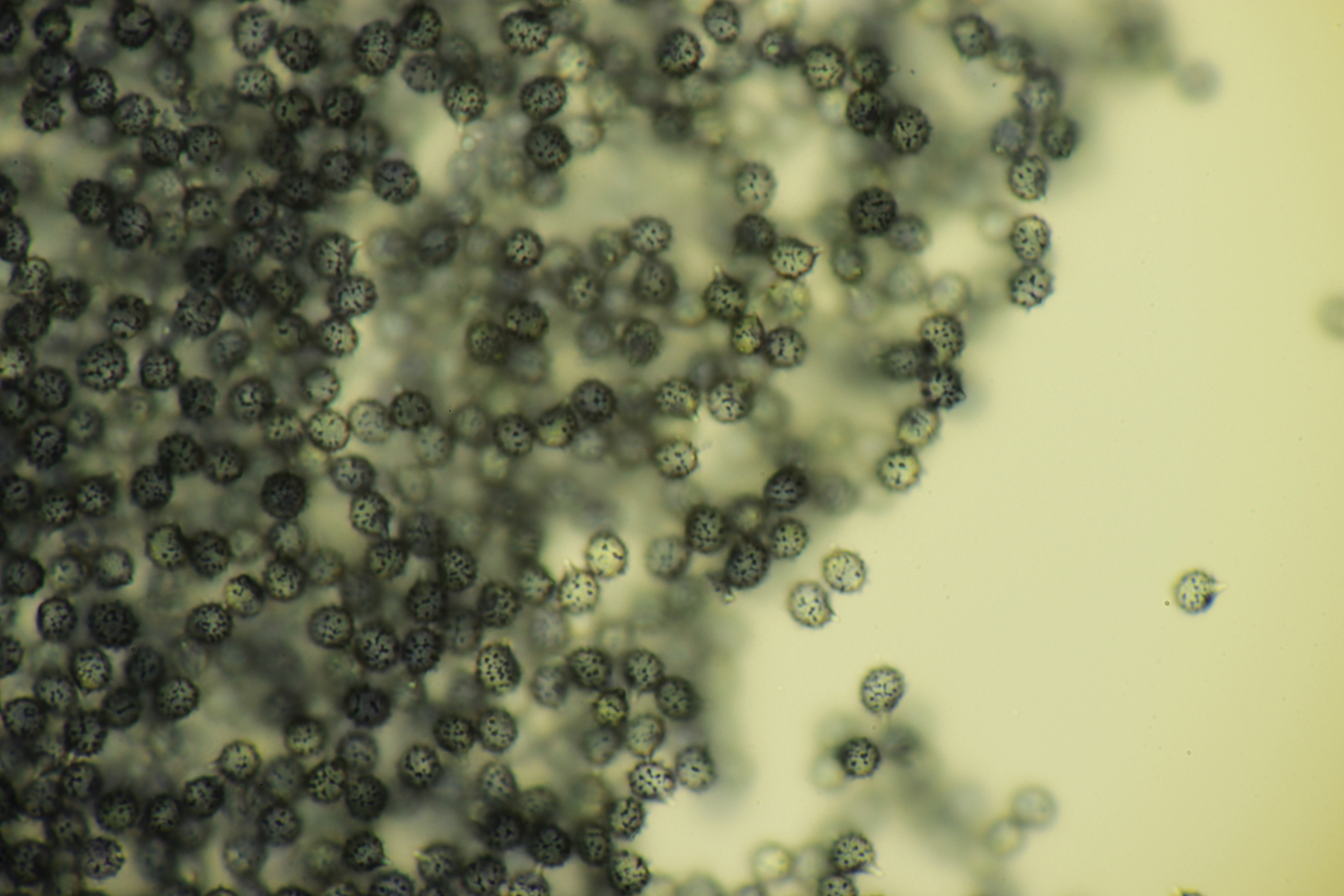 Sporengröße (6.6 +- 0.6) µm x (5.5 +- 0.4) µm. Auffallend war, daß es neben einigen sehr großen Sporen auch einige sehr kleine Sporen gab (Länge von 5.9 bis 8.0 µm, Breite von 4.9 bis 6.1 µm), entsprechend die recht große Standardabweichung
