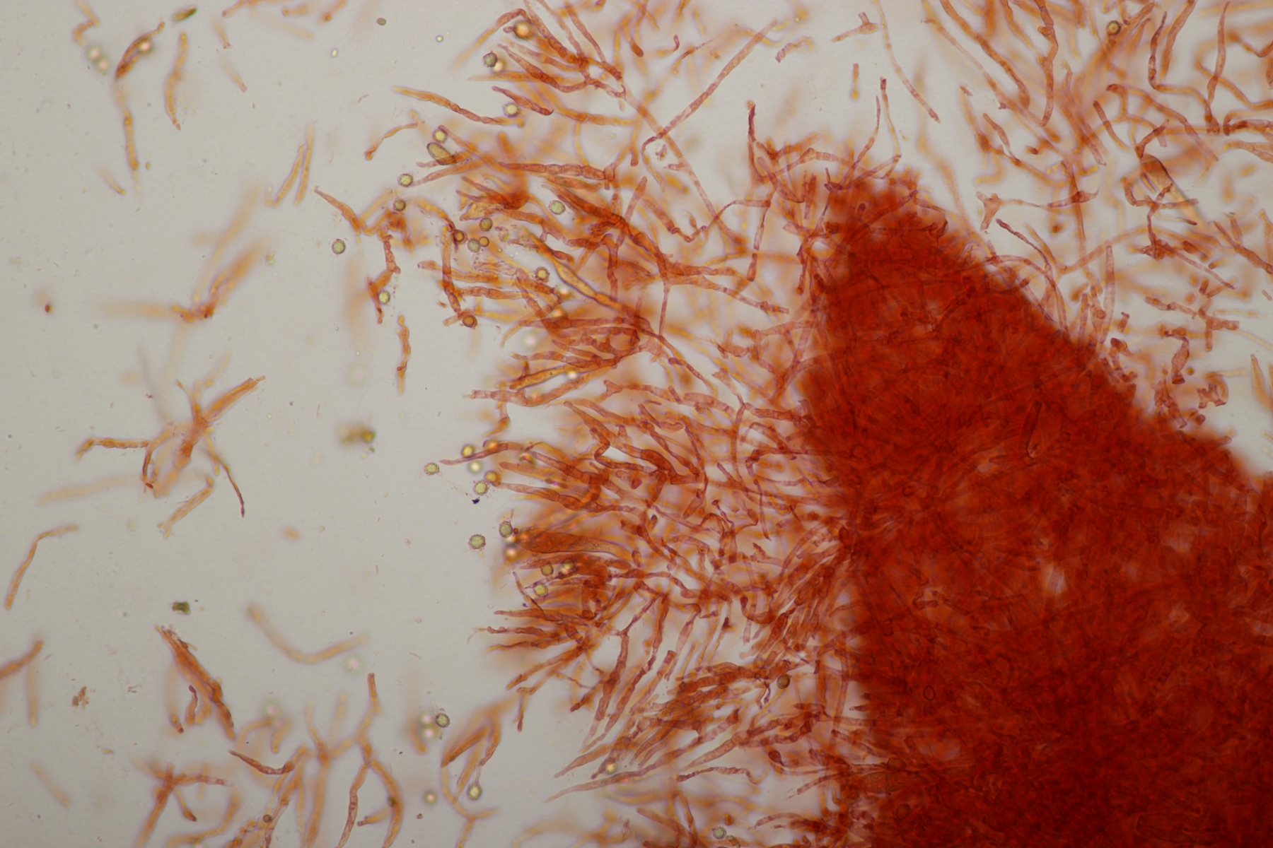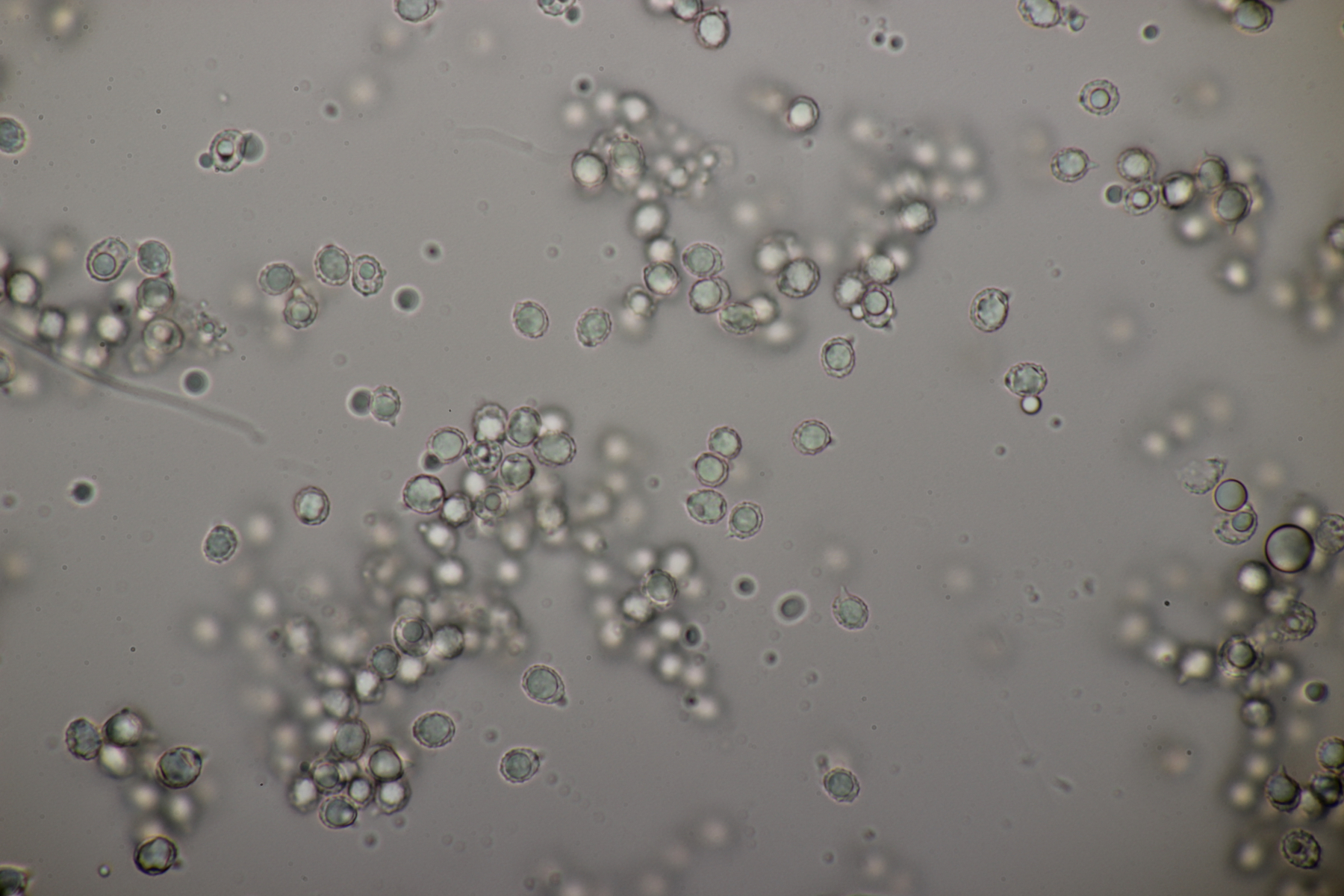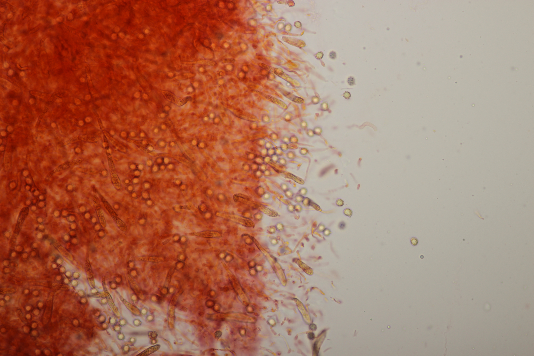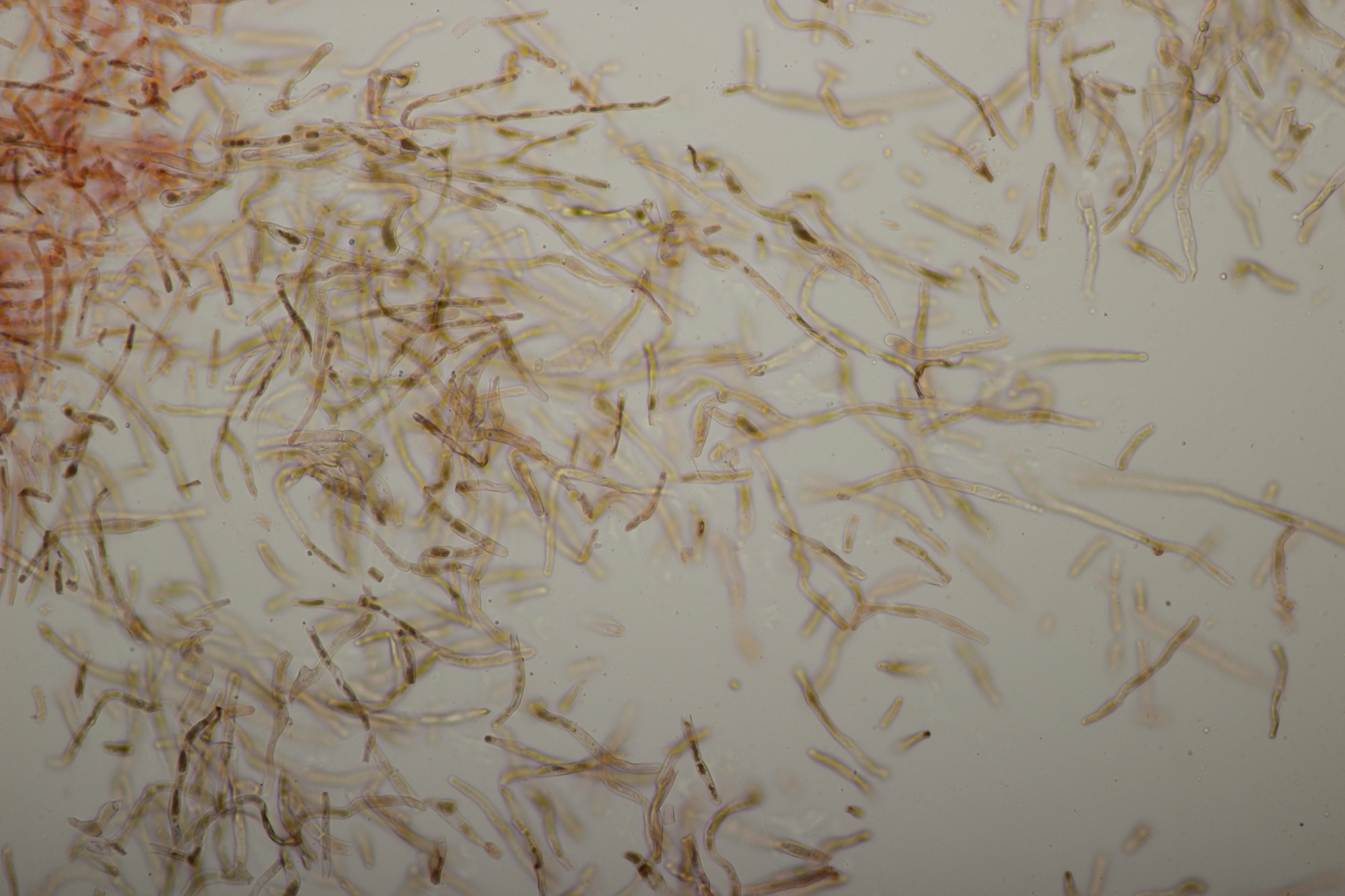 Sporengröße (6.6 +- 0.6) µm x (5.5 +- 0.4) µm. Auffallend war, daß es neben einigen sehr großen Sporen auch einige sehr kleine Sporen gab (Länge von 5.9 bis 8.0 µm, Breite von 4.9 bis 6.1 µm), entsprechend die recht große Standardabweichung