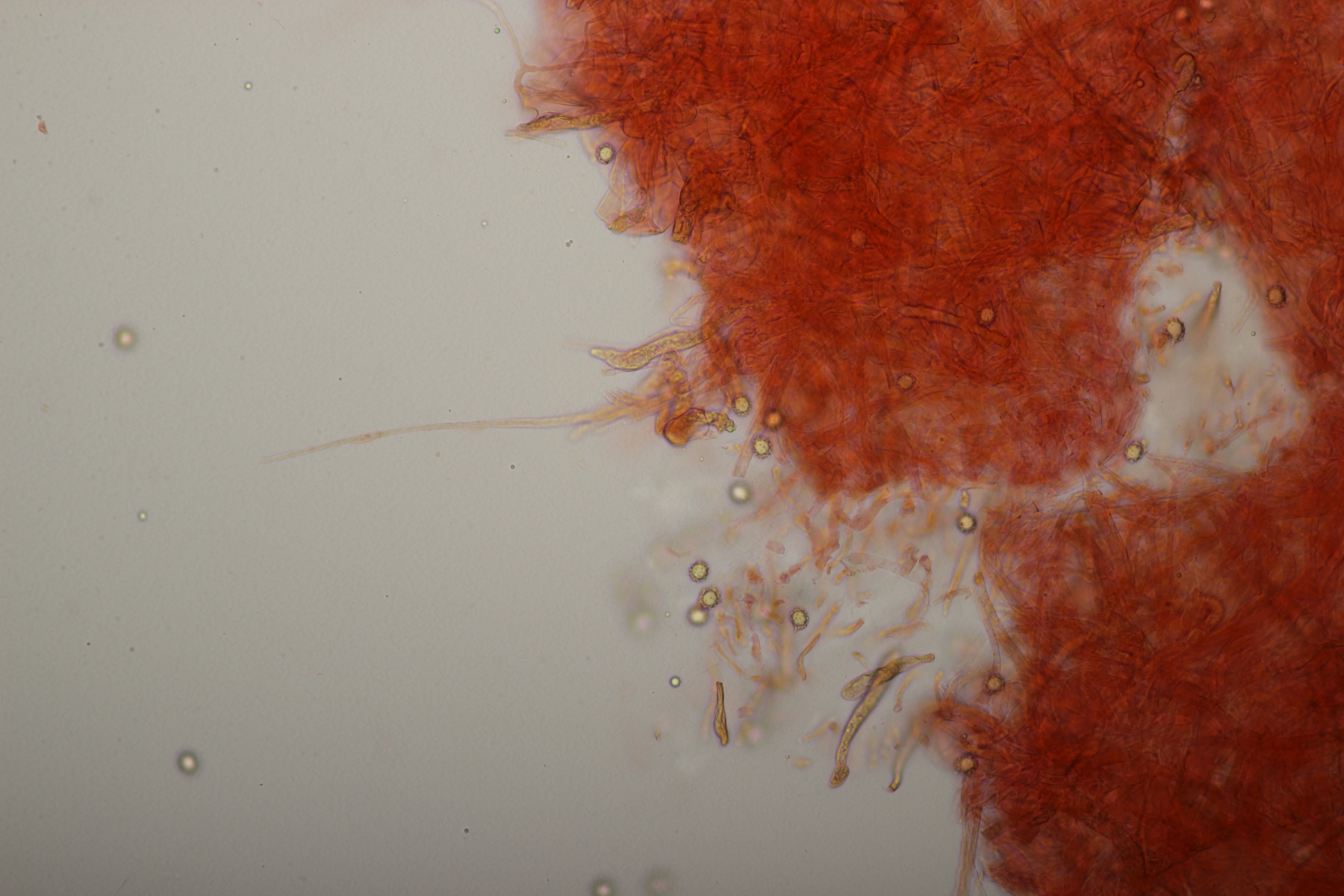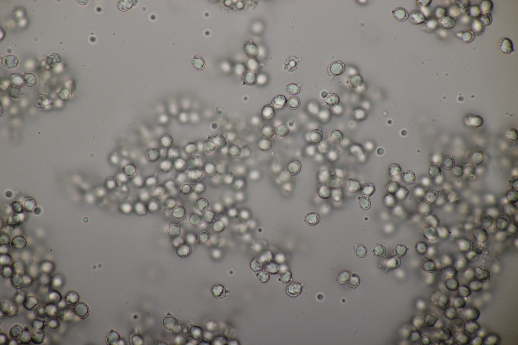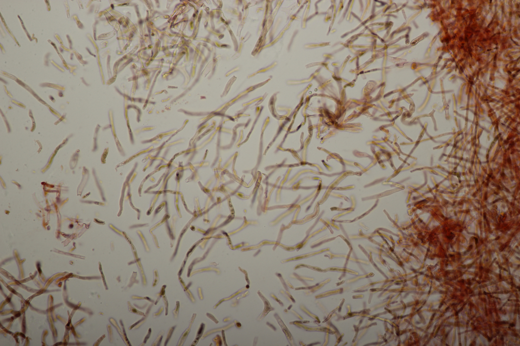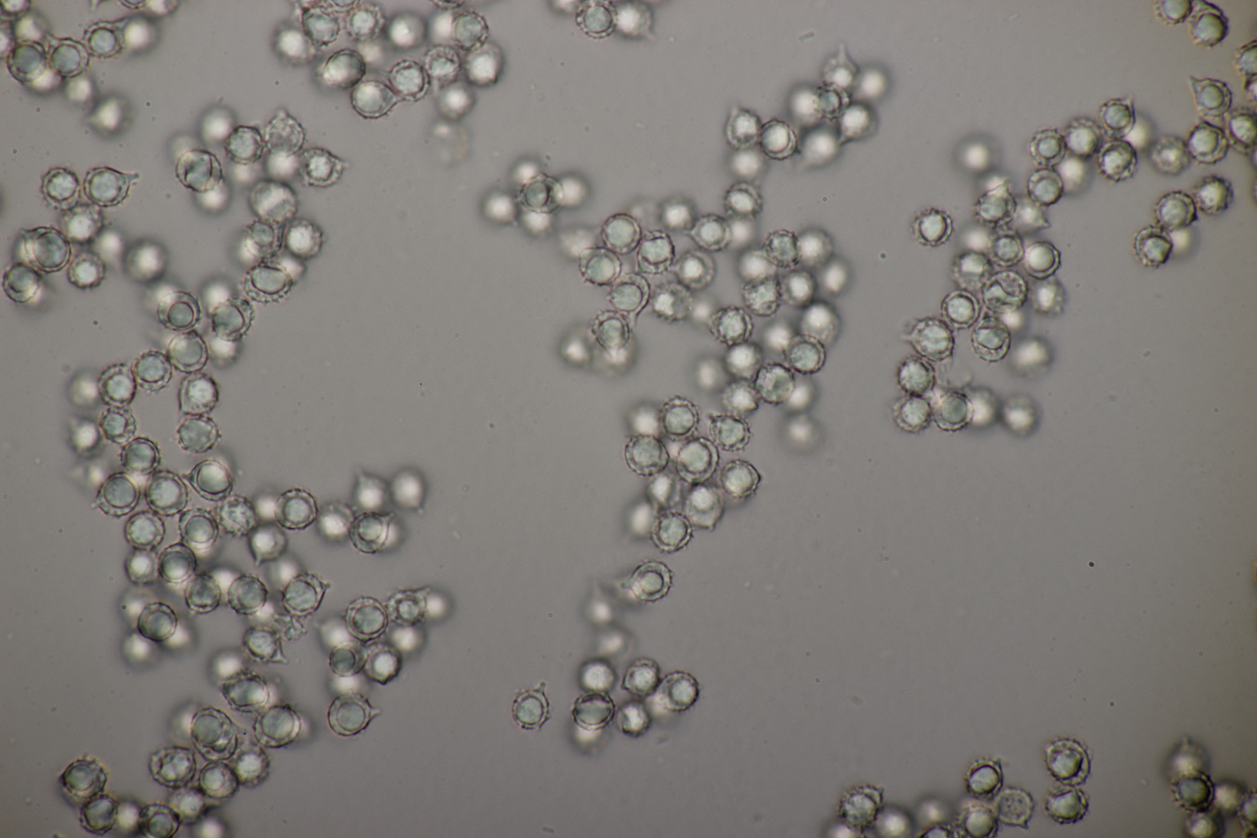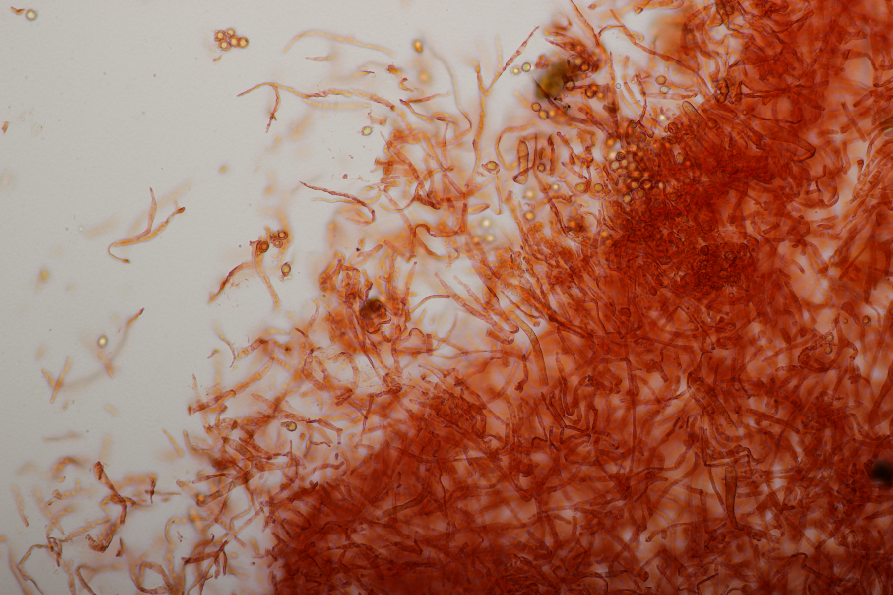 Sporengröße (6.6 +- 0.6) µm x (5.5 +- 0.4) µm. Auffallend war, daß es neben einigen sehr großen Sporen auch einige sehr kleine Sporen gab (Länge von 5.9 bis 8.0 µm, Breite von 4.9 bis 6.1 µm), entsprechend die recht große Standardabweichung
