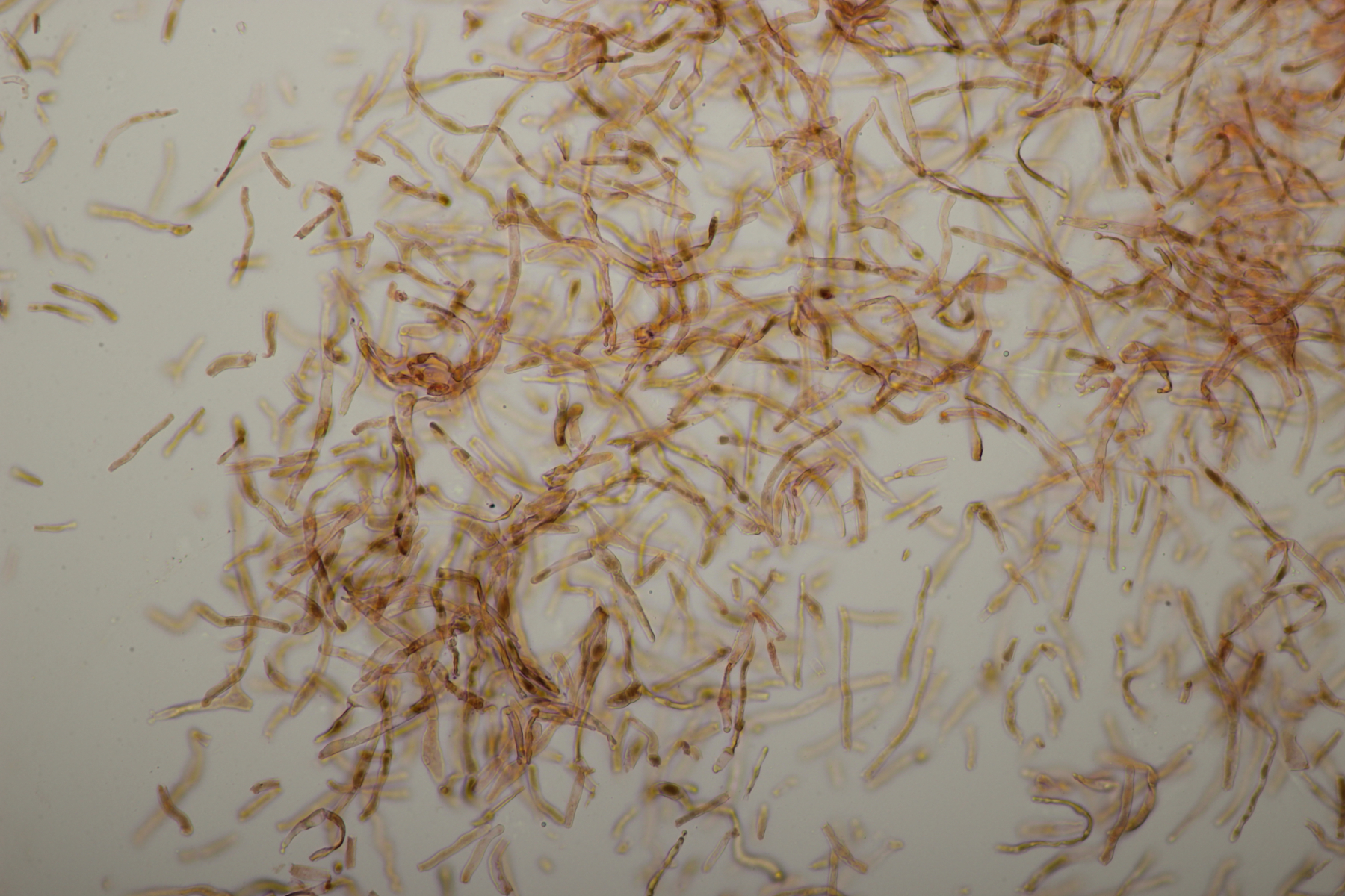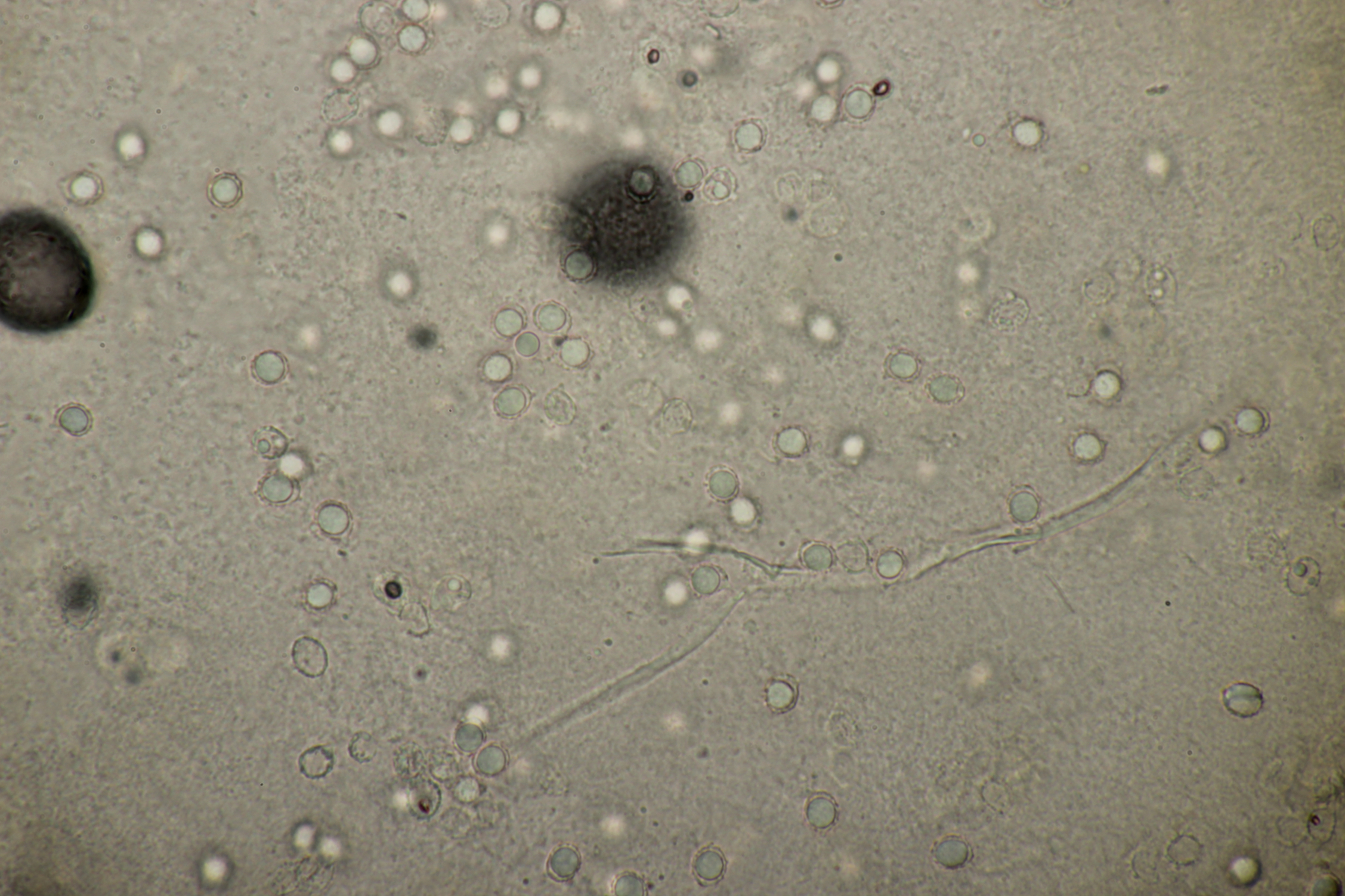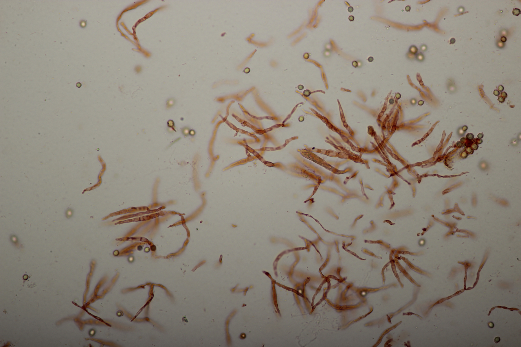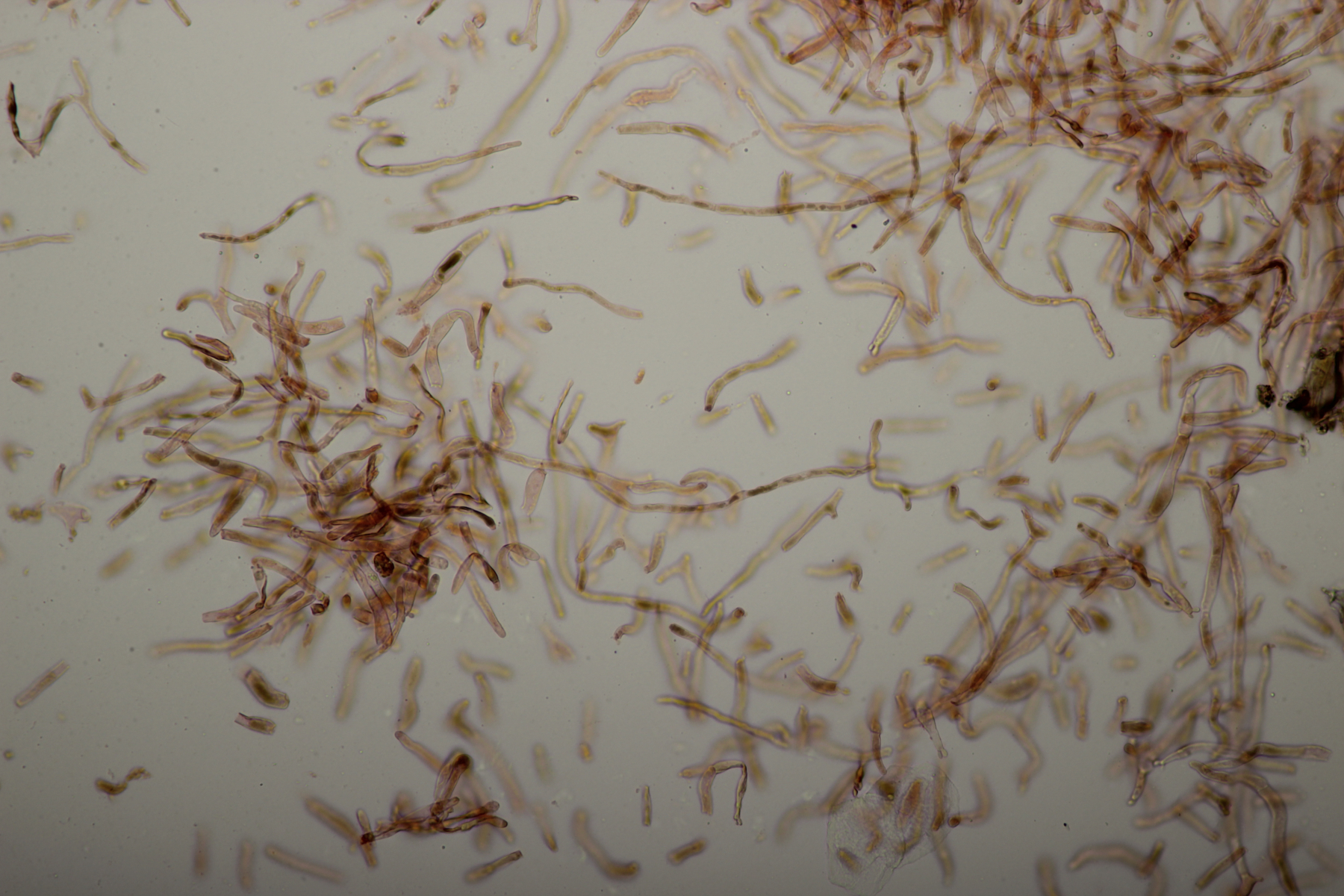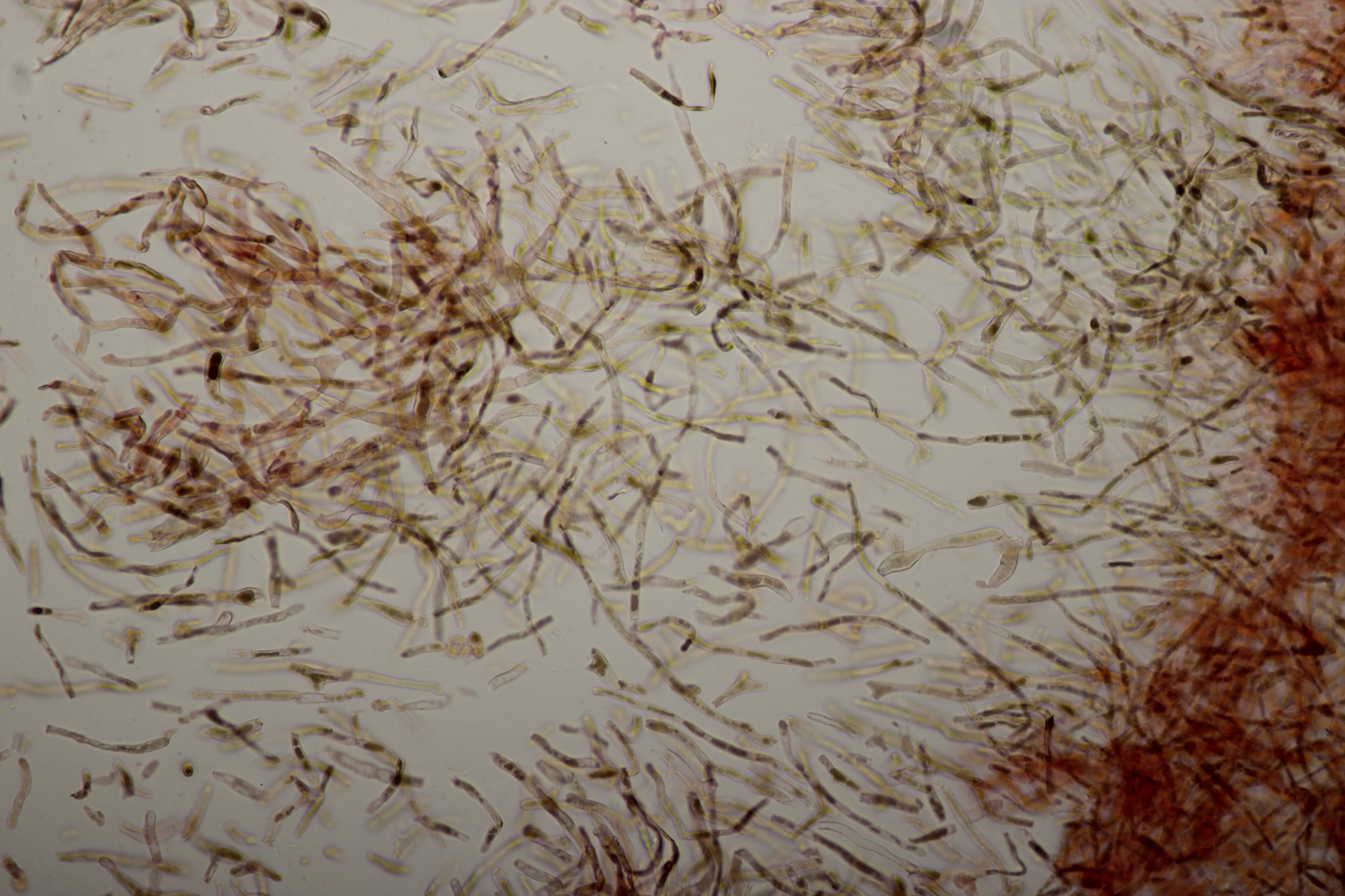Sporengröße (6.6 +- 0.6) µm x (5.5 +- 0.4) µm. Auffallend war, daß es neben einigen sehr großen Sporen auch einige sehr kleine Sporen gab (Länge von 5.9 bis 8.0 µm, Breite von 4.9 bis 6.1 µm), entsprechend die recht große Standardabweichung