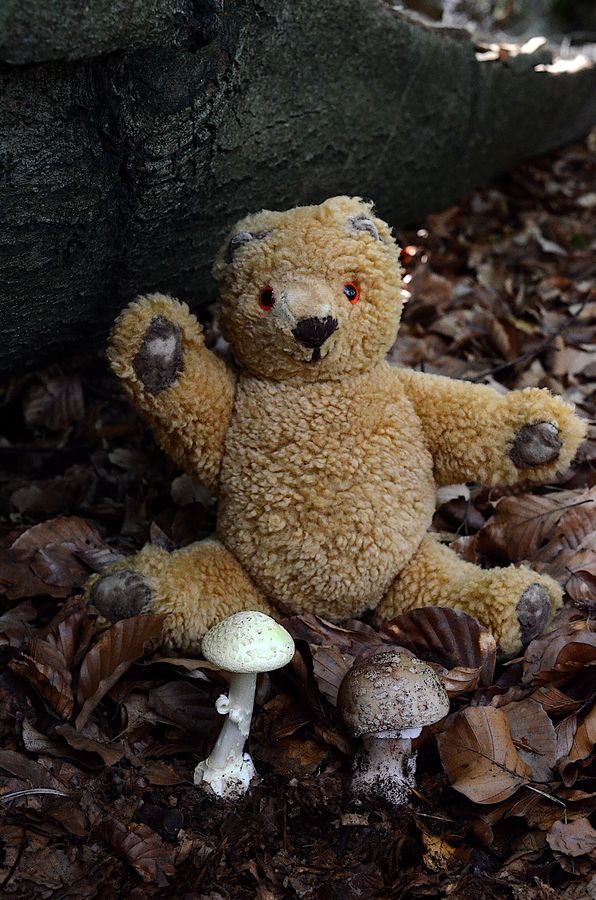 Hoffen wir mal auf baldigen, ausgiebigen Regen, auf daß wir Theo zwischen lauter Pilzen im Paddington - Outfit (gelber Südwester und Regenmantel) sehen können.