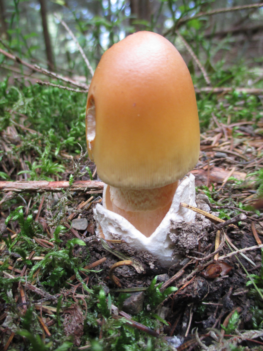 Frisch geschlüpft, ein Scheidenstreifling, wahrscheinlich Amanita crocea.