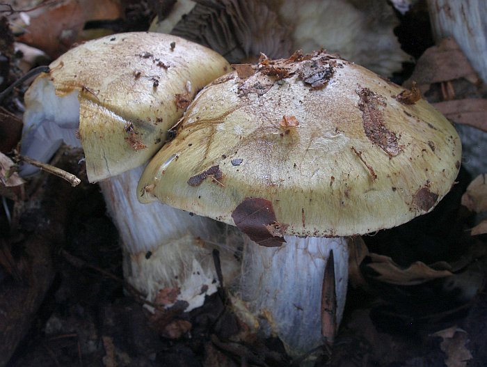 Hut: warm-olivgrün, deutlich radial faserig eingewachsen, am nächsten Tag mit leicht gold-kupferfarbenem Beiton. Hutrand wellig, lange eingerollt. Stiel: dunkel violett, am nächsten Tag weisslich ausgeblasst, metallisch glänzend, mit gerandeter Knolle (beim älteren Exemplar weniger ausgeprägt), Knollenrand (Velum?) gelb-ockerlich. Fleisch: violett, in Stielbasis und Hut weisslich-hellocker. Lamellen: angewachsen (nicht ausgebuchtet, allenfalls mit Zähnchen), relativ eng stehend, tief blau-violett (auch am Folgetag Richtung Hutrand noch erkennbar), dann Milchkaffee -farben, schartig. Geruch: schwach, eher angenehm süsslich. KOH: Fleisch bräunlich, HDS dunkel rötlich-braun. Sporen feinwarzig, 7 -7,6 x 4,5-4,9.