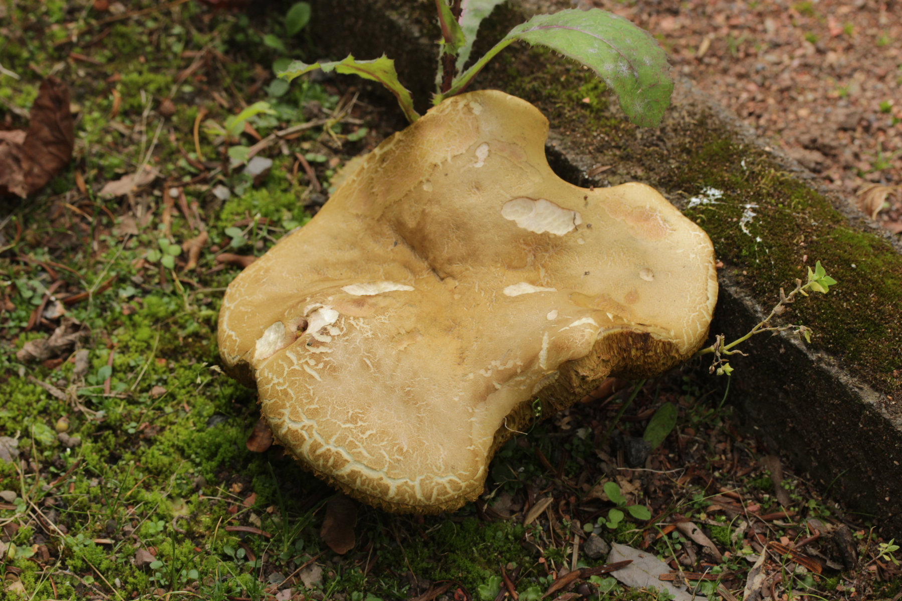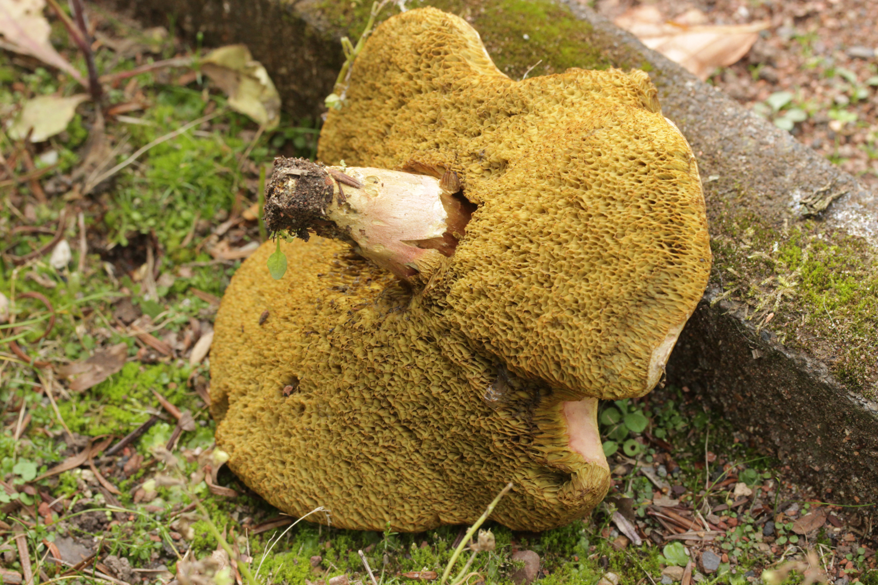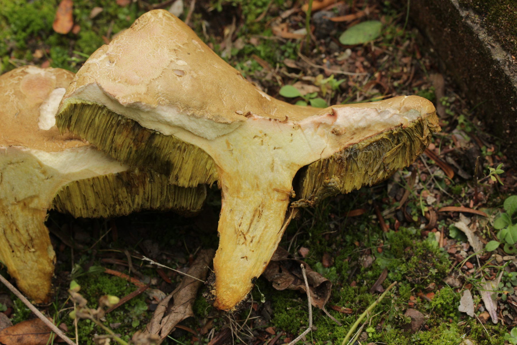 2. Hier hatte ich wegen der imposanten Erscheinung erst an Caloboletus radicans gedacht, aber wenn man genau hinschaut (an dieser Stelle einen Dank an Björn) erkennt man rote Pünktchen im Stiel: Hortiboletus engelii. Der hat sich dann wohl vertan als er unter Eibe statt Eiche wuchs ![]()