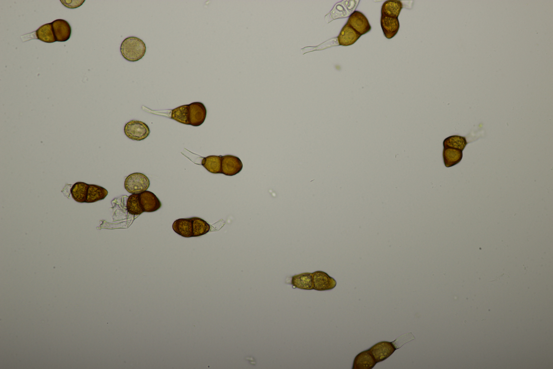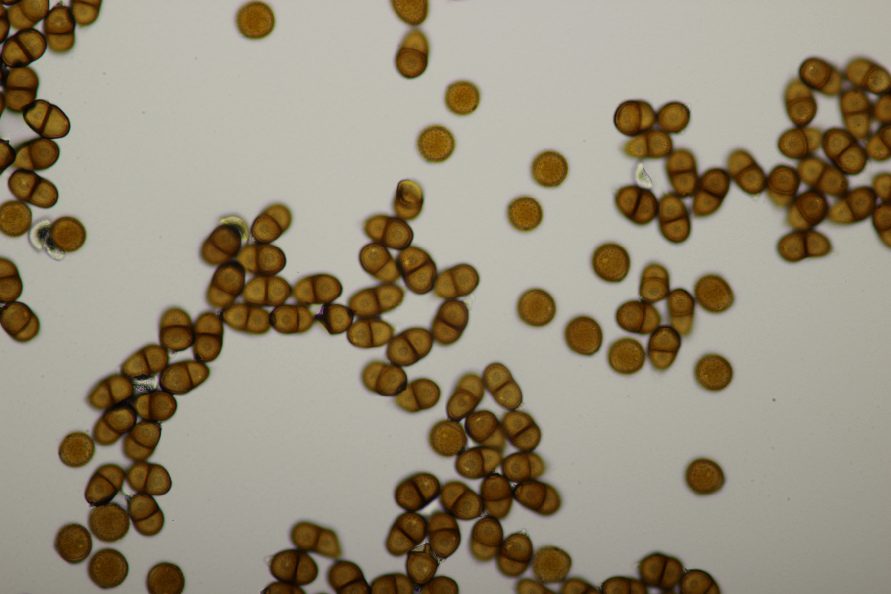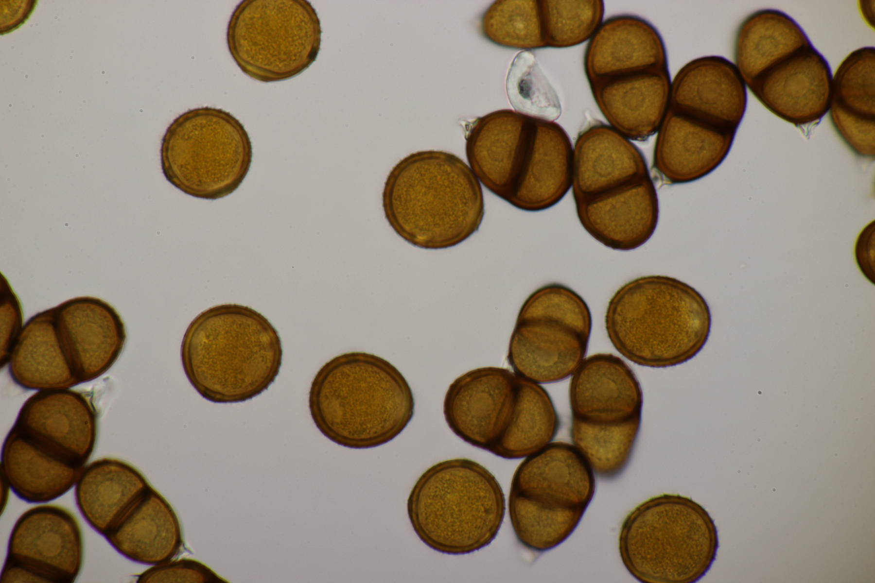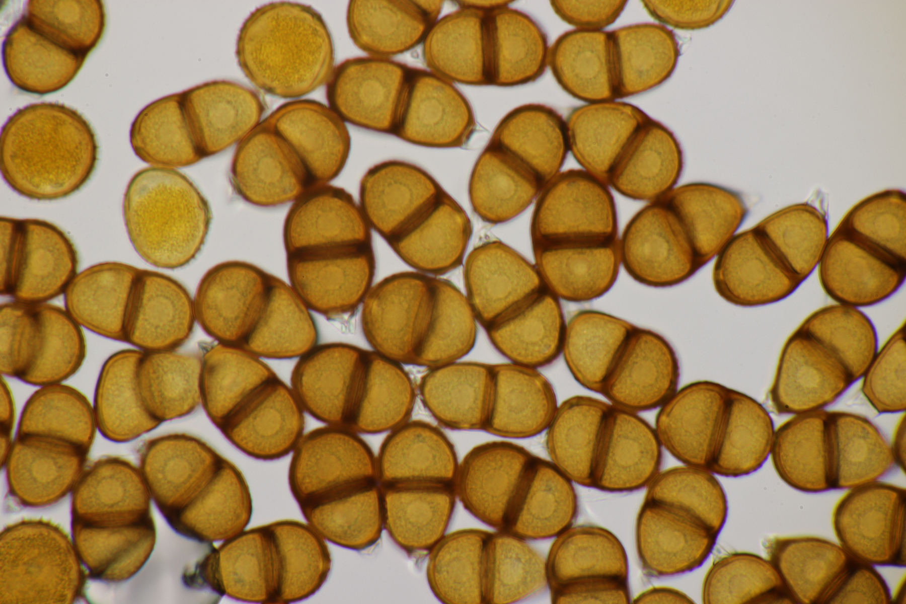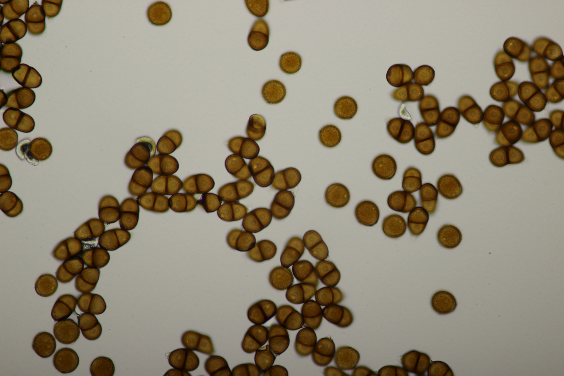 7. Puccinia artemisiella ex Artemisia vulgaris. Teliosporen 33-44 µm lang, im Mittel 38 µm.