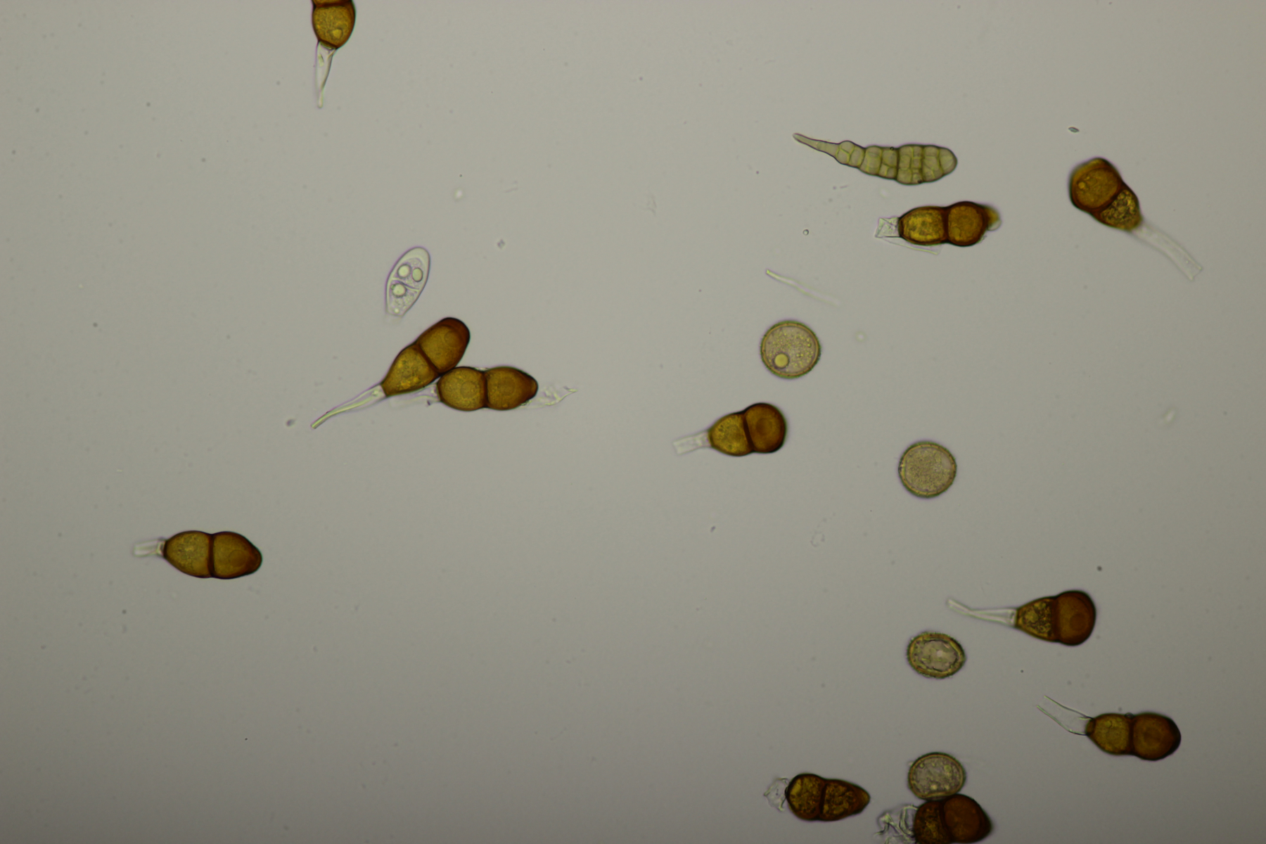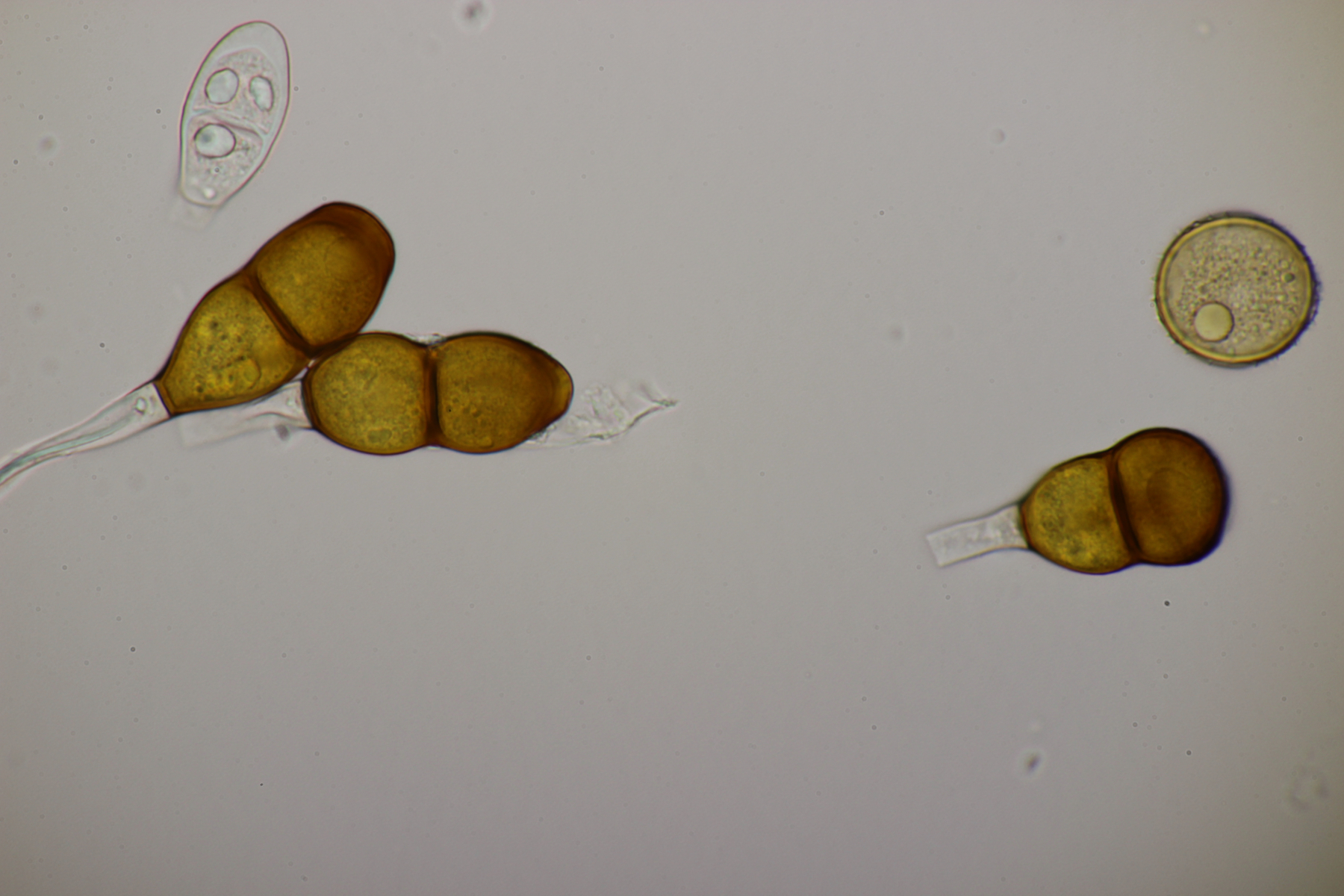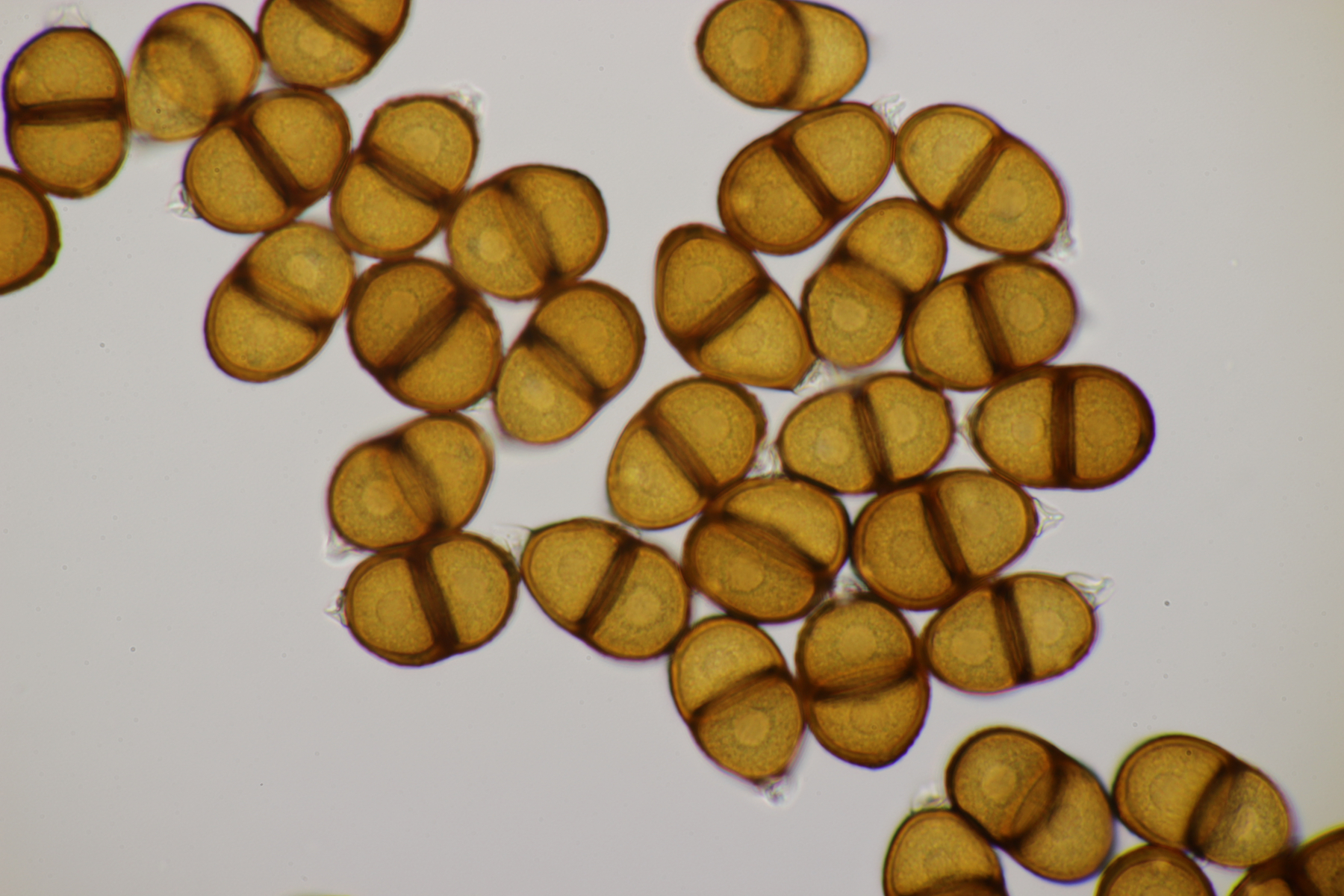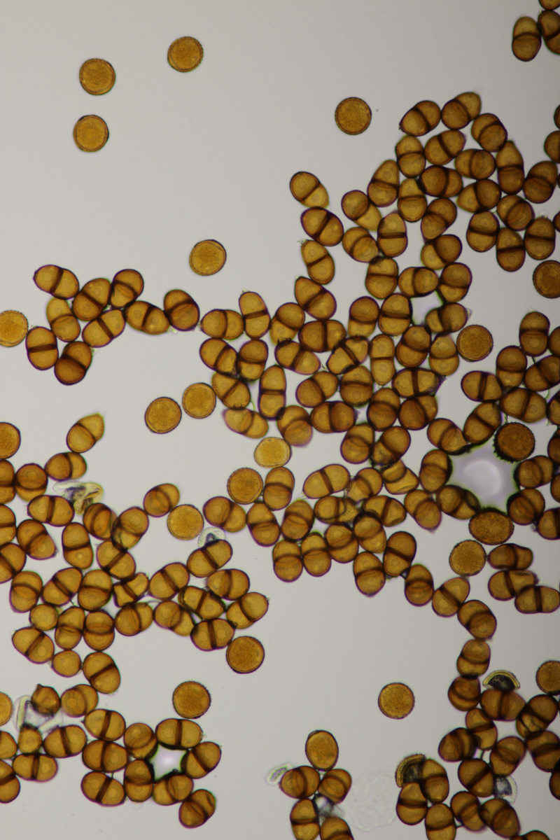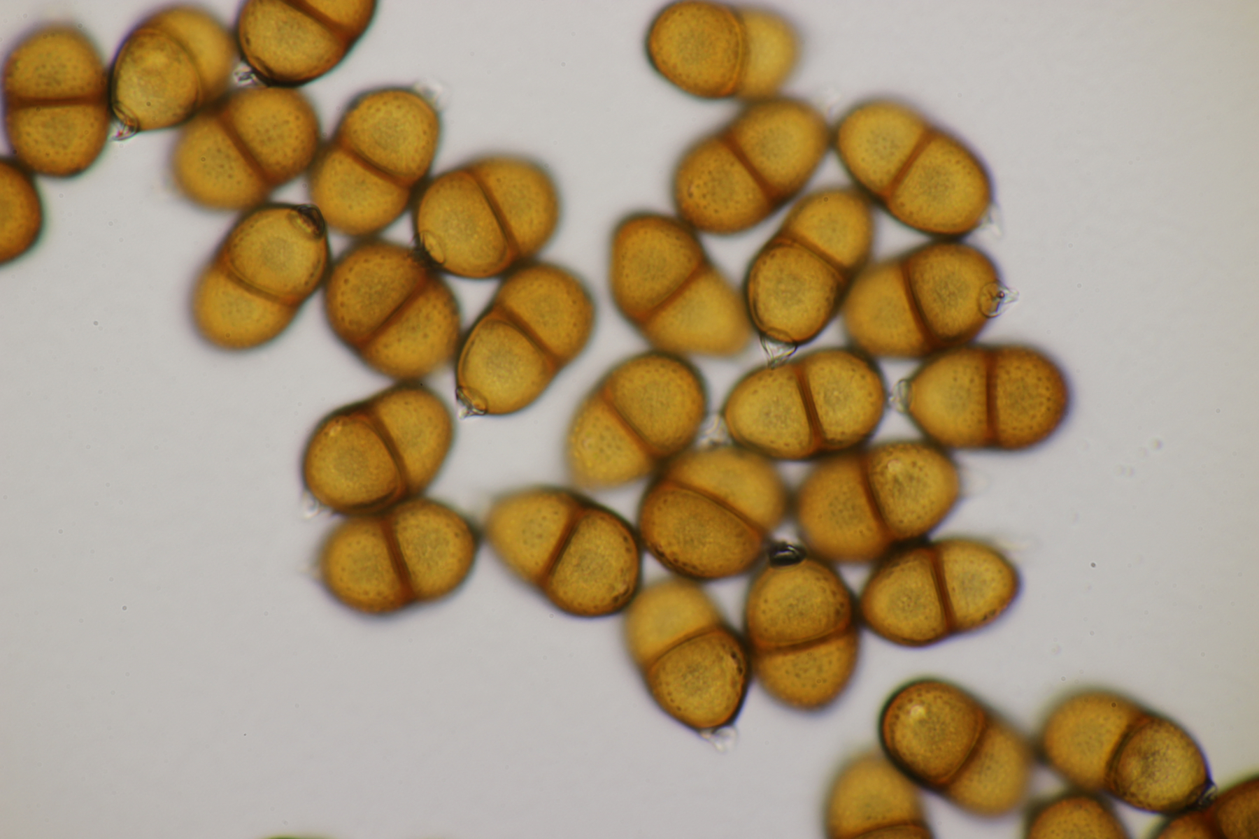 7. Puccinia artemisiella ex Artemisia vulgaris. Teliosporen 33-44 µm lang, im Mittel 38 µm.