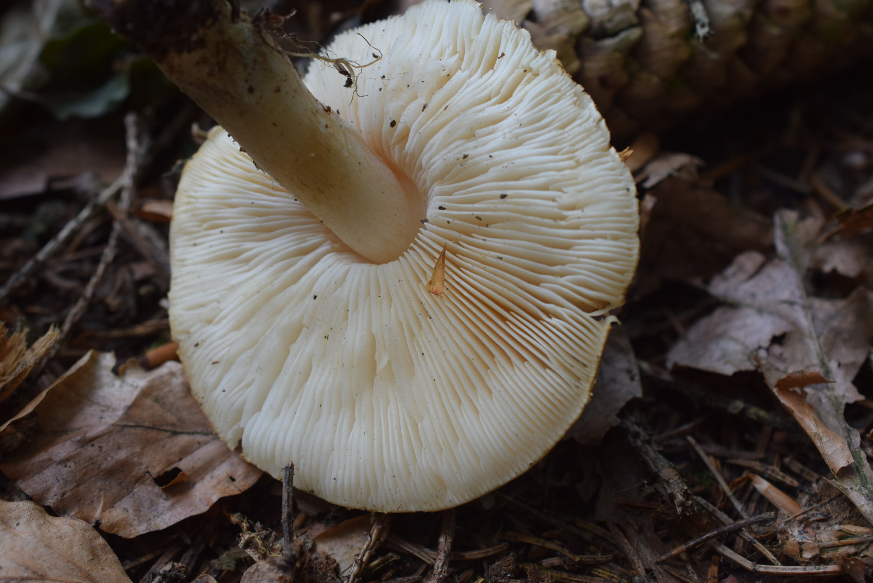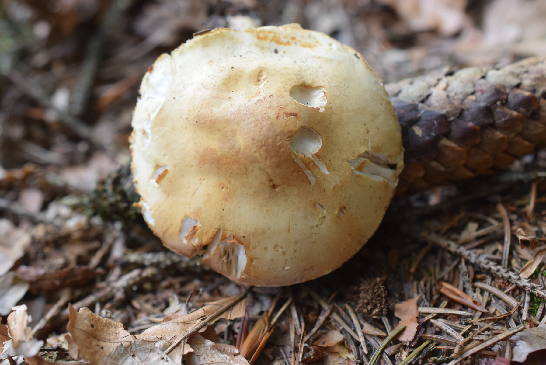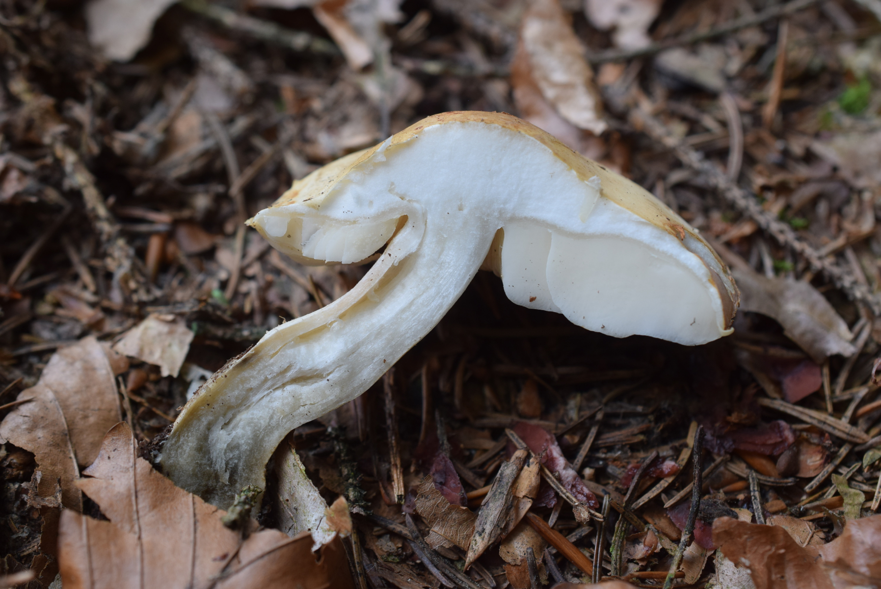 Sporenpulver weis , Hut nach Pflücken (nach paar Stunde) von hellgelb Farbe hat an Ockergelb verfärbt