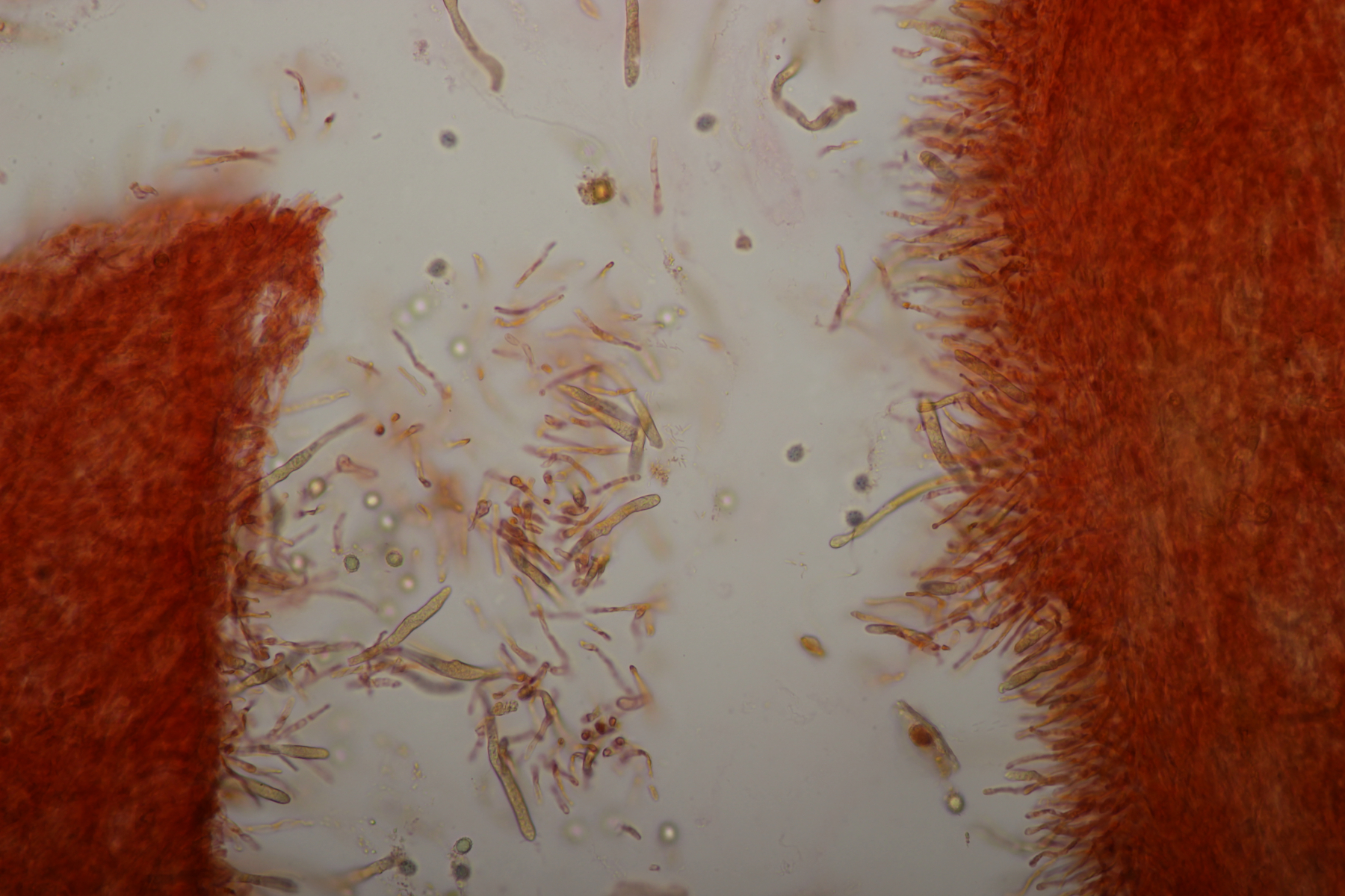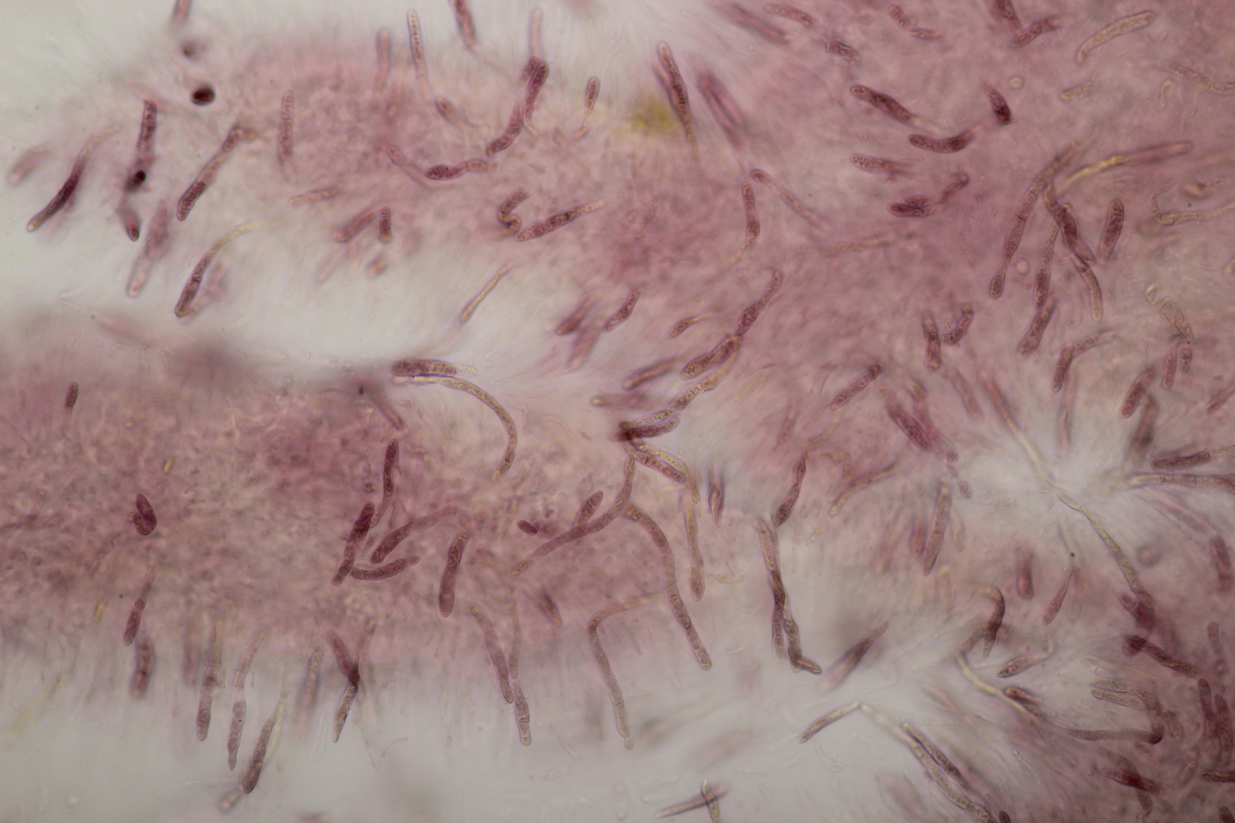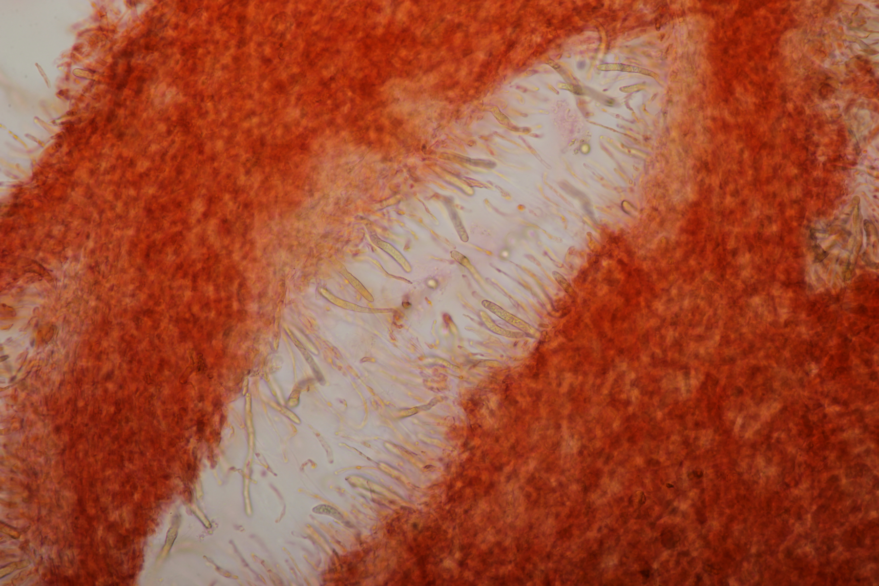 Hier hatte Karl anhand der Makrobilder bei FB R. claroflava ins Spiel gebracht. Das scheint von der Sporenpulverfarbe her nicht ganz zu passen (wobei ich nur wenig Pulver hatte und die Farbe da also mit einer gewissen Unsicherheit behaftet ist). Was aber am meisten irritiert ist die Huthaut. Die sieht irgendwie ganz anders aus als alle Russulahuthäute, die ich bis jetzt unter dem Mikro hatte.