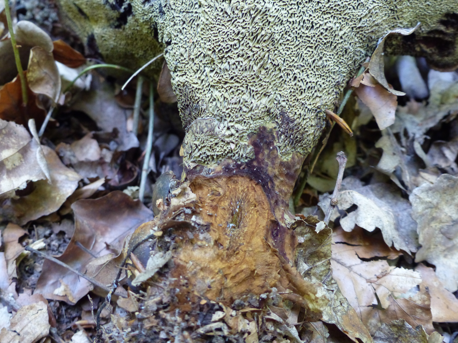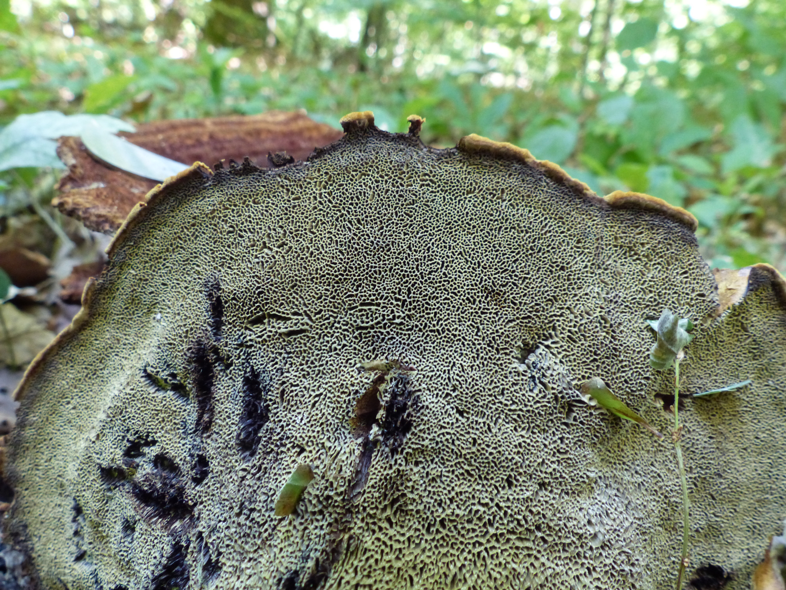 mit den grünlichen, schwärzenden Poren und dem dunkelbraunen Kontext (Hutfleisch) ist das Phaeolus schweinitzii (Braunporling).